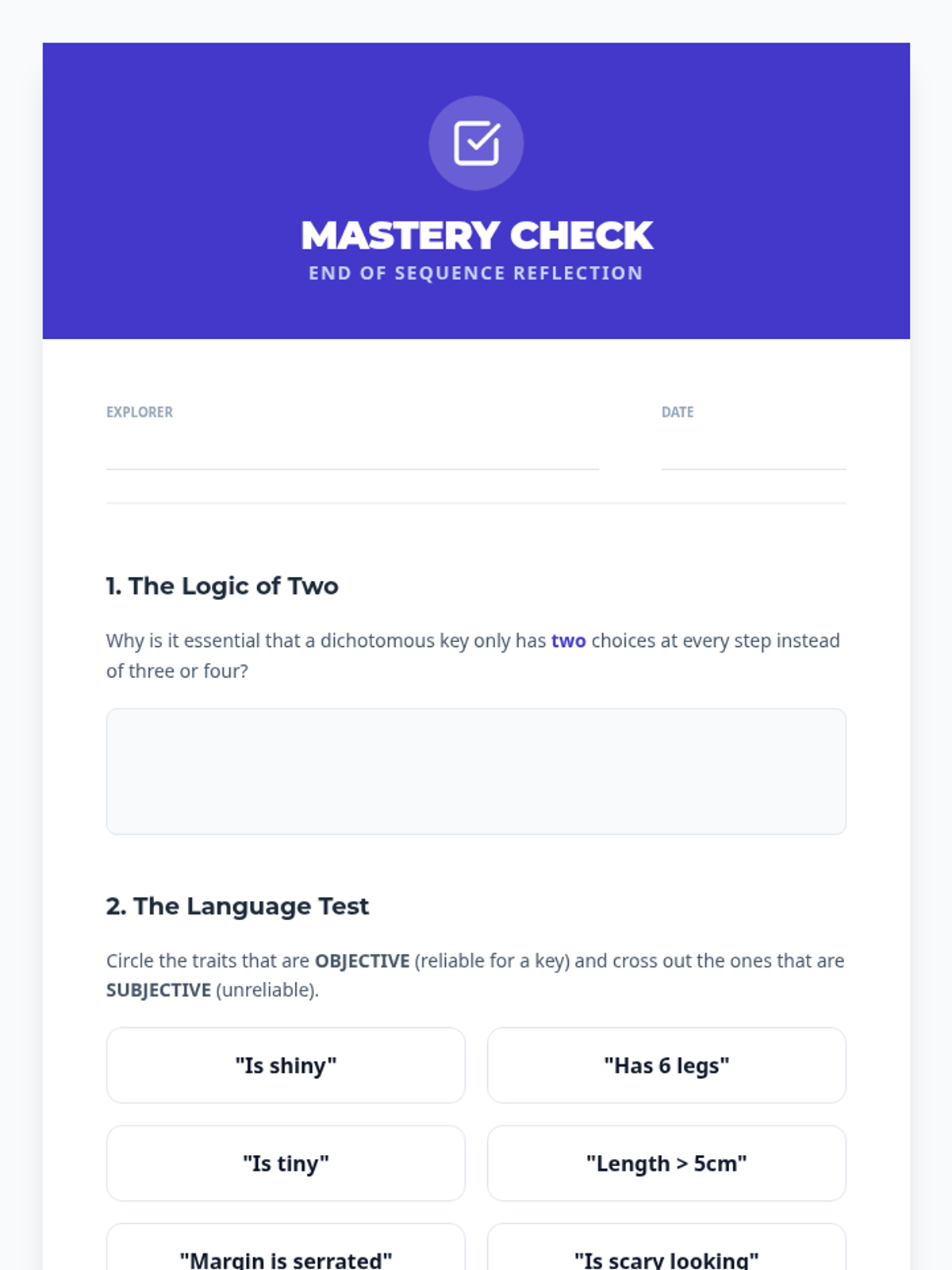 A hands-on biology sequence where students master the logic of dichotomous keys through identification challenges, vocabulary building, and technical writing projects. Students progress from simple logic puzzles to creating their own scientific identification tools.