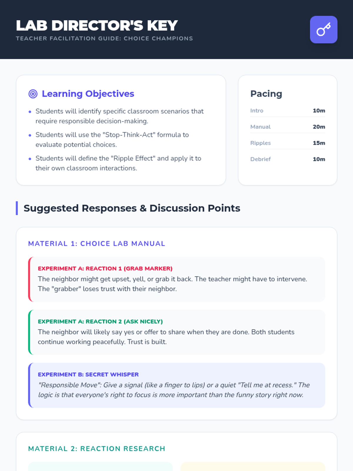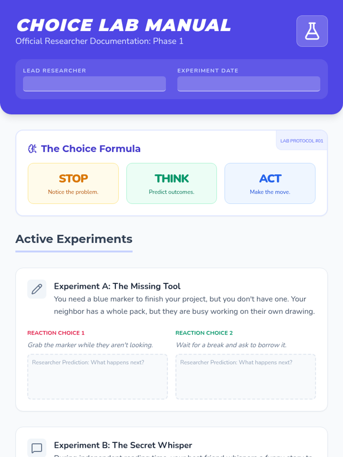 A series of materials designed to help 4th graders understand and practice responsible decision-making in the classroom using a 'Choice Lab' theme. Students act as researchers analyzing the causes and effects of their daily choices.