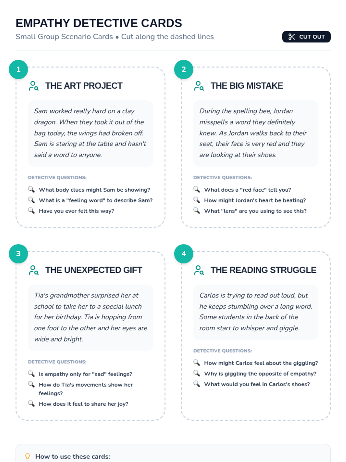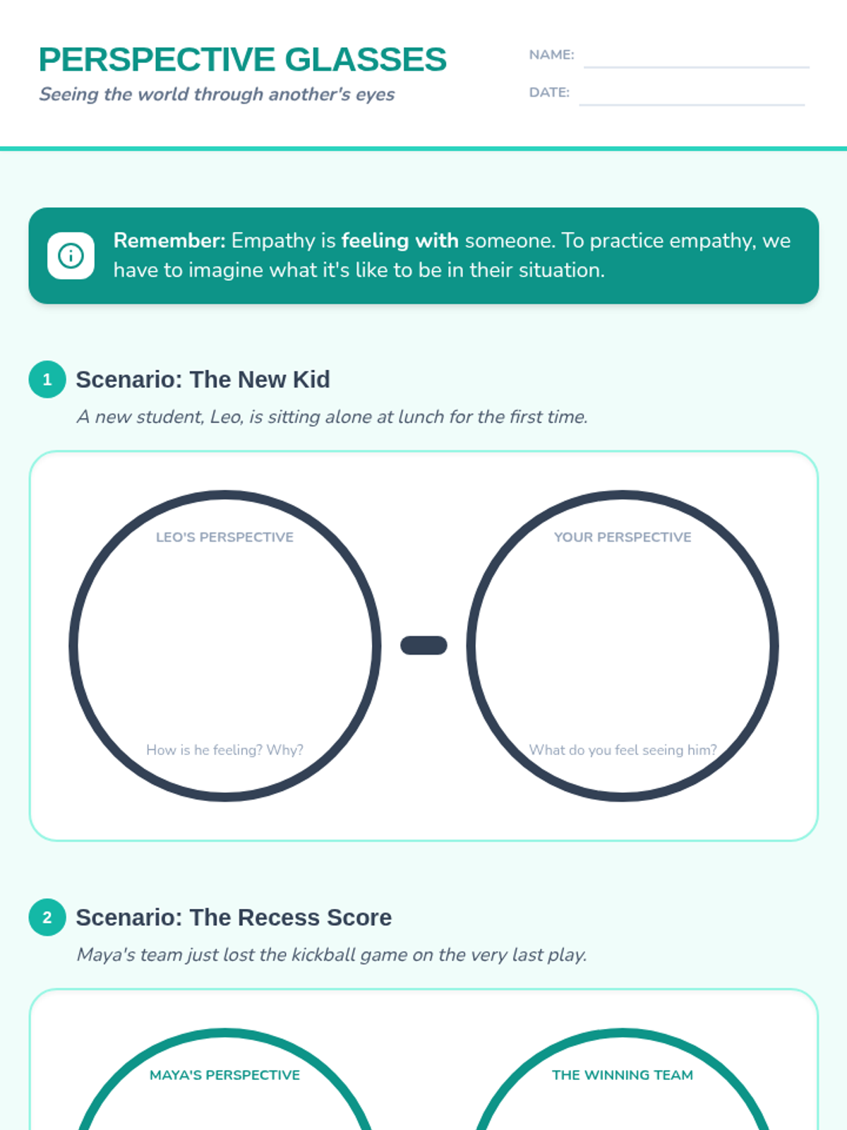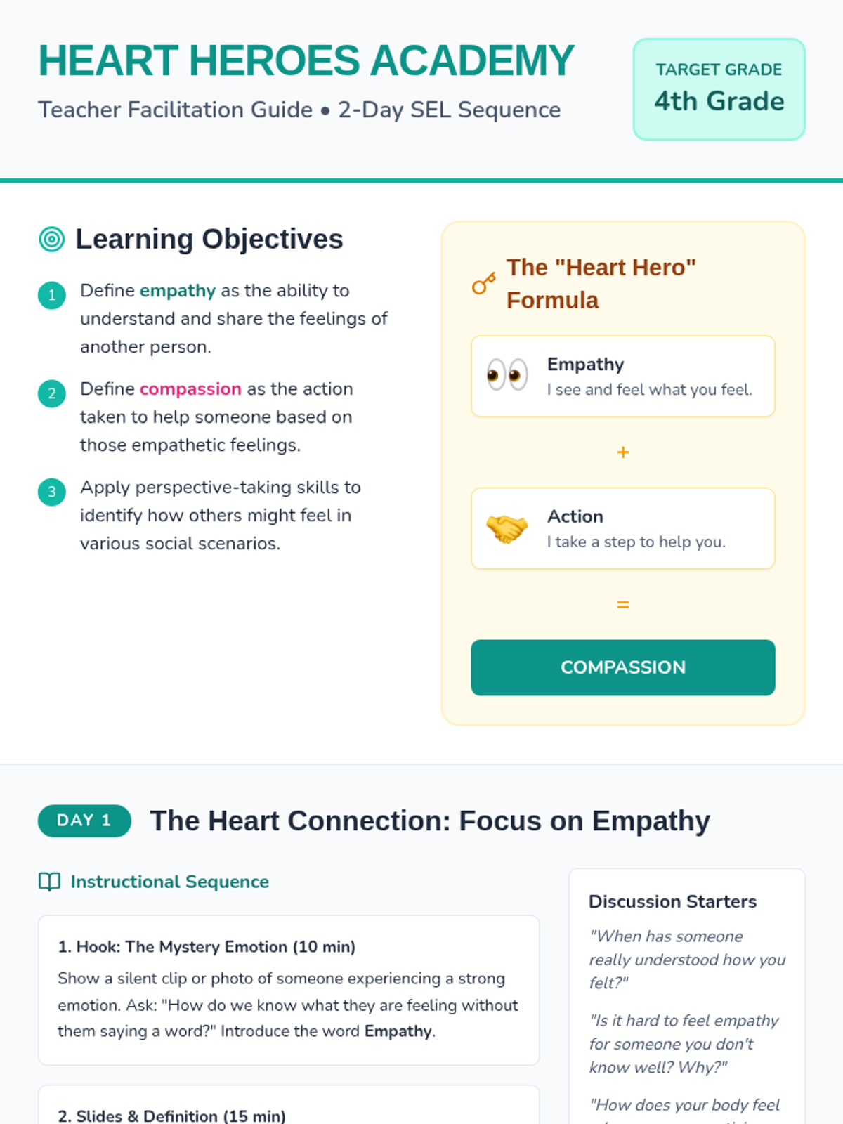 A two-day social-emotional learning sequence for 4th graders focused on defining empathy and compassion, practicing perspective-taking, and collaboratively solving real-world scenarios through kind action.