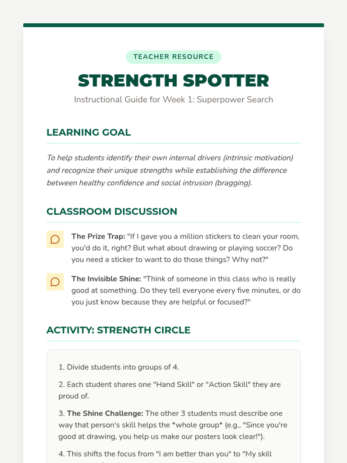 A 5-week Social-Emotional Learning curriculum for 4th graders focused on developing intrinsic motivation, building self-confidence, and fostering social awareness through the 'Spark and Shine' framework. Students learn to recognize their internal strengths while navigating social boundaries with empathy and respect.