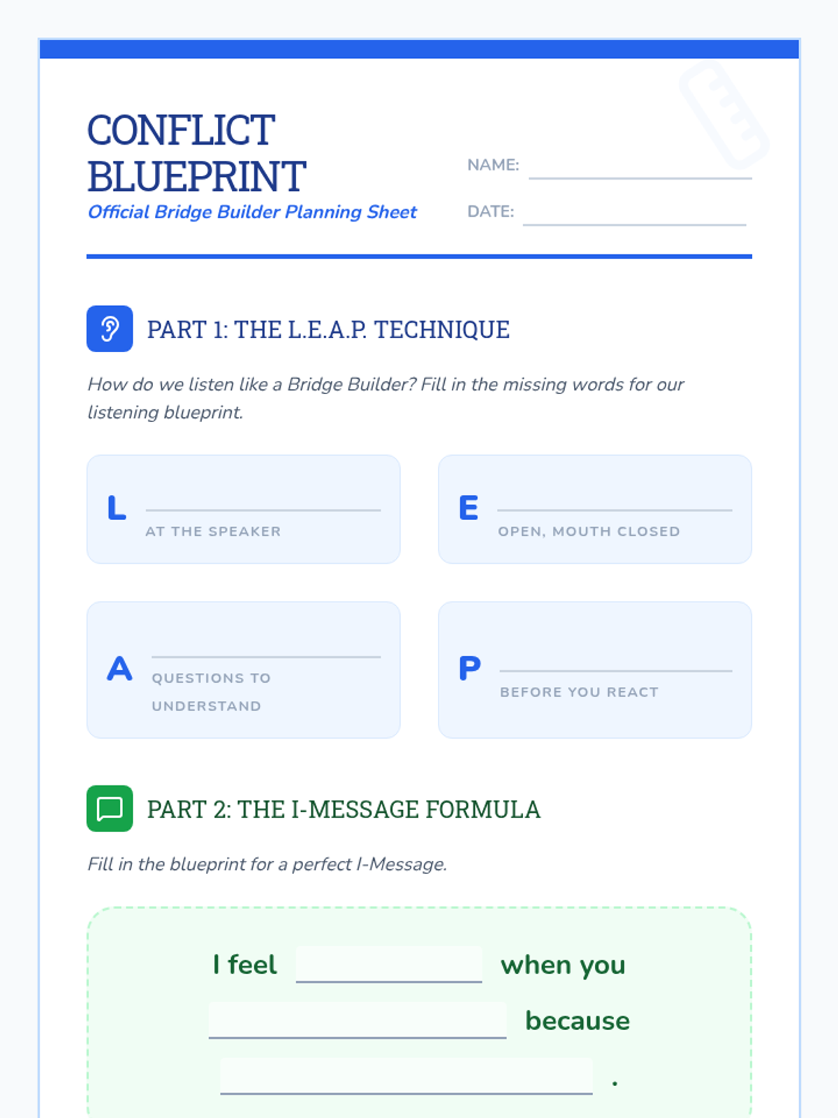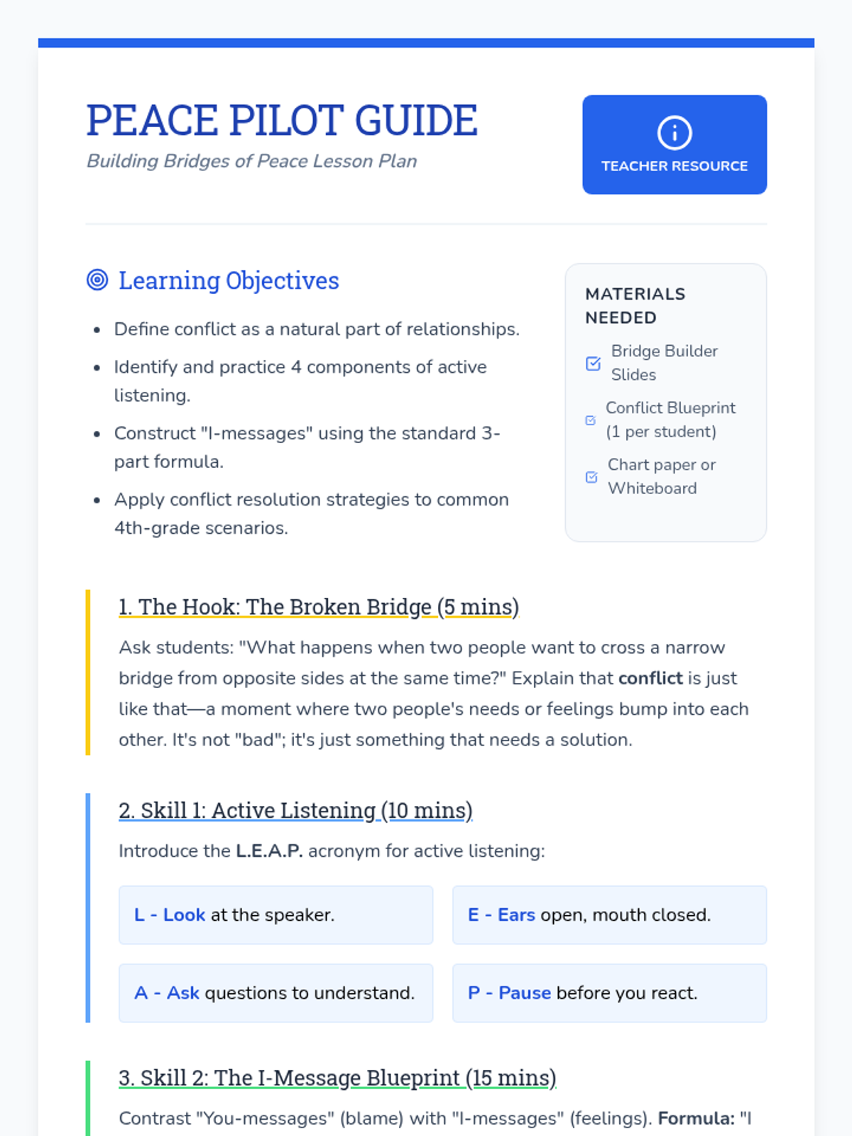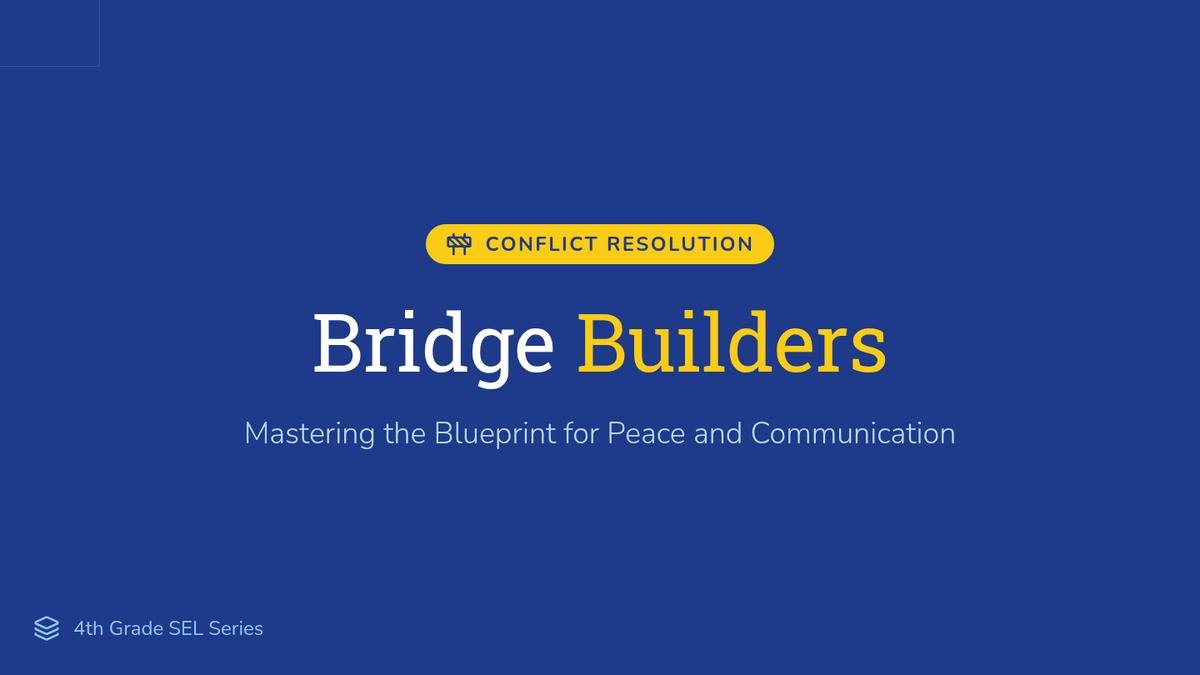 A social-emotional learning sequence focused on teaching 4th-grade students how to navigate peer conflict using I-messages and active listening skills. The sequence uses a 'Bridge Builder' theme to help students visualize communication as a way to connect across disagreements.