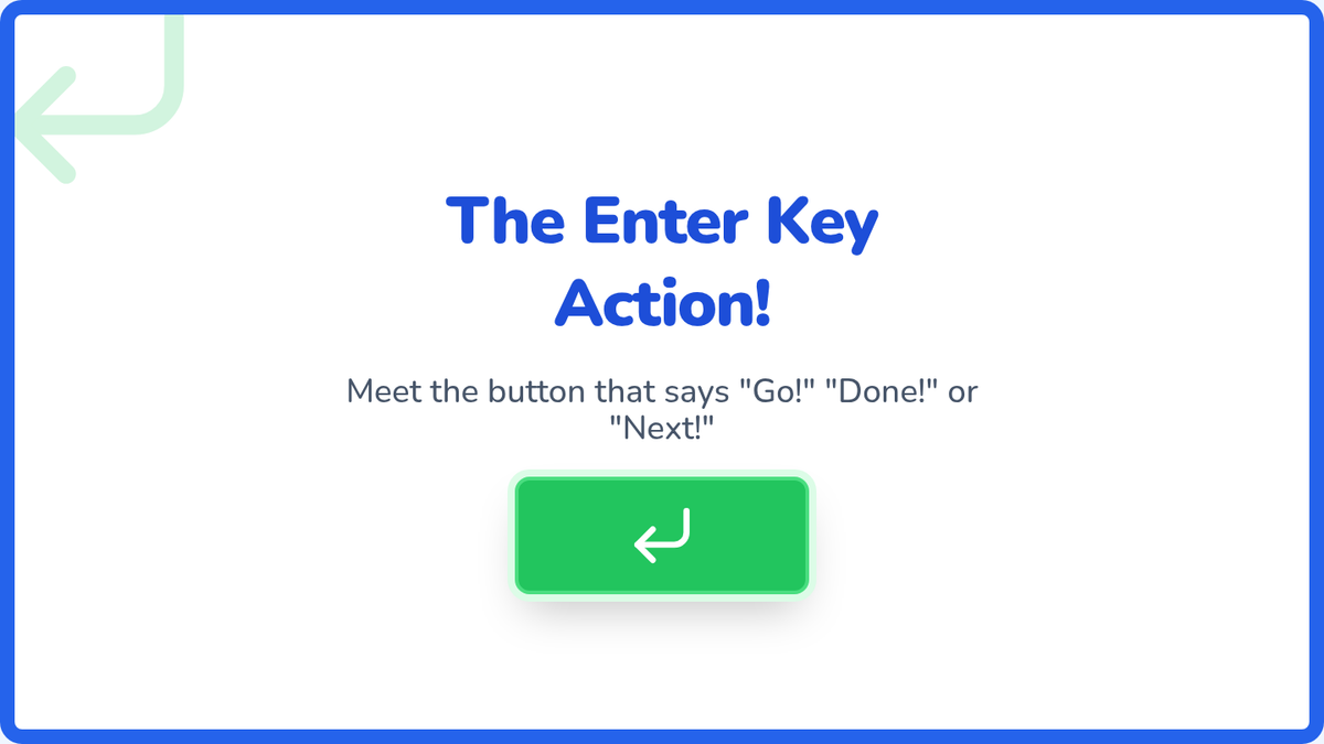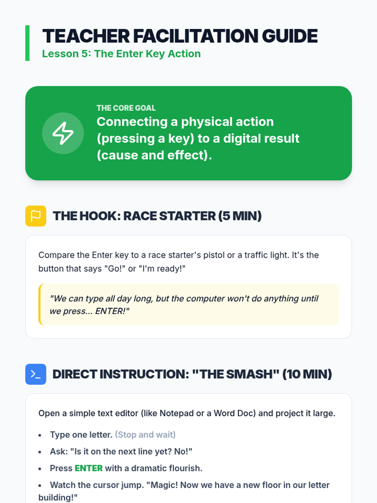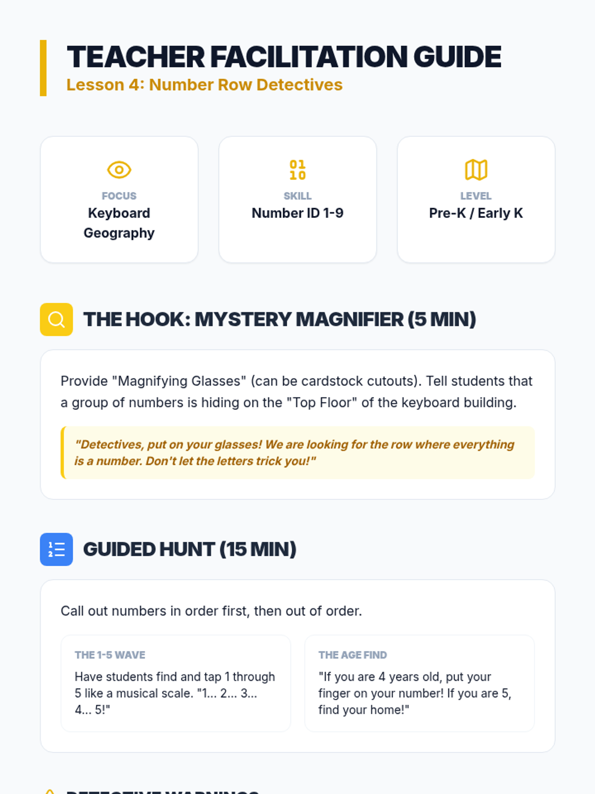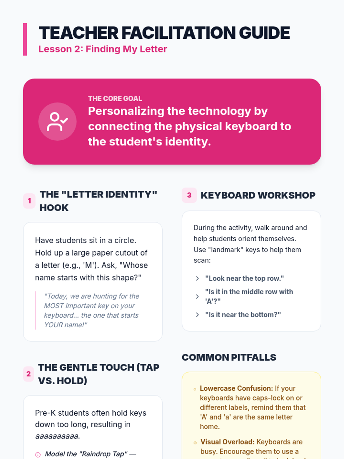 A Pre-K sequence introducing the keyboard as a tool for letters and numbers. Students learn the layout, locate their own initials, understand the space bar's function, identify numbers, and learn the 'action' of the Enter key through play and exploration.