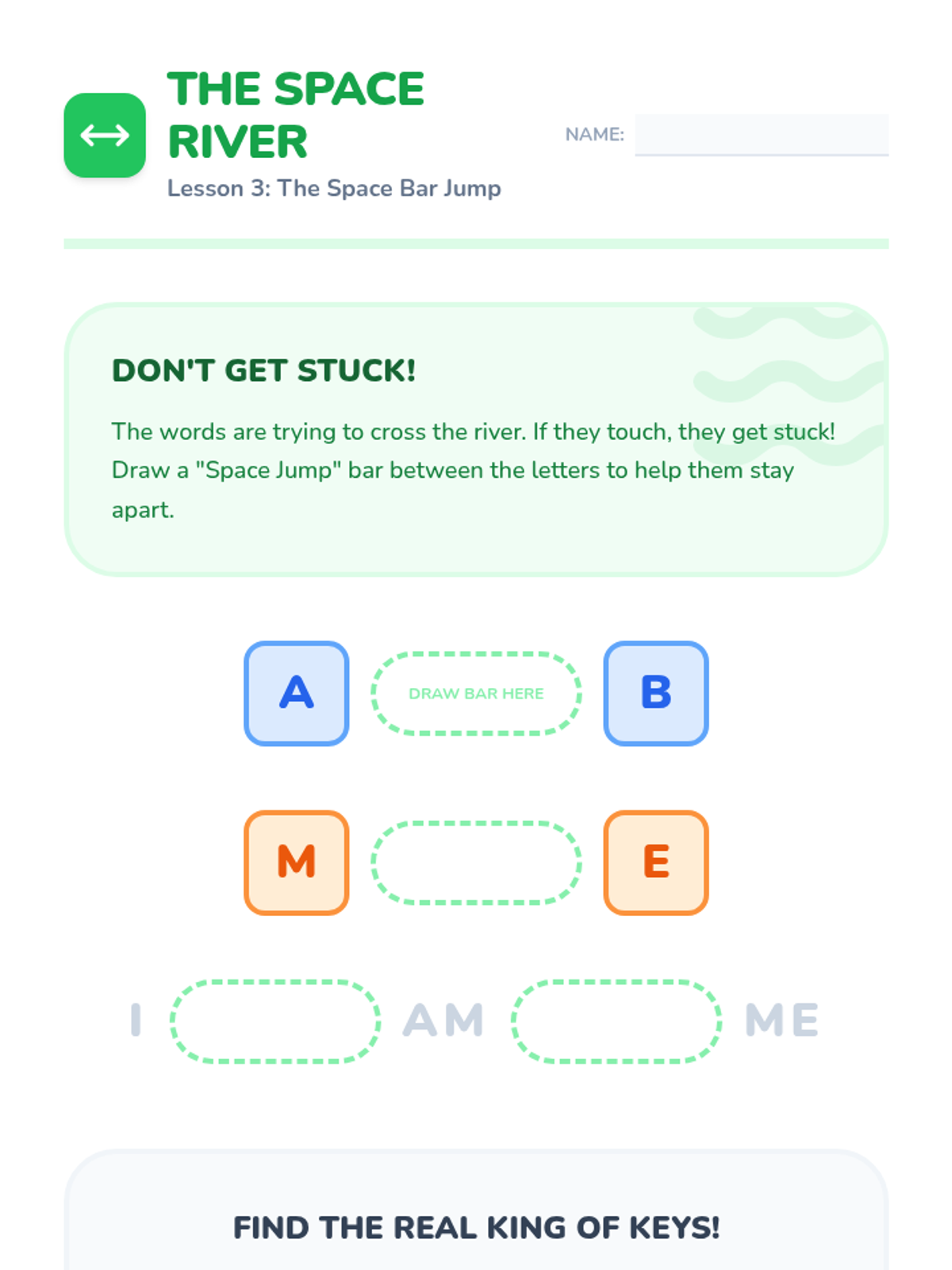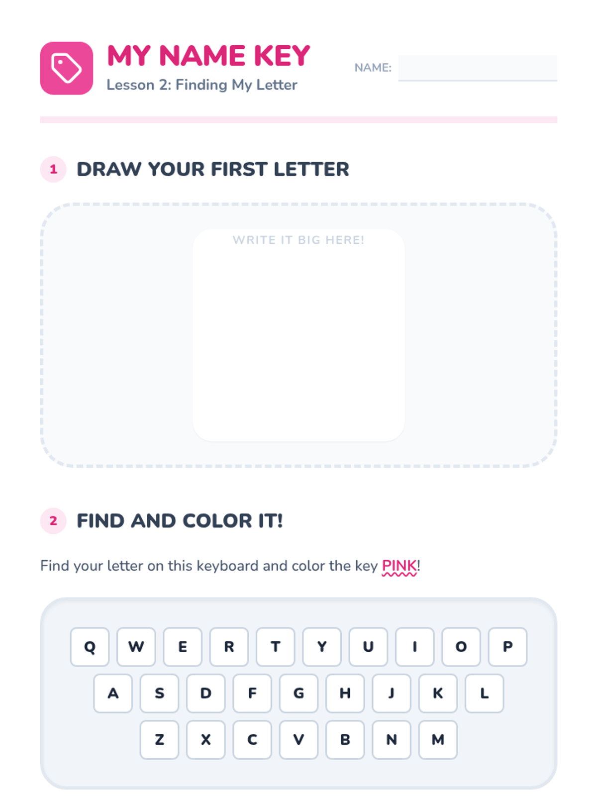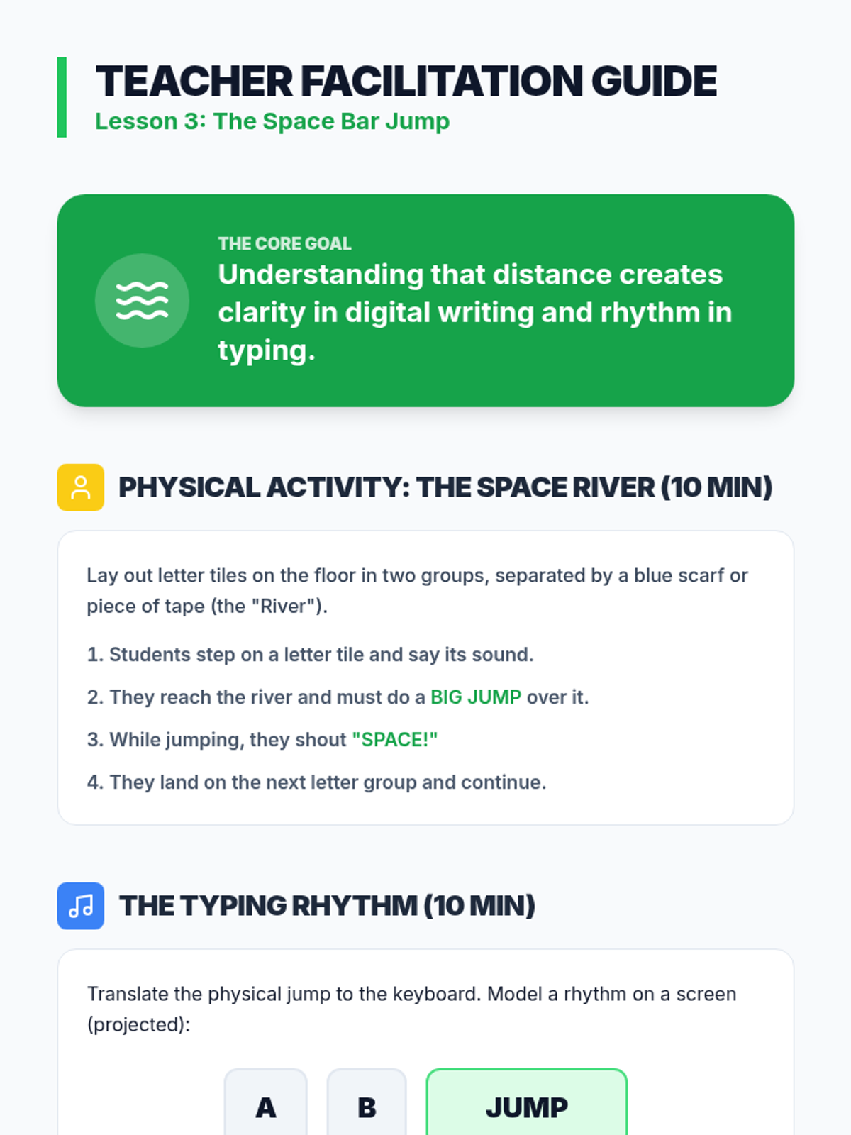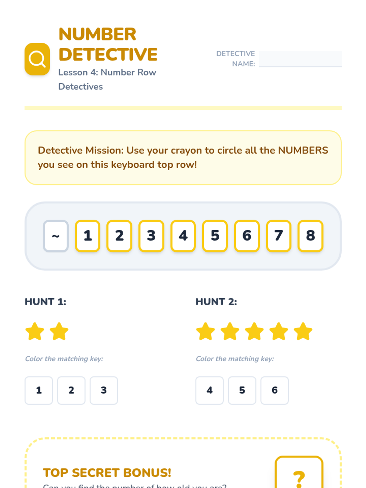A Pre-K sequence introducing the keyboard as a tool for letters and numbers. Students learn the layout, locate their own initials, understand the space bar's function, identify numbers, and learn the 'action' of the Enter key through play and exploration.