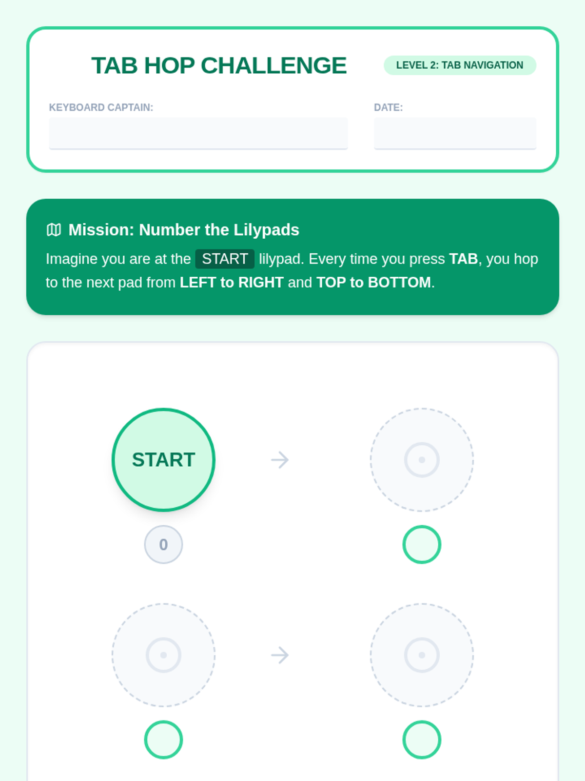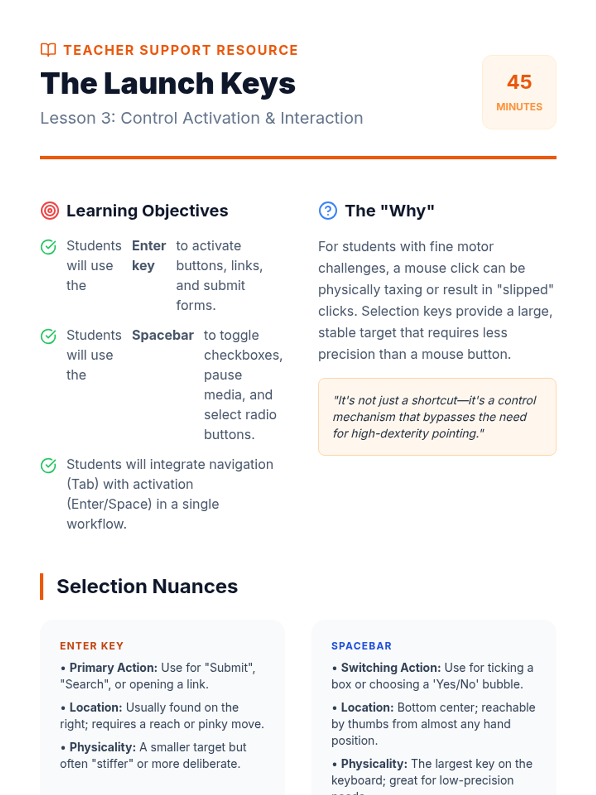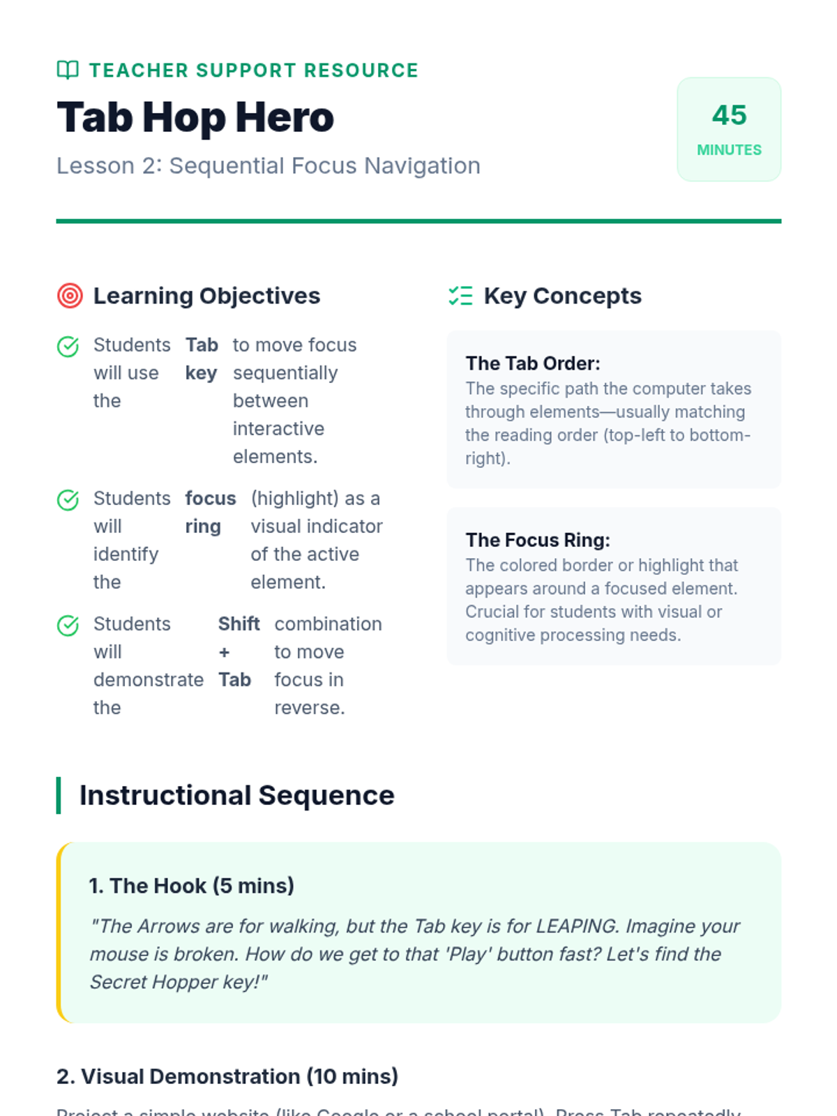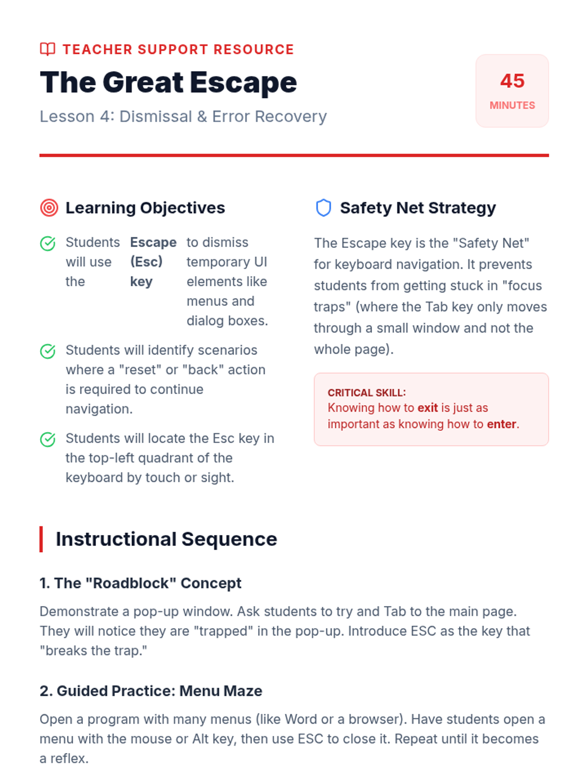 A 4th-grade sequence focused on foundational keyboard navigation skills including arrow keys, Tab, Enter/Space, and Escape keys for students requiring assistive technology support.