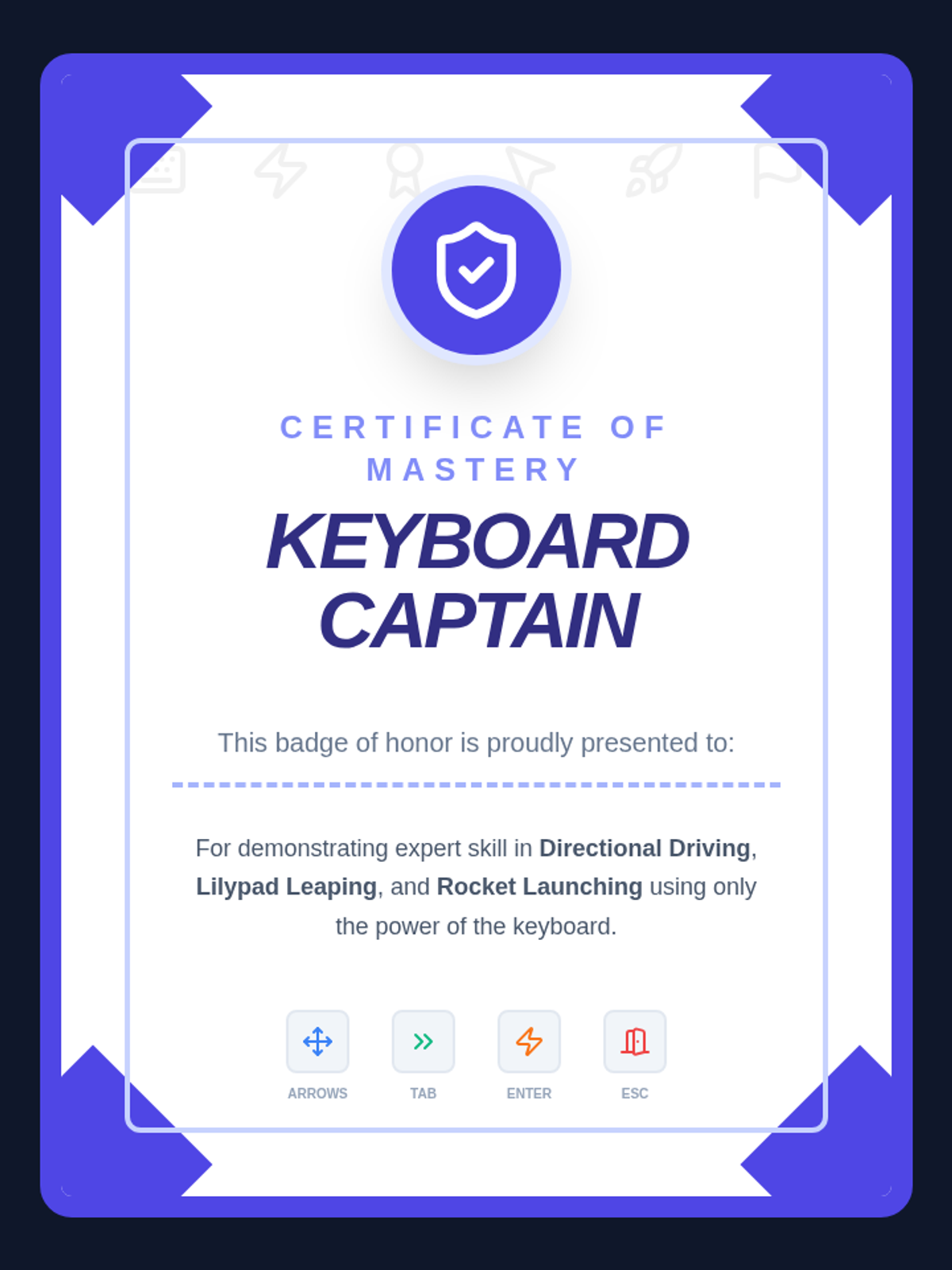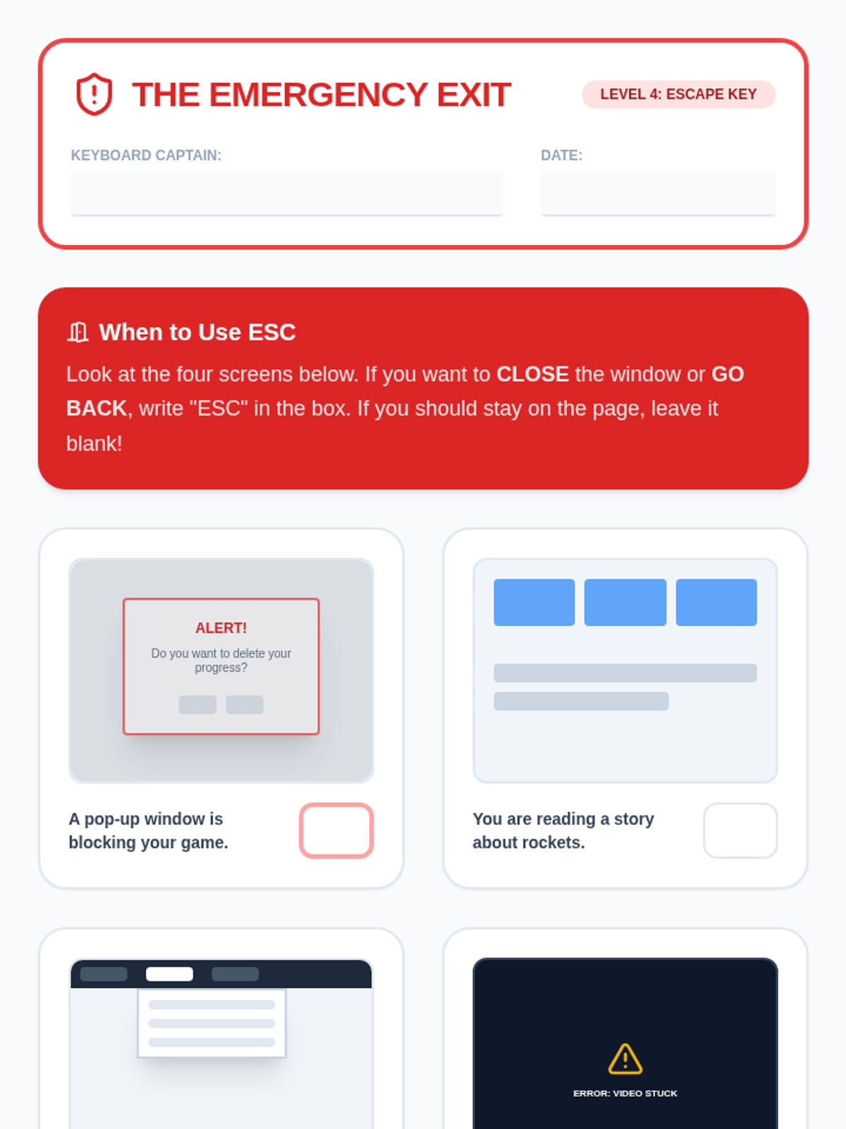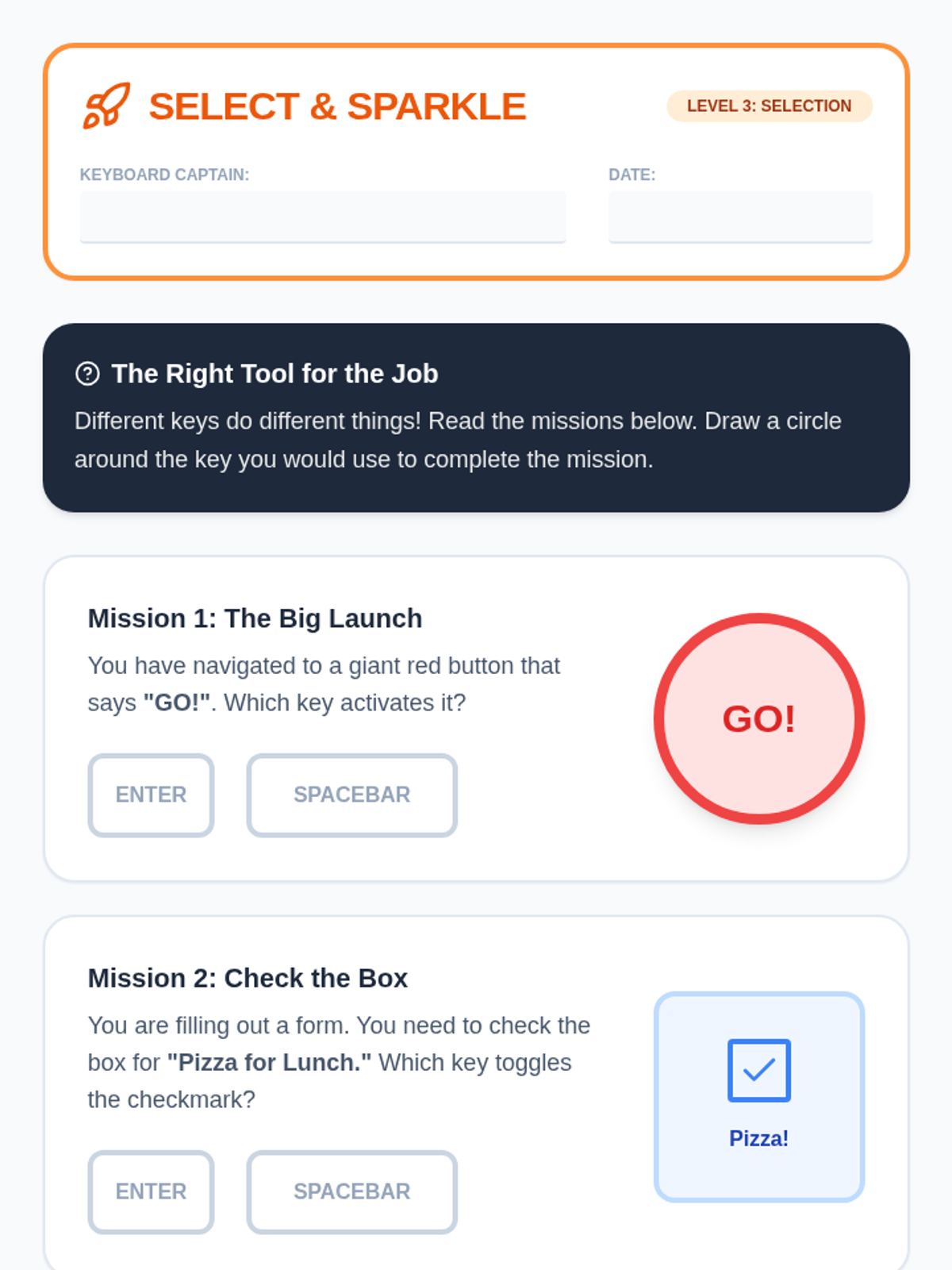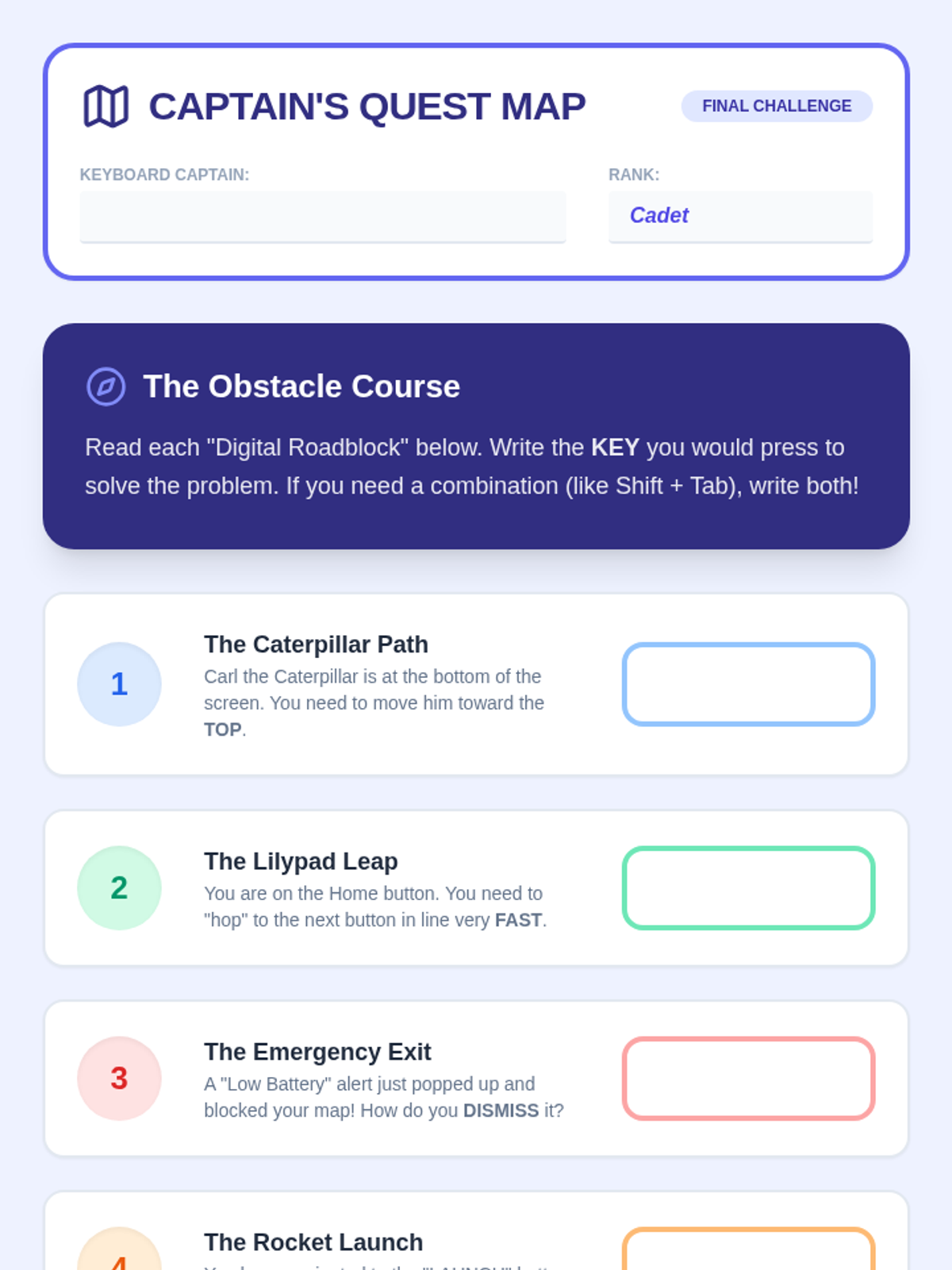 A 4th-grade sequence focused on foundational keyboard navigation skills including arrow keys, Tab, Enter/Space, and Escape keys for students requiring assistive technology support.