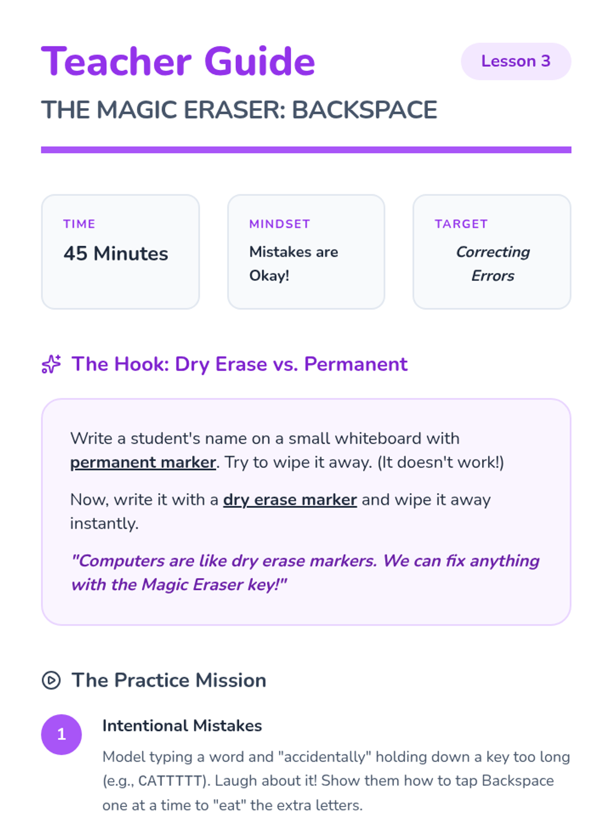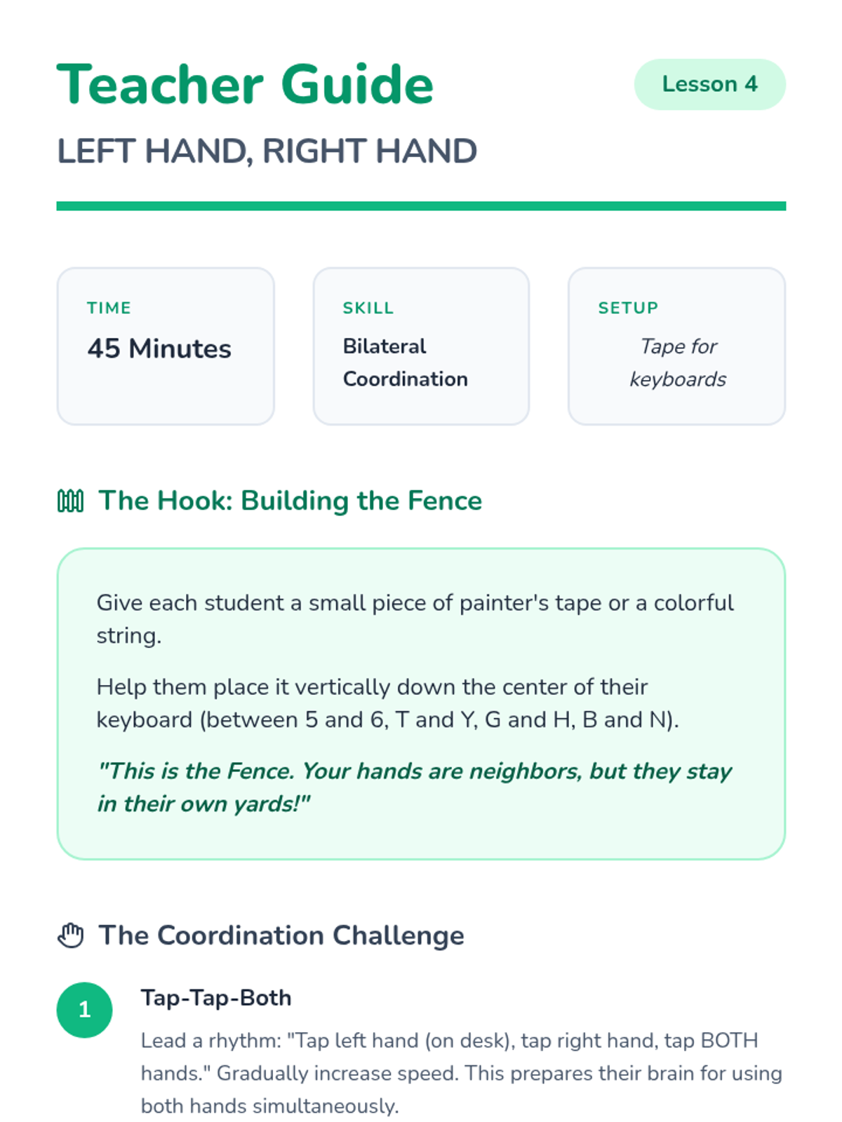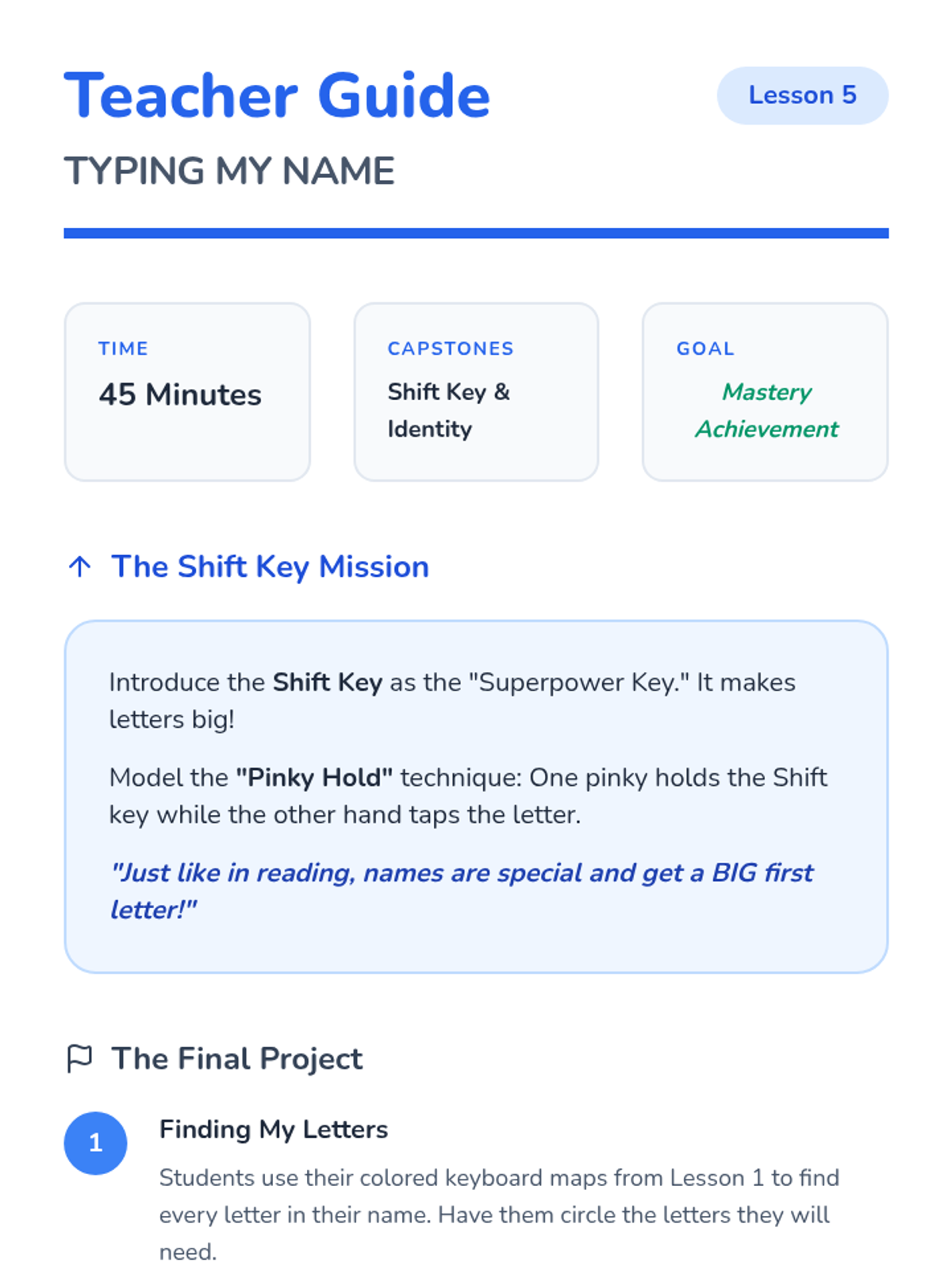 A foundational keyboarding sequence for 1st grade students, focusing on keyboard geography, special function keys, and basic hand positioning through a quest-themed adventure.