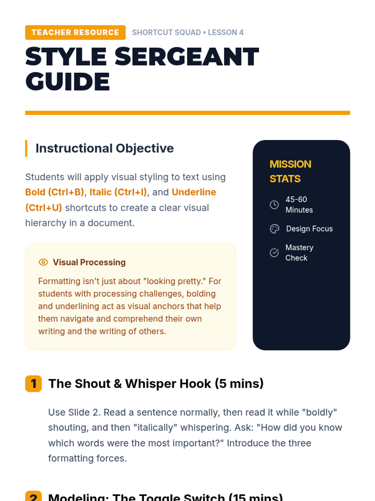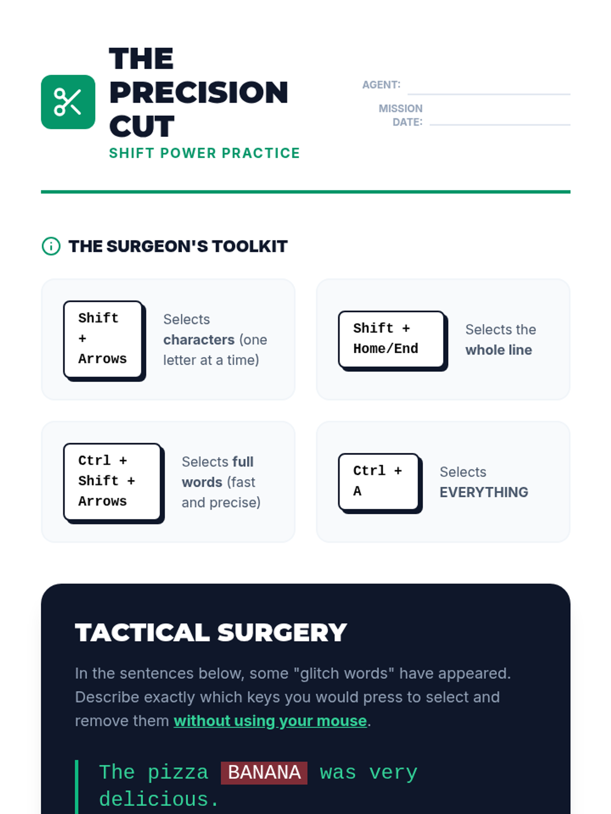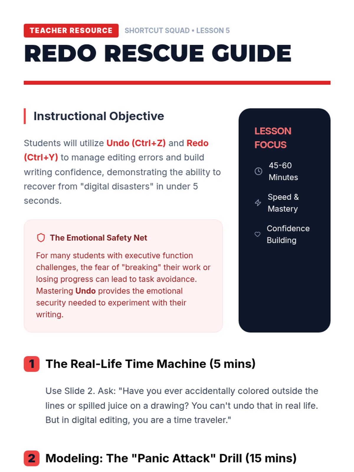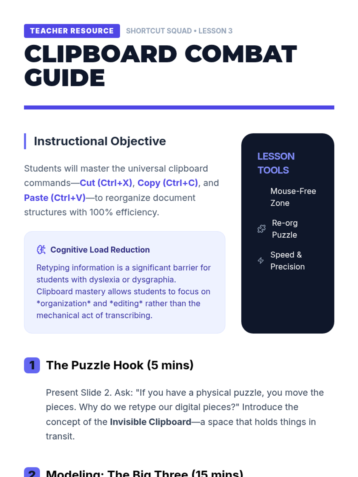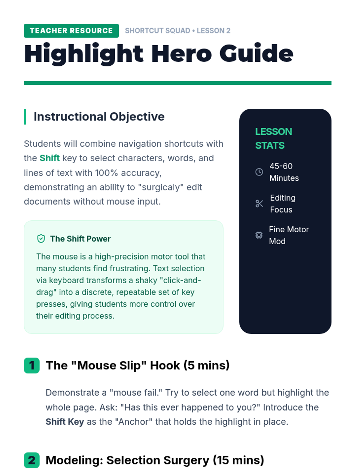 A comprehensive sequence for 5th-grade students focusing on keyboard shortcuts for document editing and text manipulation. The sequence builds from basic cursor movement to complex formatting and error correction, emphasizing efficiency and accessibility for students with diverse needs.