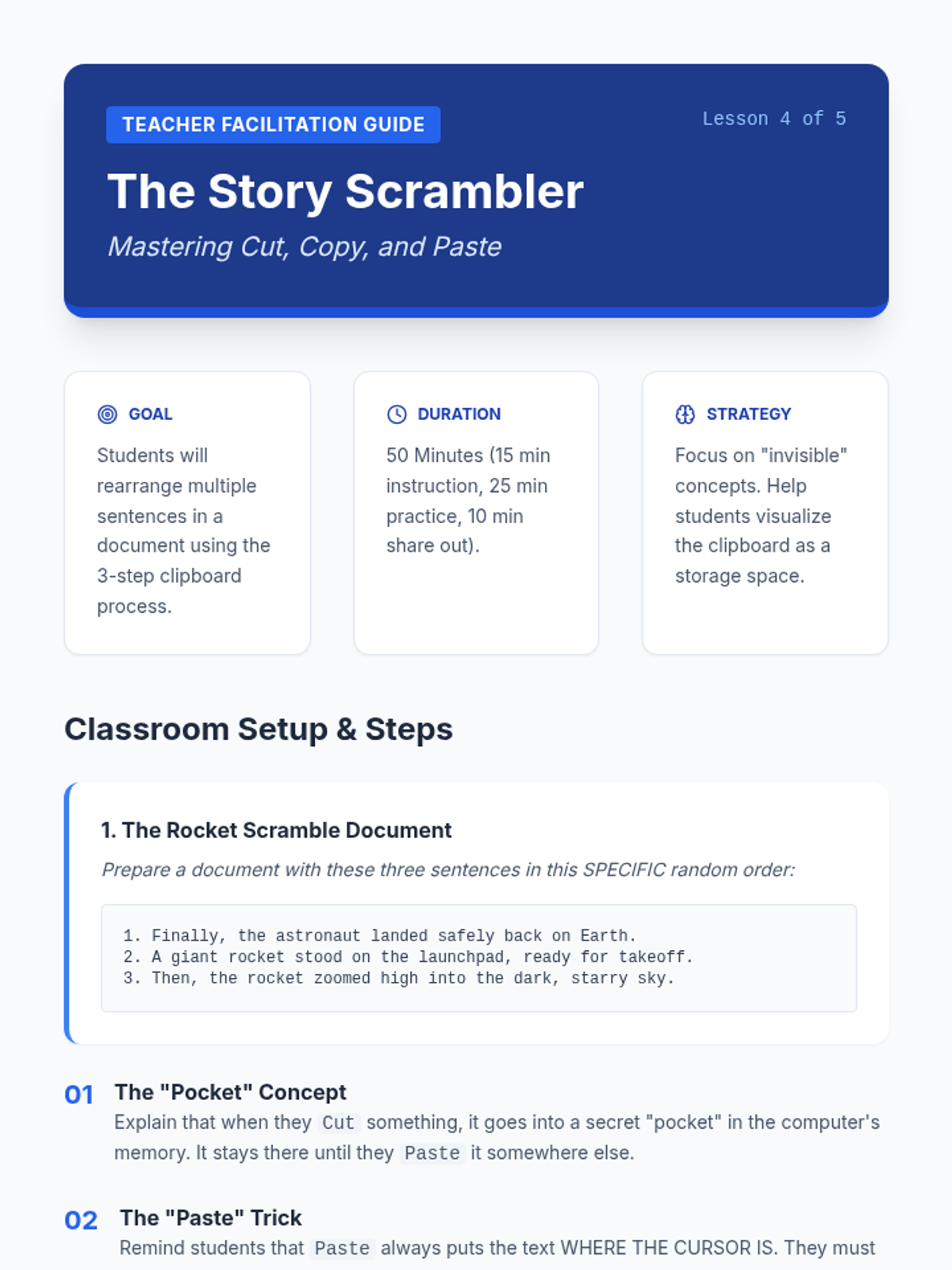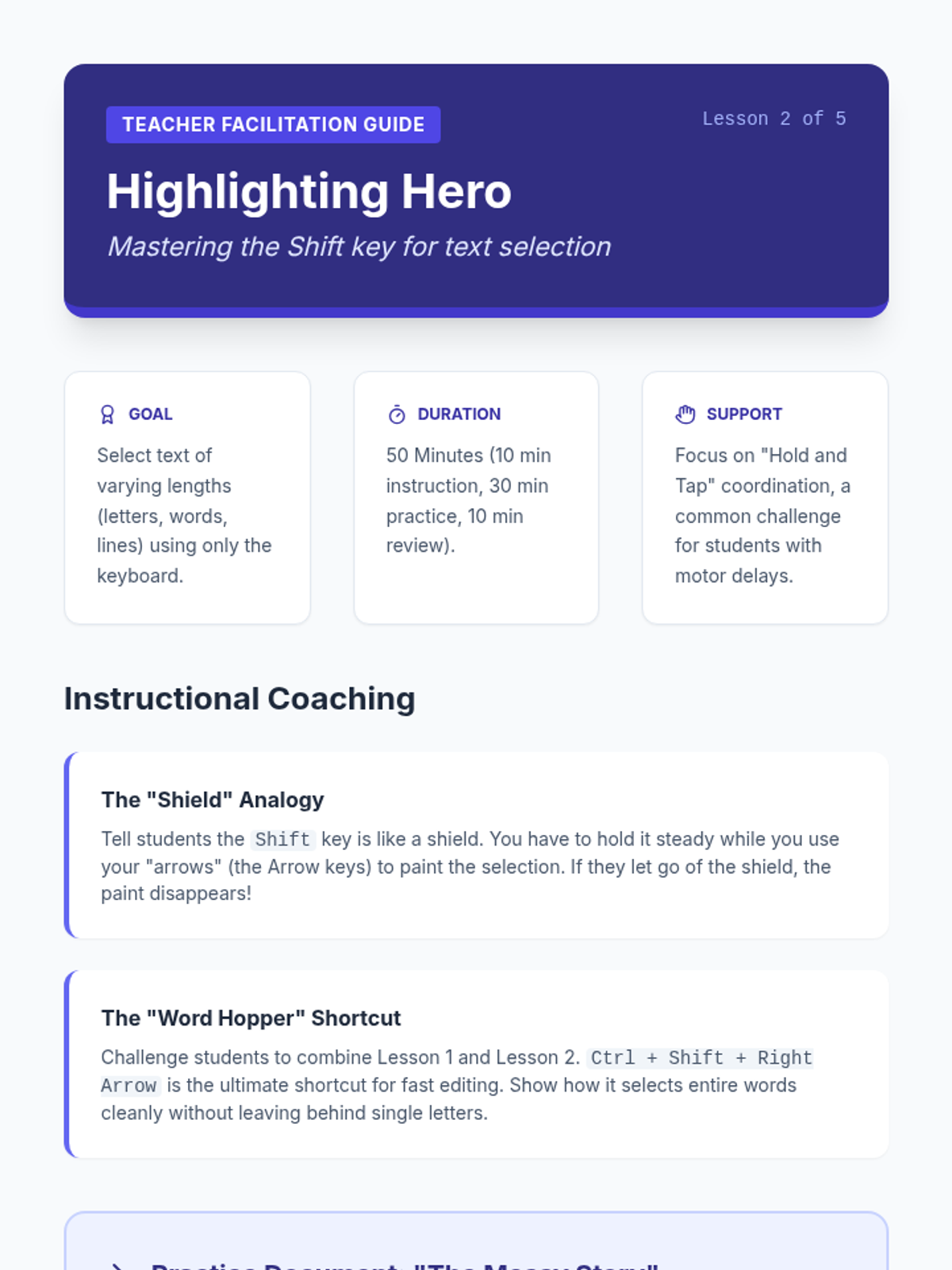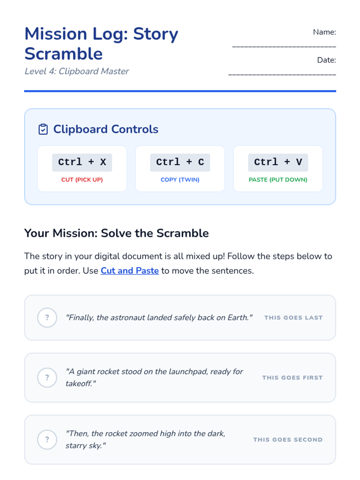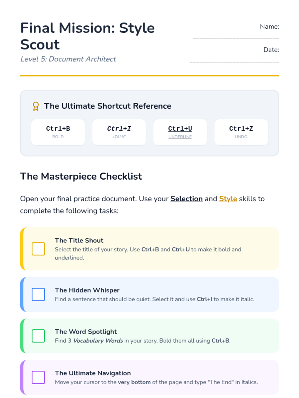 A comprehensive sequence for 4th-grade students to master keyboard shortcuts for text editing and navigation, particularly beneficial for students using assistive technology. Students learn to navigate, select, undo, organize, and format text efficiently.