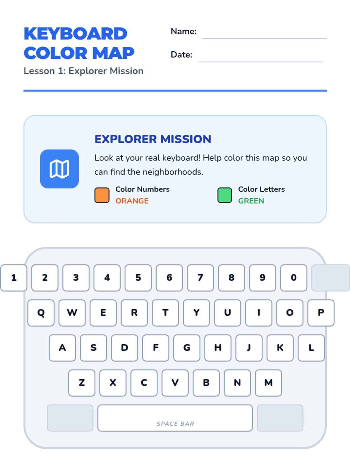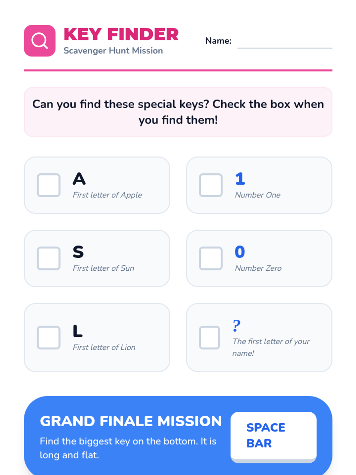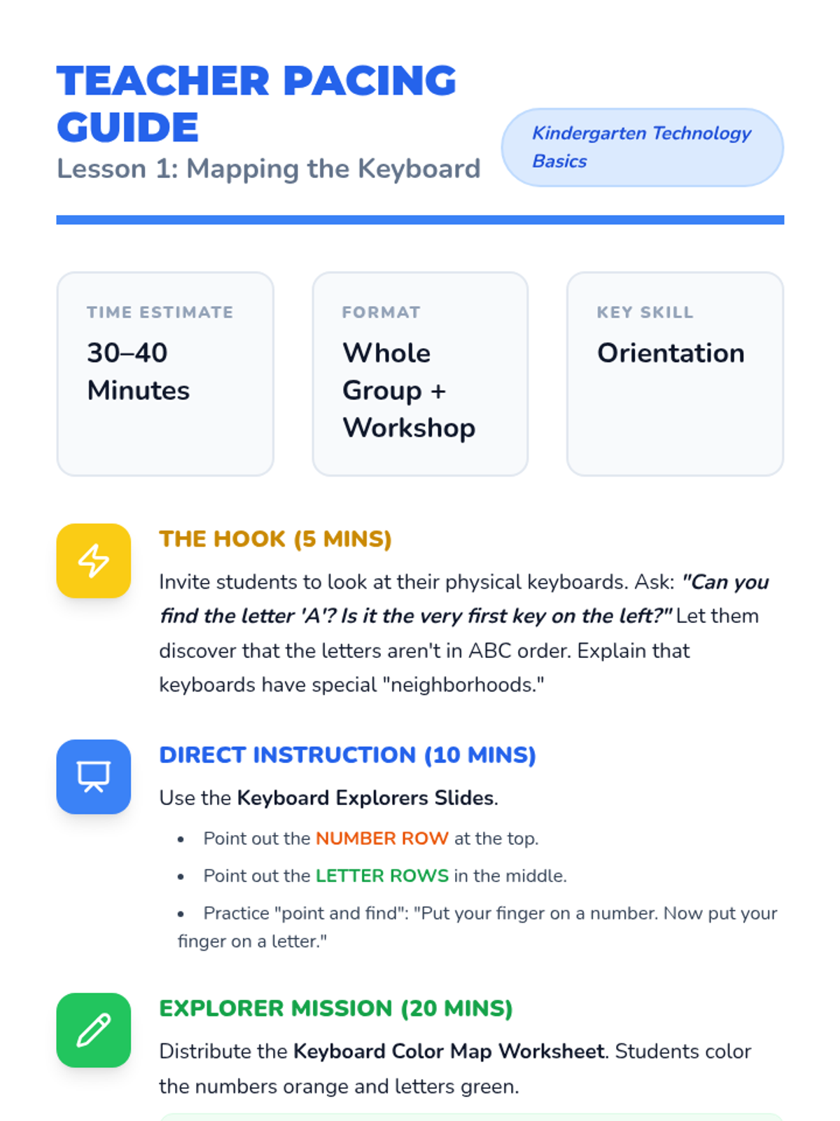 A Kindergarten sequence introducing the keyboard layout, special keys like Space and Enter, and basic name typing through hands-on exploration and play.