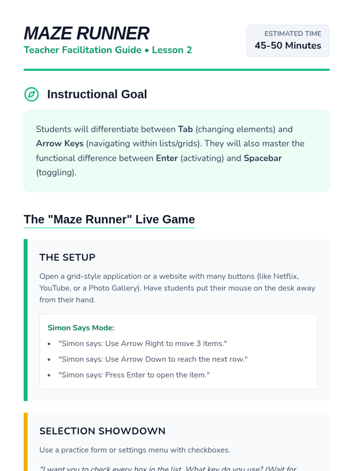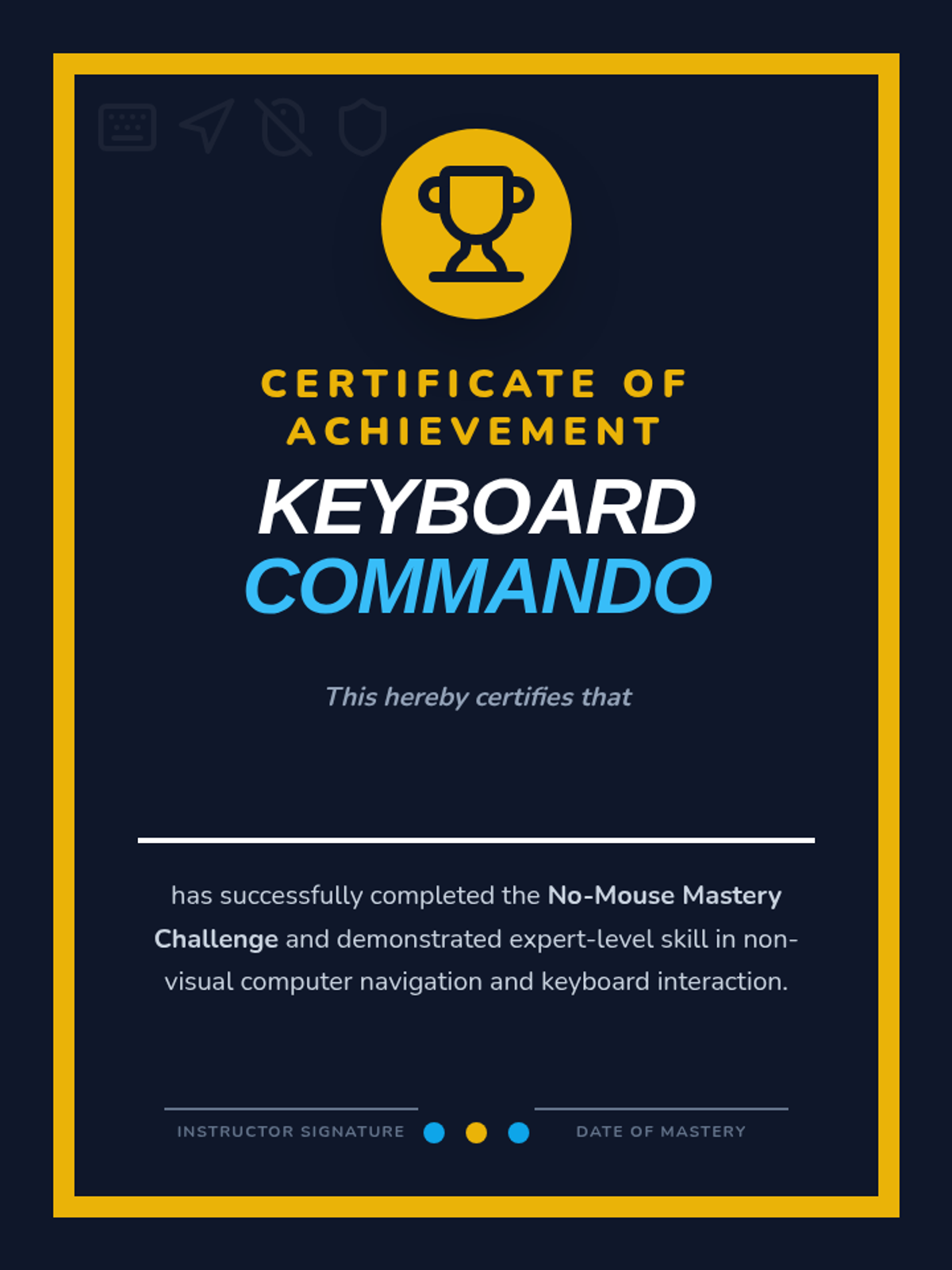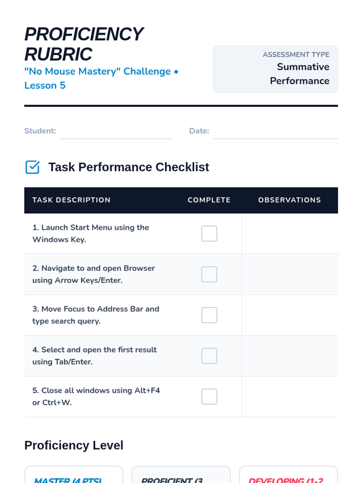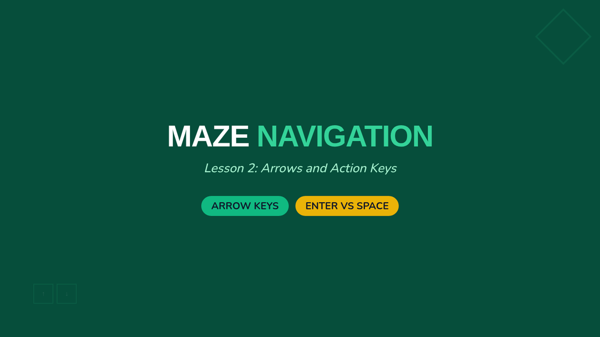 A foundational sequence for 7th-grade students to master non-visual computer navigation using key strokes like Tab, Arrows, and Enter. Students progress from basic focus movement to complex form interaction and desktop navigation, culminating in a mouse-free proficiency challenge.