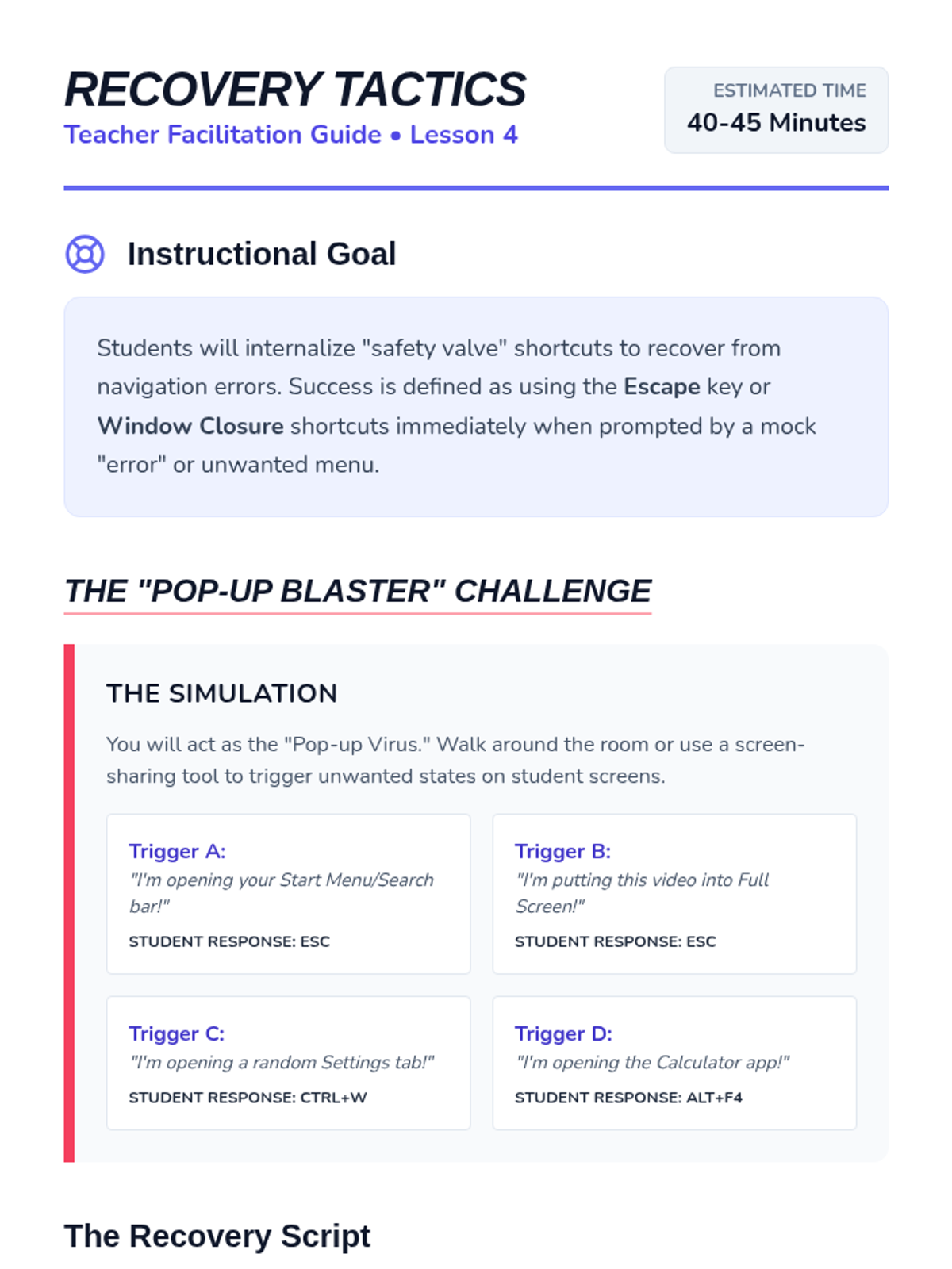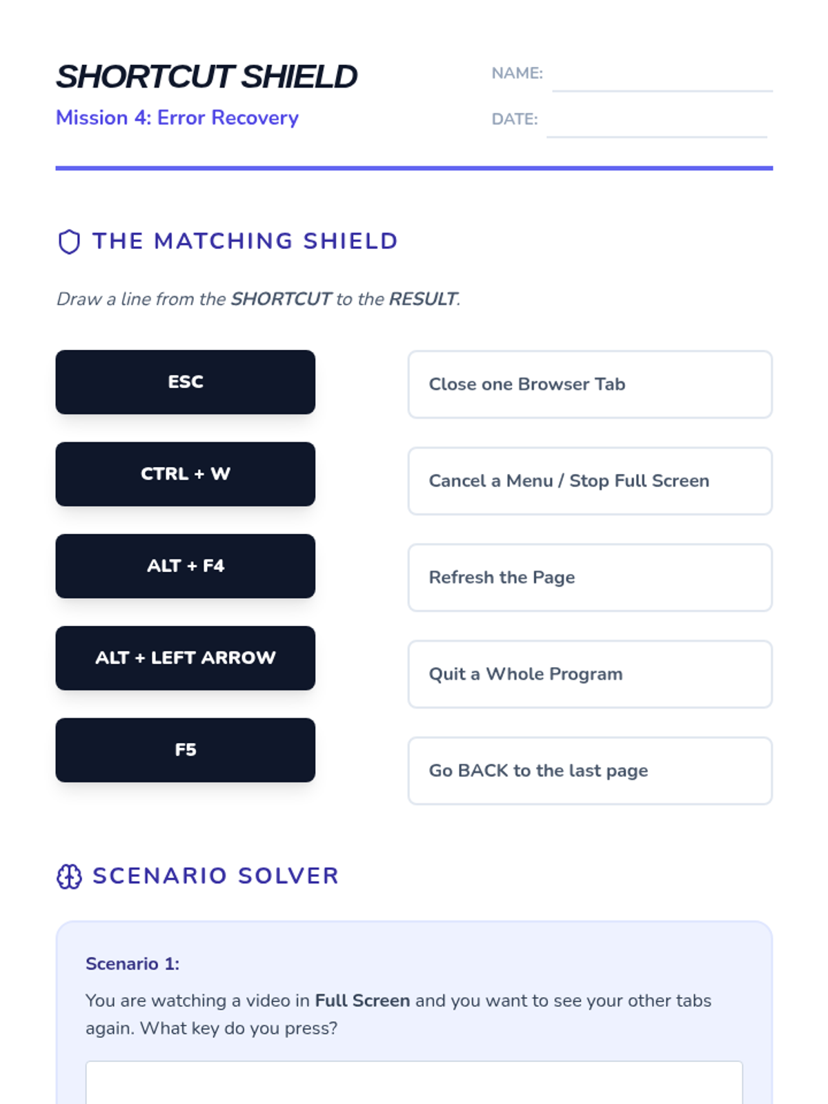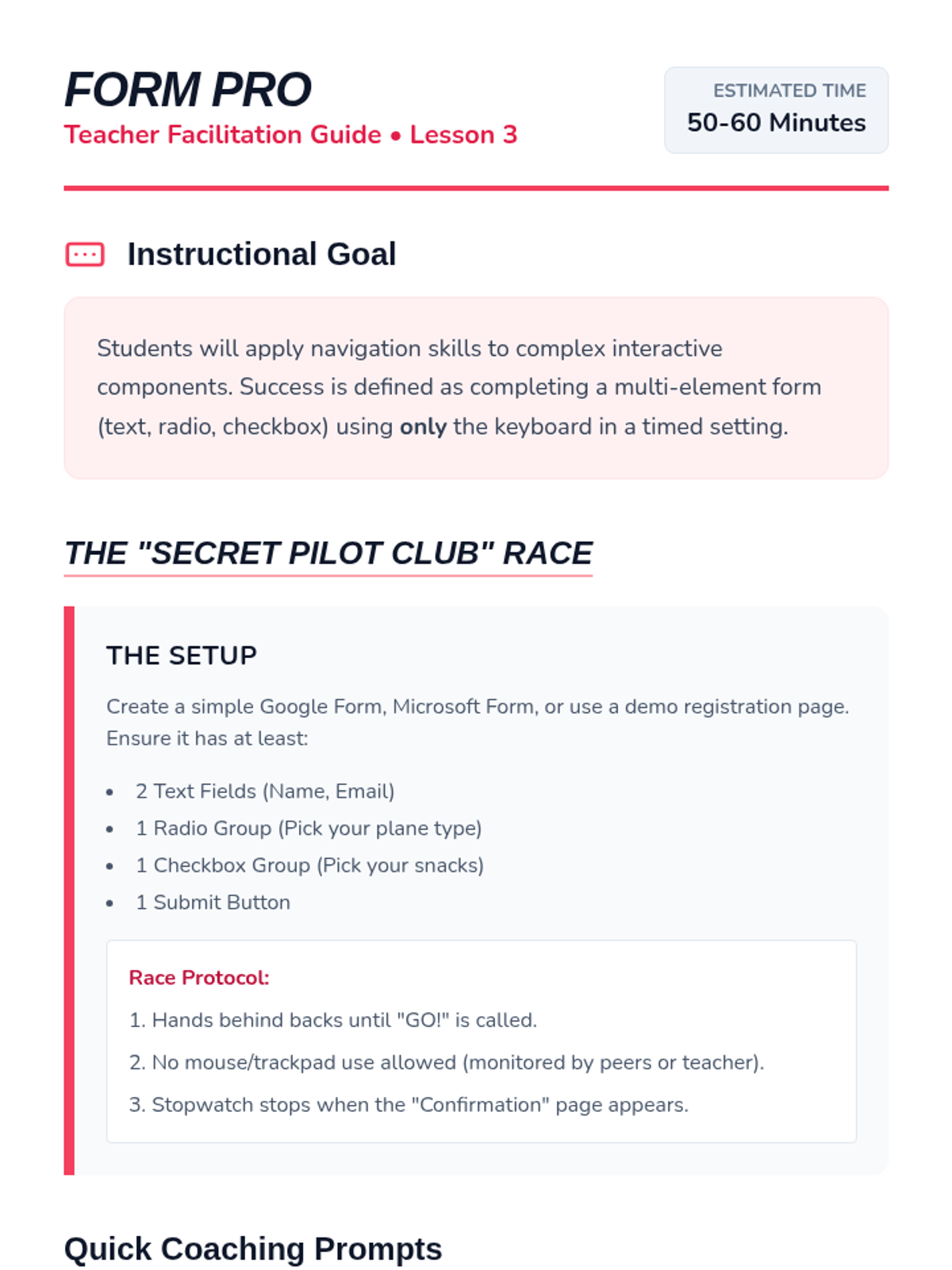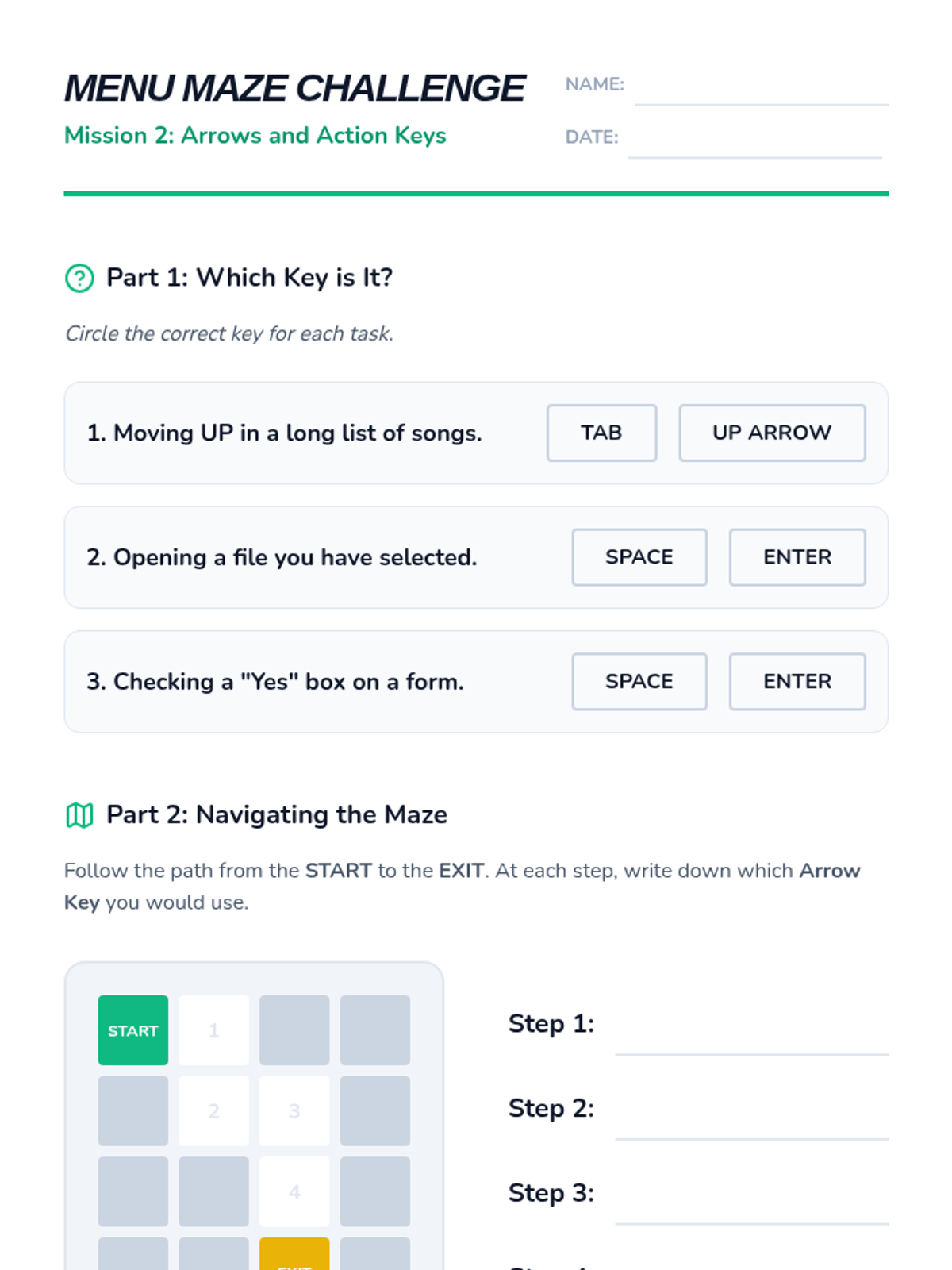 A foundational sequence for 7th-grade students to master non-visual computer navigation using key strokes like Tab, Arrows, and Enter. Students progress from basic focus movement to complex form interaction and desktop navigation, culminating in a mouse-free proficiency challenge.
