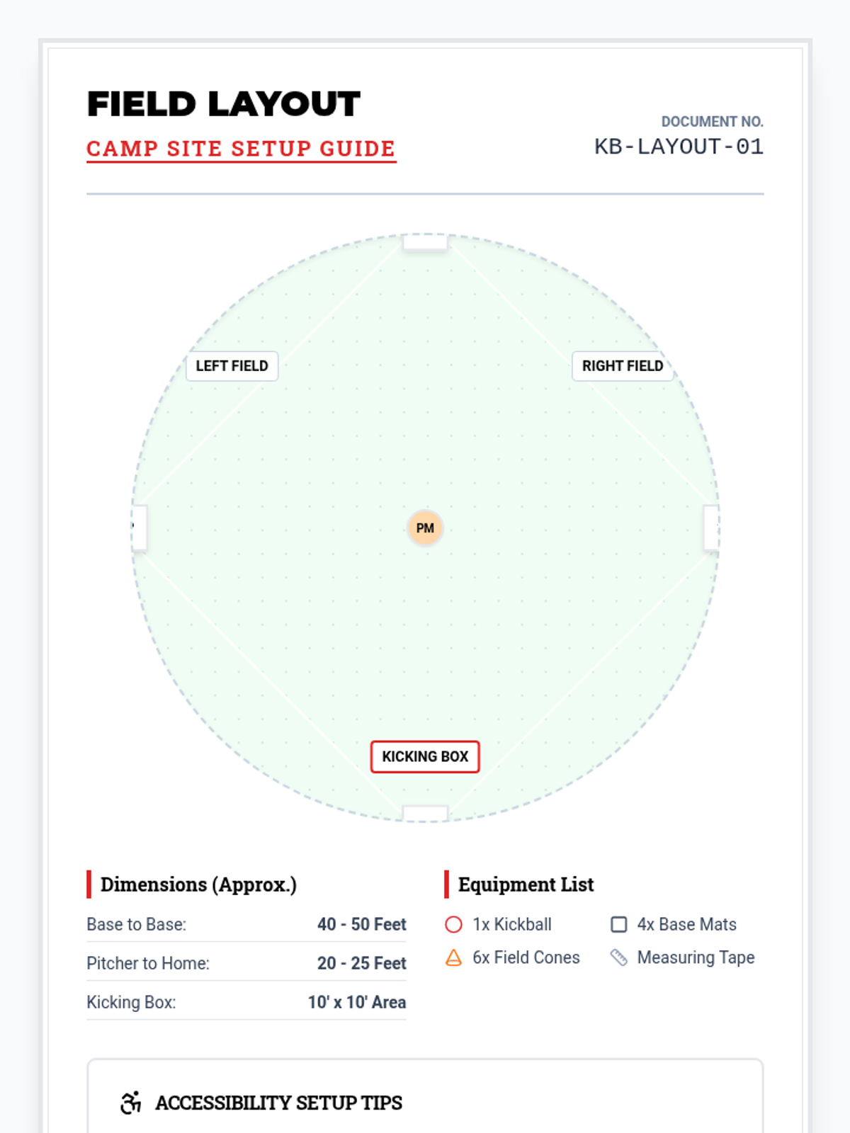 A three-session camp activity sequence designed to teach kickball basics while prioritizing teamwork, social inclusion, and physical activity for all campers. It specifically addresses how to support campers who struggle with social skills or agility.