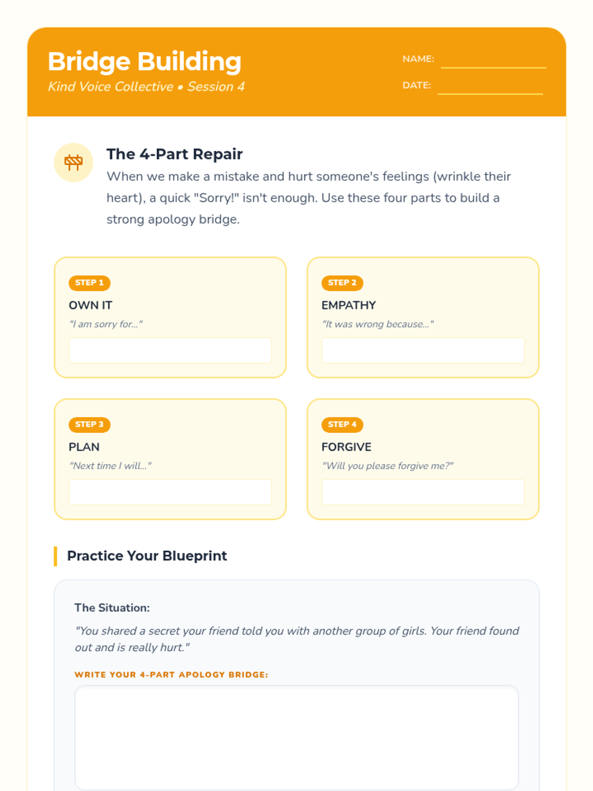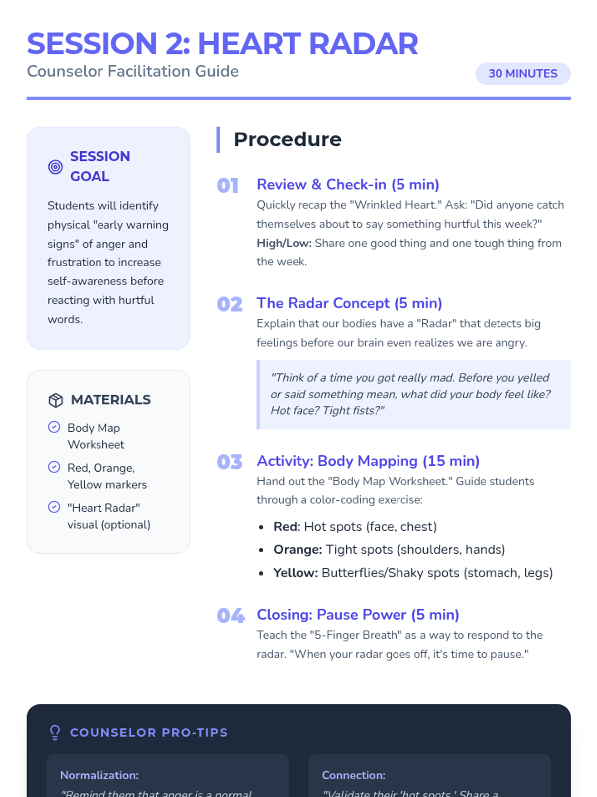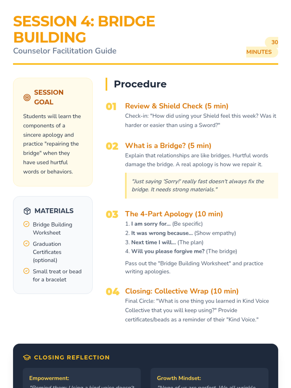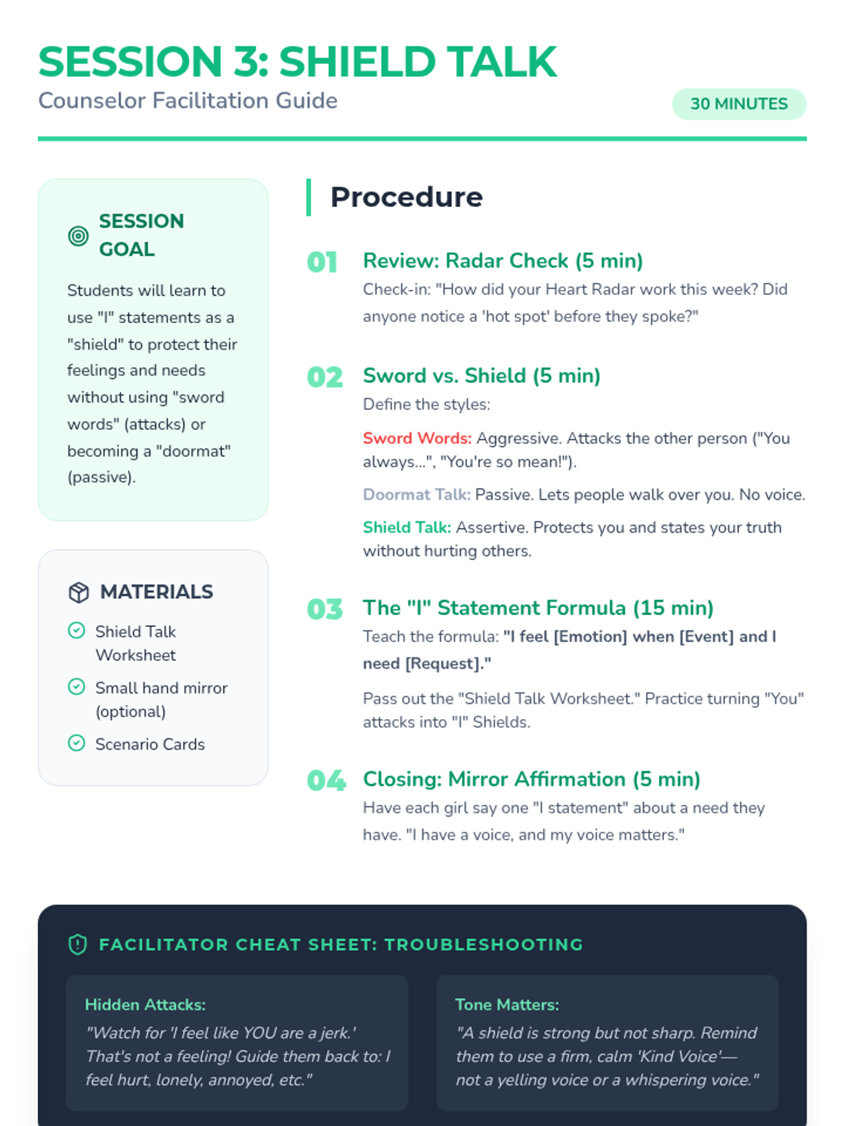 A 4-session small group counseling curriculum for 5th-grade girls focused on positive communication, emotional regulation, and conflict resolution. Students learn the impact of their words and practical tools for healthy social interactions.