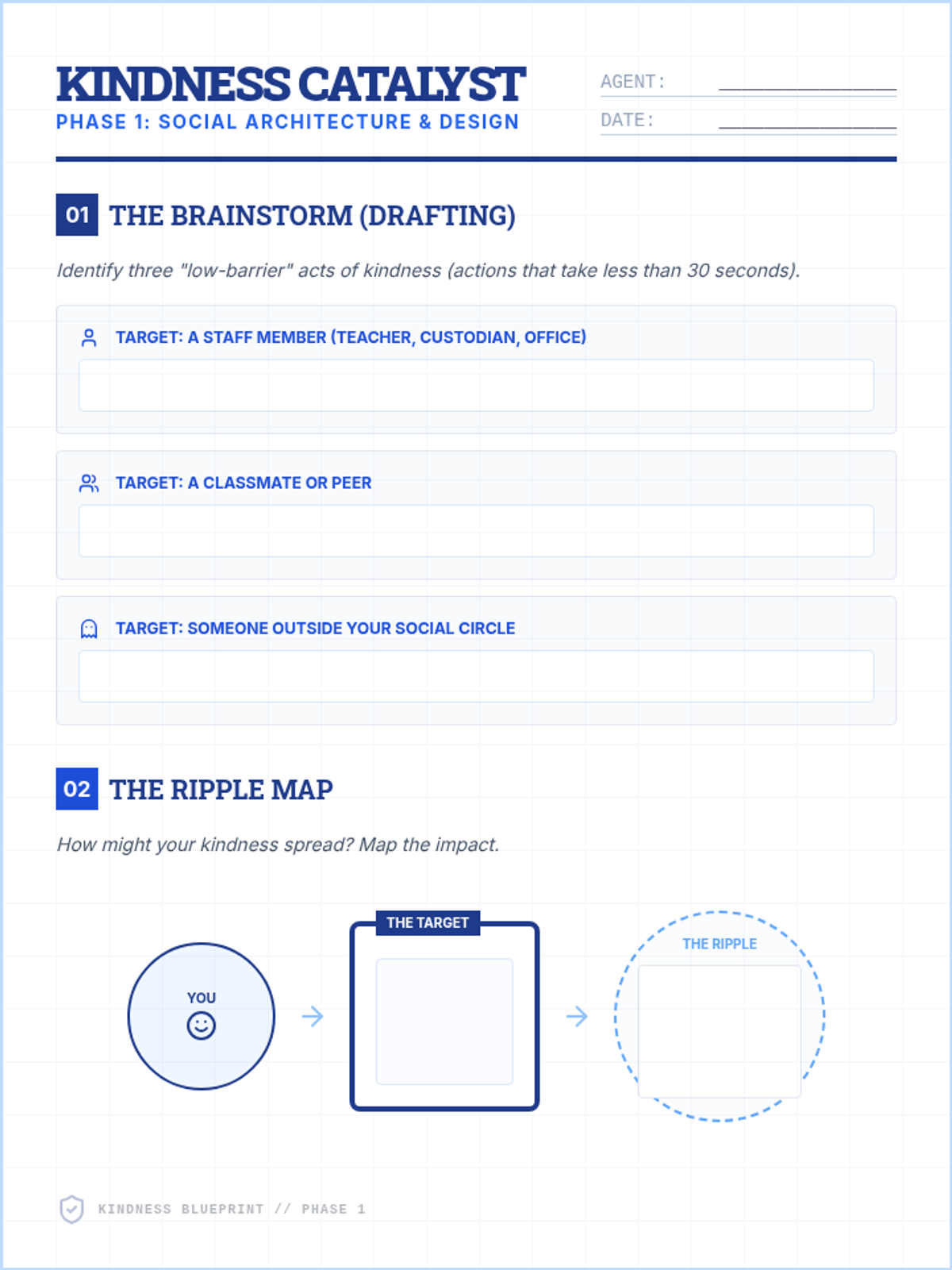 A two-day Tier 2 SEL sequence where students design, execute, and reflect on intentional acts of kindness within their school community using an architectural blueprint framework.