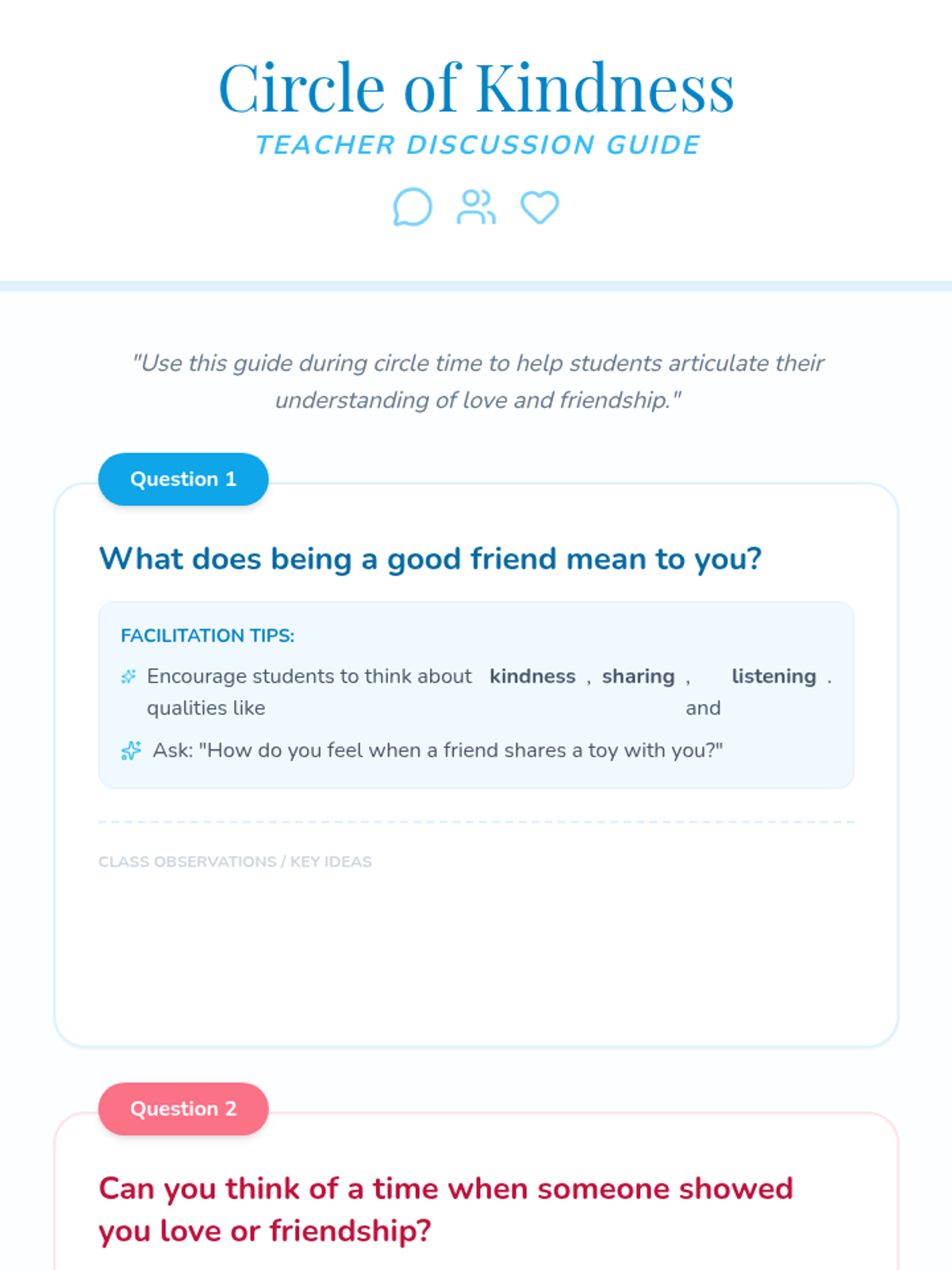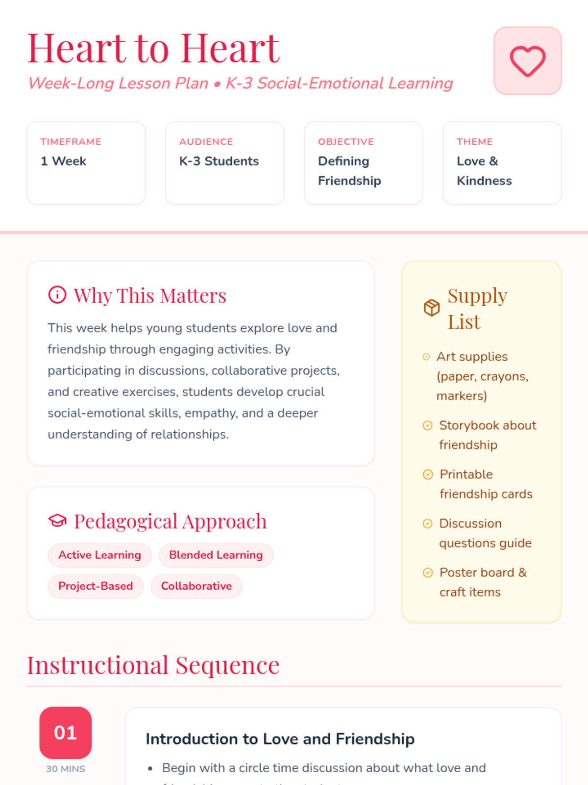 A week-long exploration of love and friendship designed for K-3 students, focusing on social-emotional skills, empathy, and kindness through art, discussion, and collaborative projects.