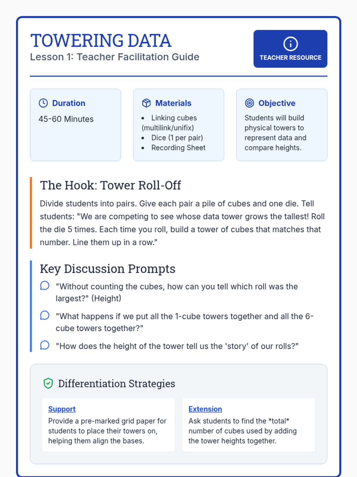 A 2nd-grade sequence exploring quantitative relationships through growing geometric patterns. Students move from concrete cube-building to recording data in tables and visualizing growth with bar graphs.