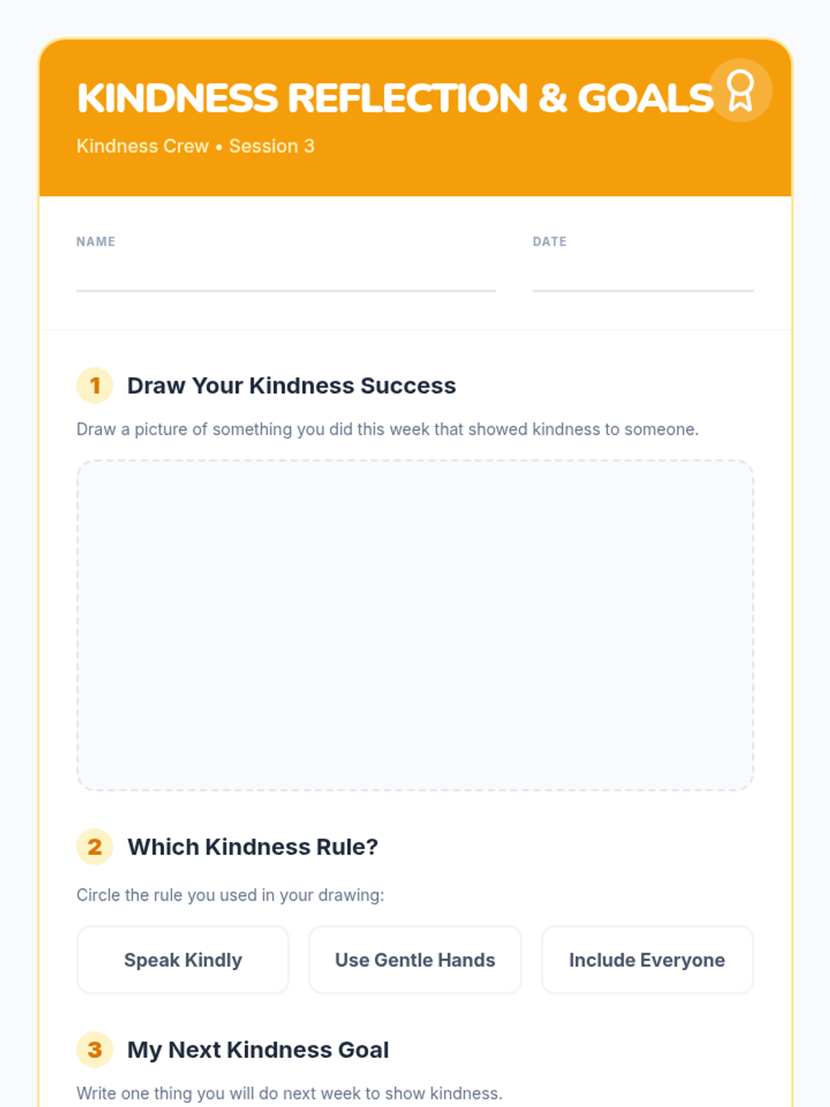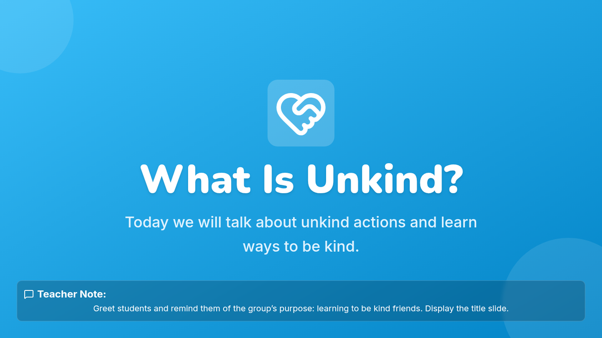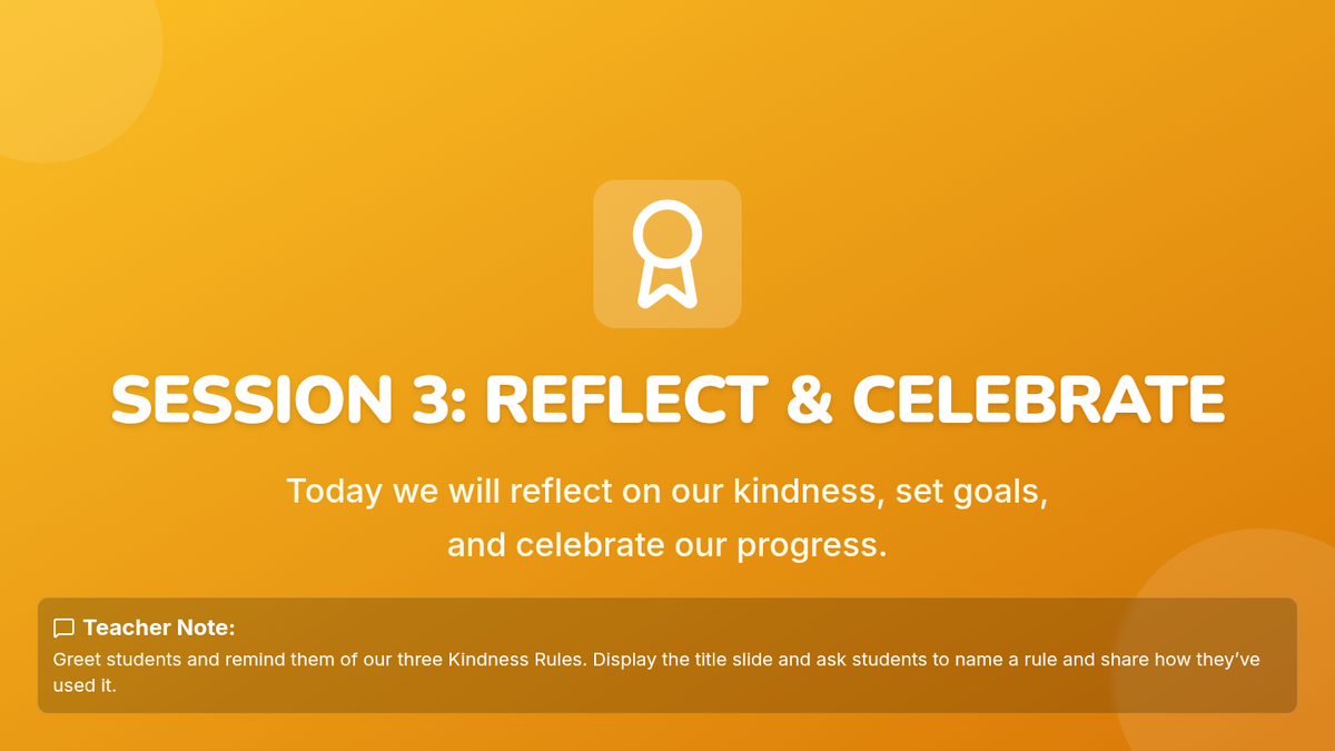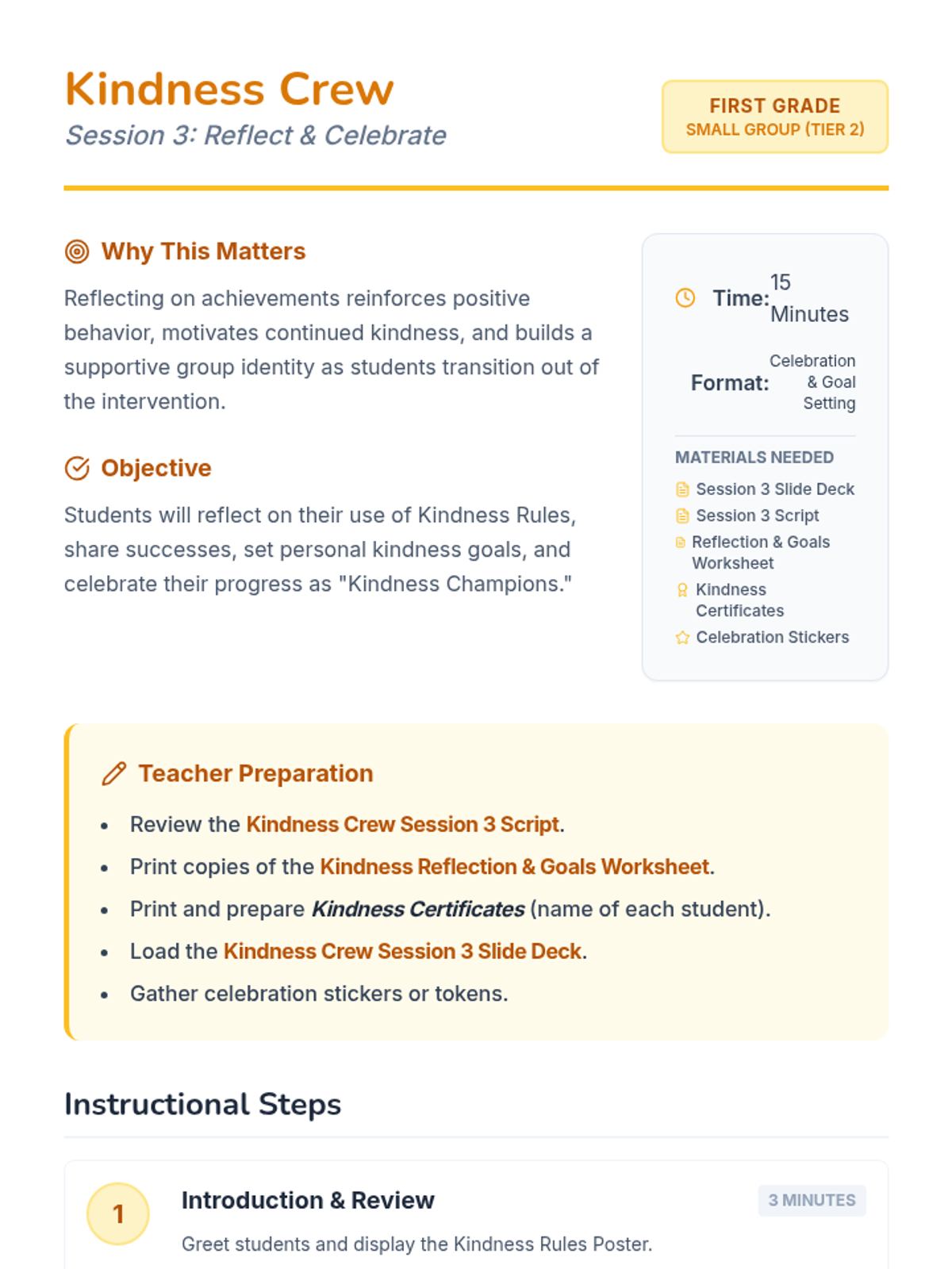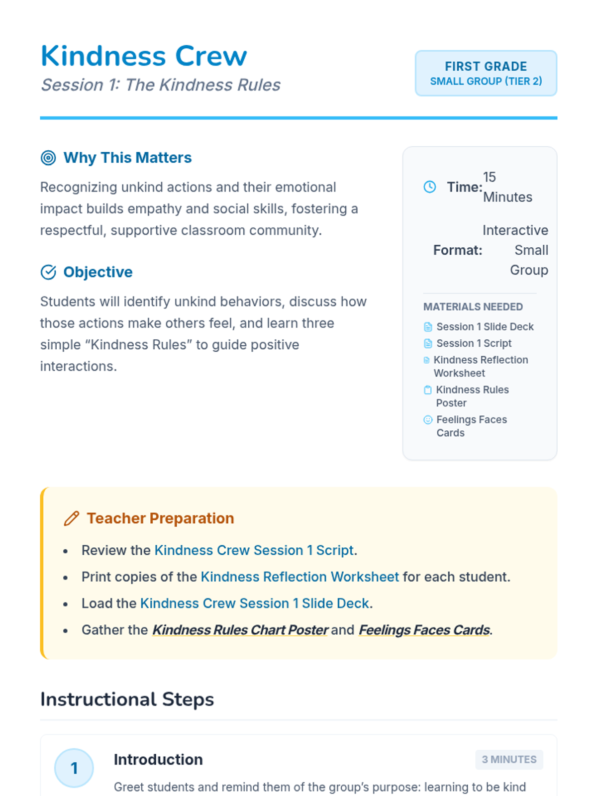 A three-session Tier 2 intervention for first graders focusing on recognizing unkind behaviors, practicing the 'Kindness Rules', and reflecting on personal growth in social-emotional skills.