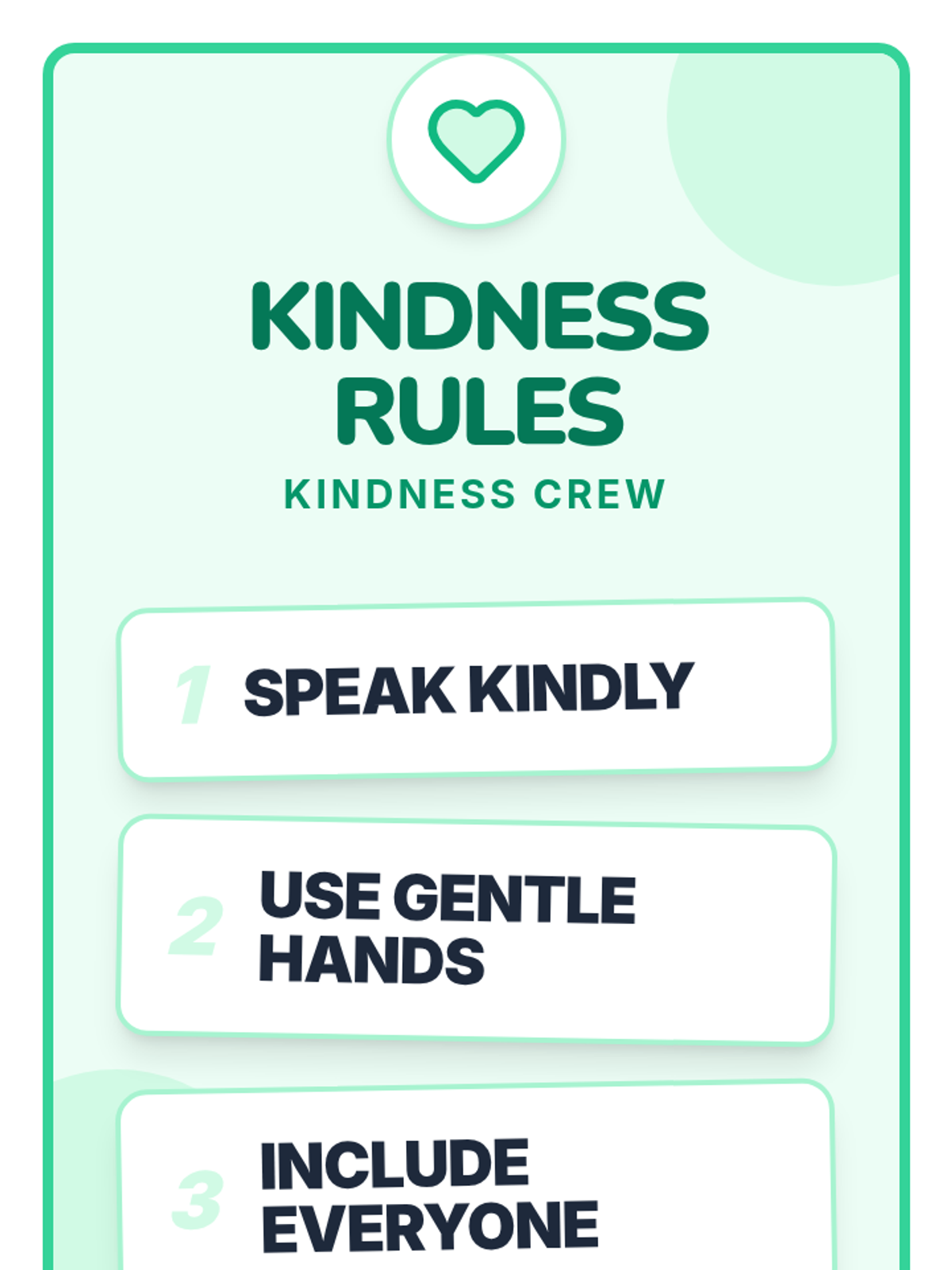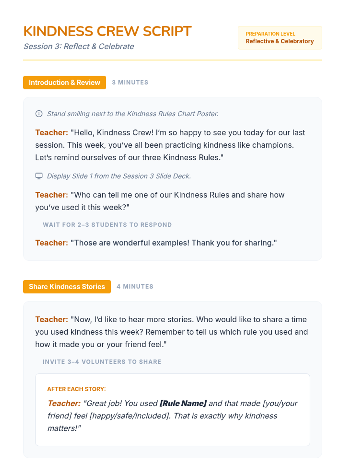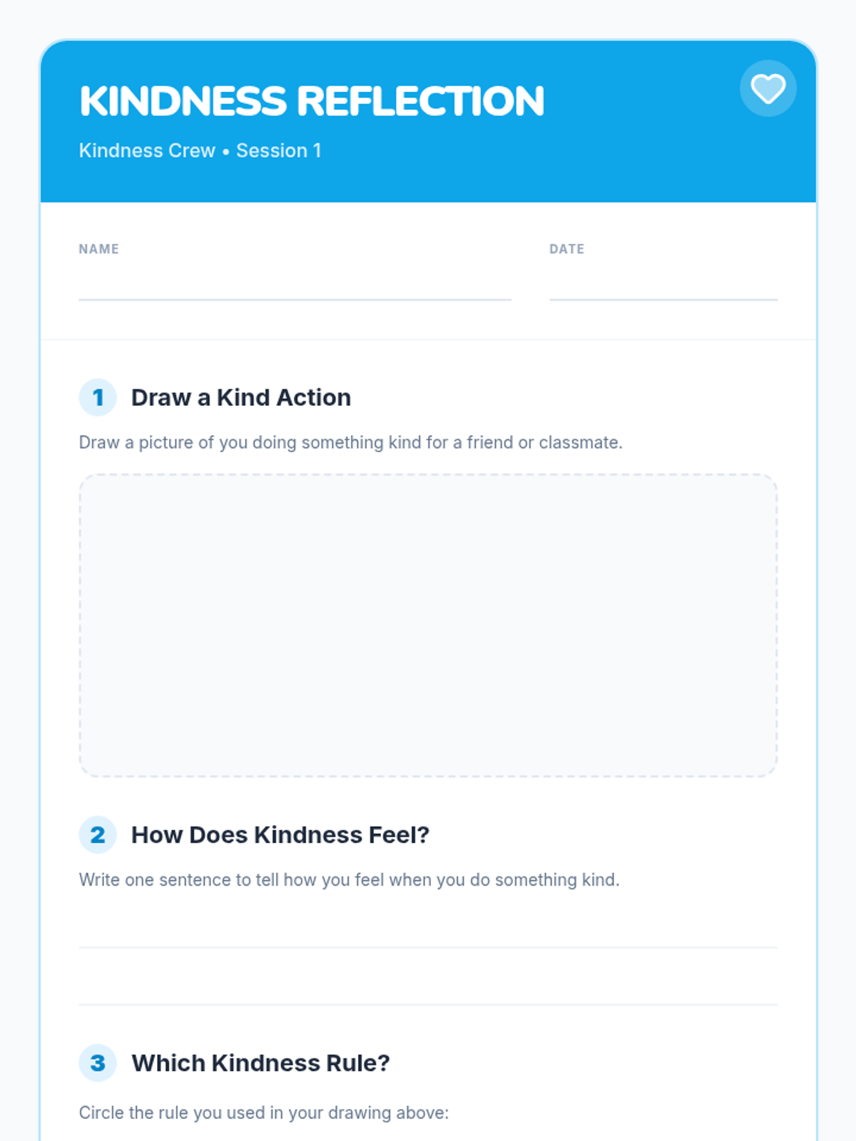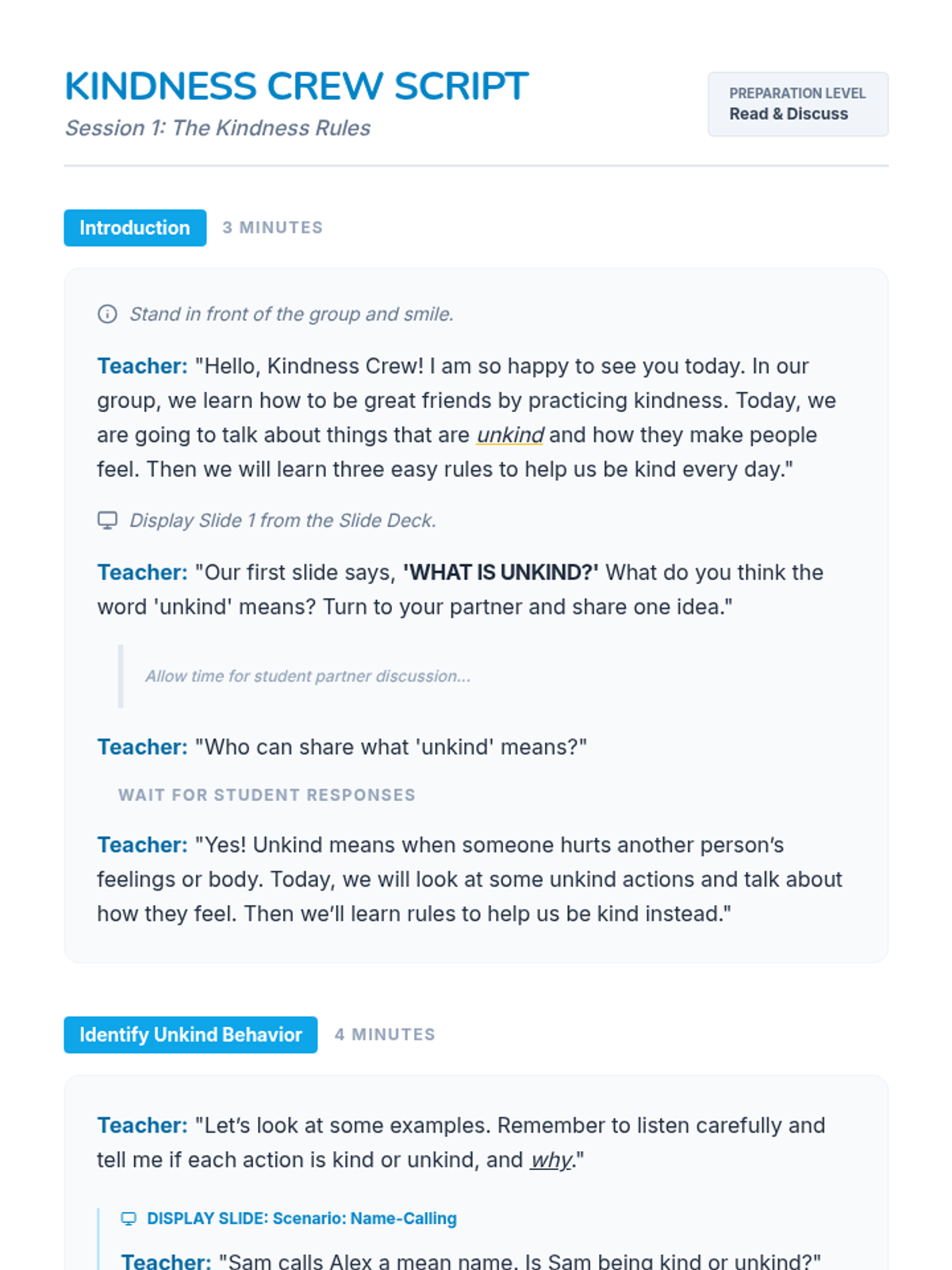 A three-session Tier 2 intervention for first graders focusing on recognizing unkind behaviors, practicing the 'Kindness Rules', and reflecting on personal growth in social-emotional skills.