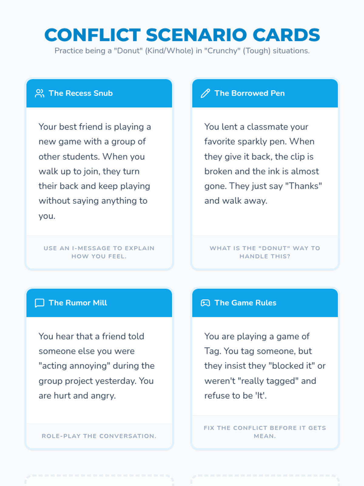 A comprehensive 5-day curriculum for 4th graders focused on kindness, conflict resolution, and bullying prevention. Using the 'Donut vs. Munchkin' and 'BUSTER' frameworks, students learn to build a supportive classroom community through interactive lessons and activities.