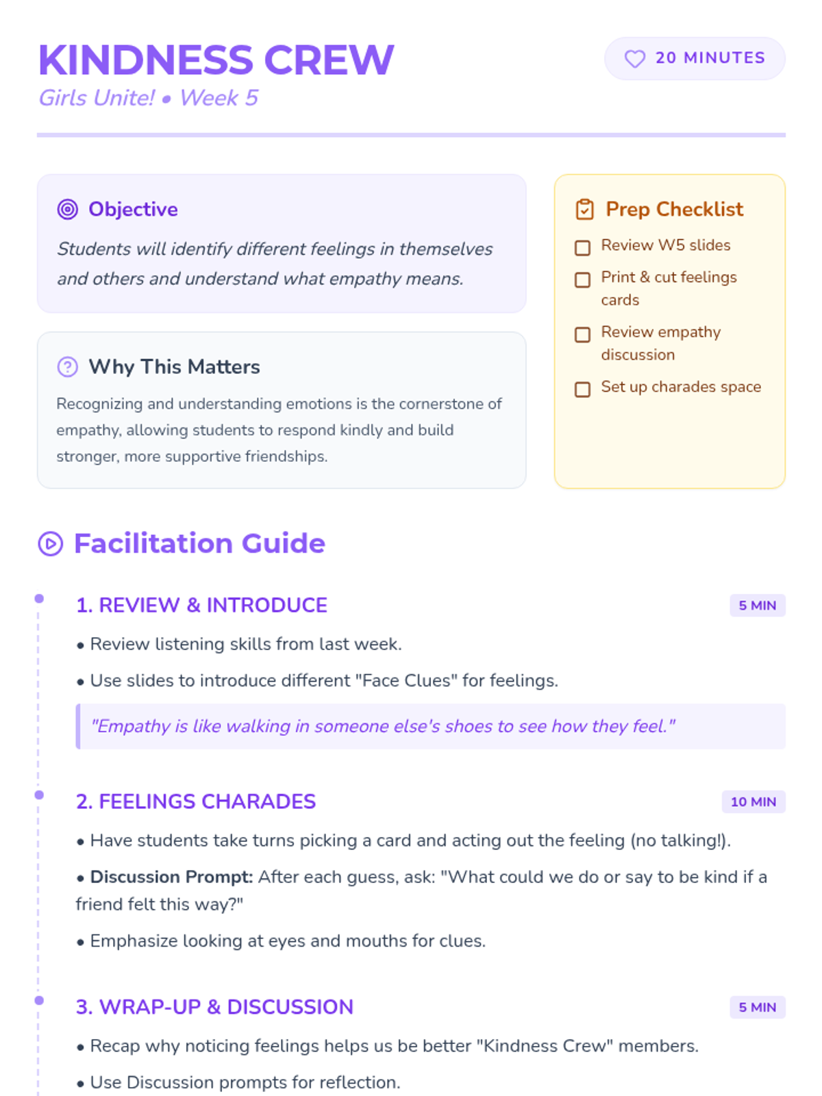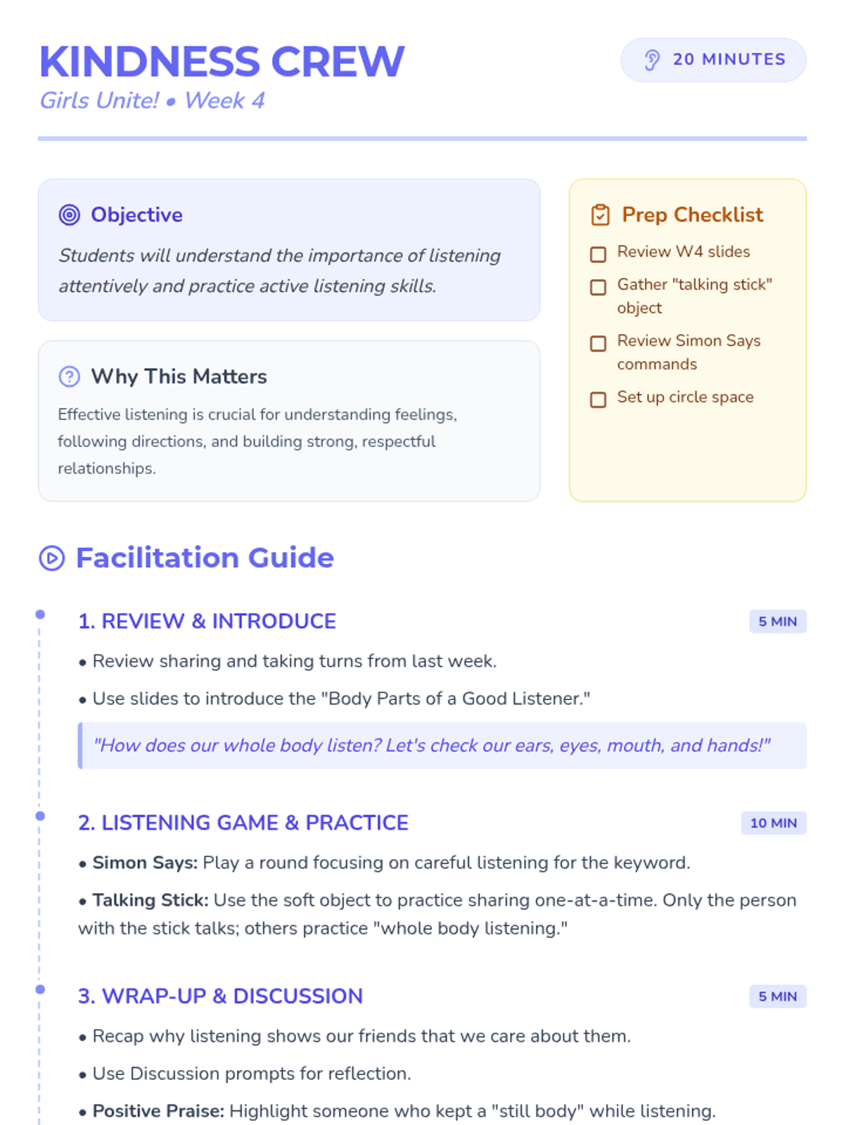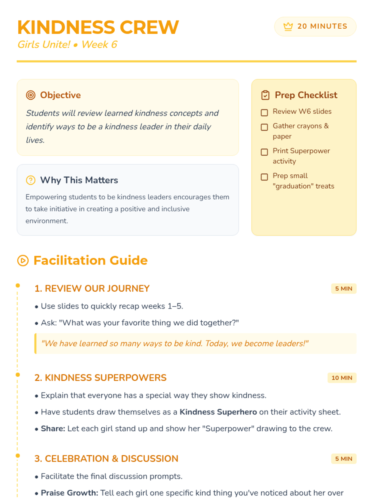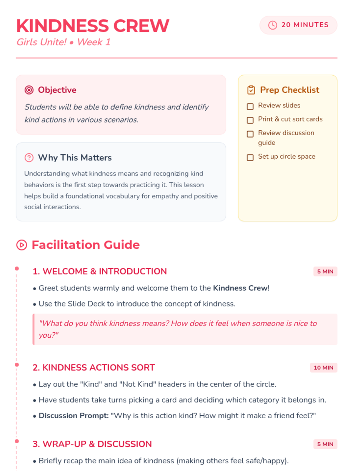 A 6-week social skills intervention for kindergarten girls focused on developing kindness, empathy, and positive peer relationships through 20-minute weekly sessions.