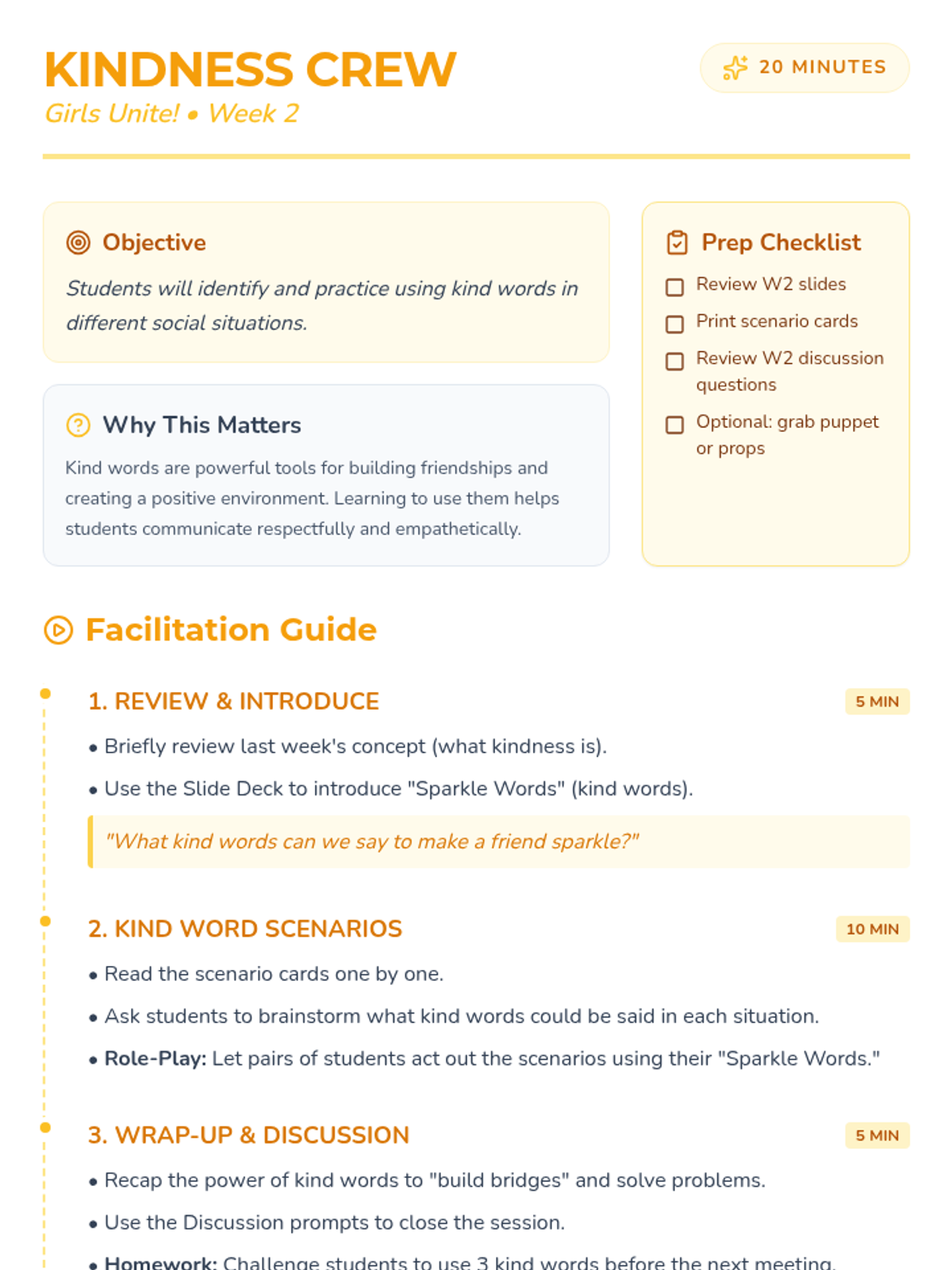 A 10-week mentorship program designed for short, 10-minute sessions focusing on friendship, conflict resolution, and coping skills. The sequence provides structured but flexible activities to build a strong mentor-mentee relationship while developing essential social-emotional skills.