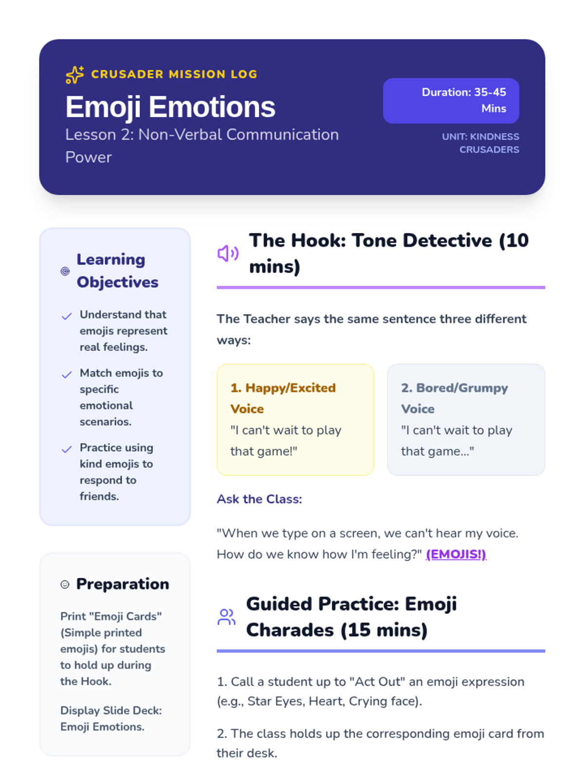 A comprehensive social-emotional learning unit for English Language Learners focused on identifying and managing emotions through four key instructional strategies: predictable routines, modeled talk, visual scaffolding, and word collection.