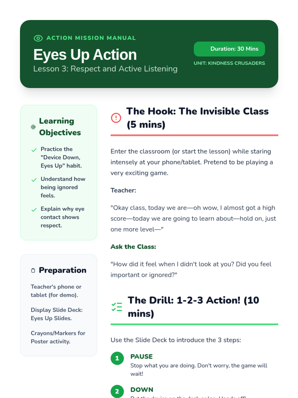 A comprehensive 6-lesson unit for preschool students focused on a 5-step social problem-solving process. Using the 'Solution Squad' theme, students learn to identify problems, express feelings, brainstorm solutions, and reflect on outcomes through interactive scenarios like sharing, personal space, and joining play.