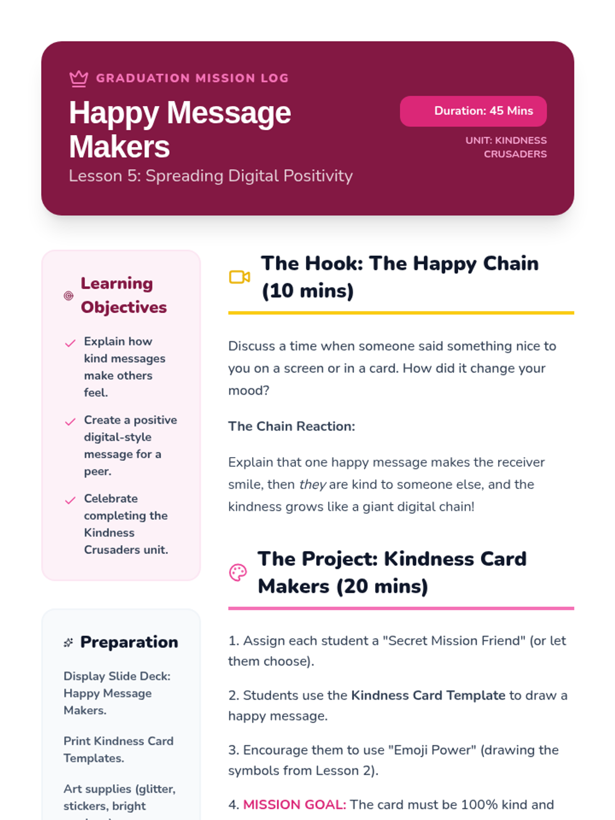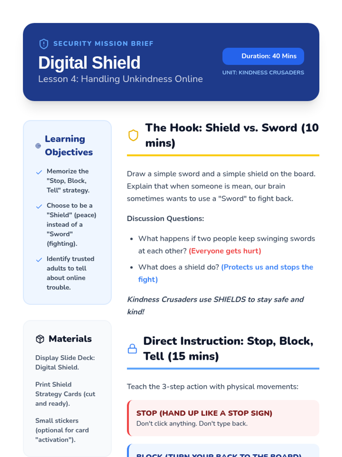 A Kindergarten sequence focused on social-emotional skills in digital environments, teaching students to be kind, respectful, and safe online through the 'Kindness Crusaders' theme.