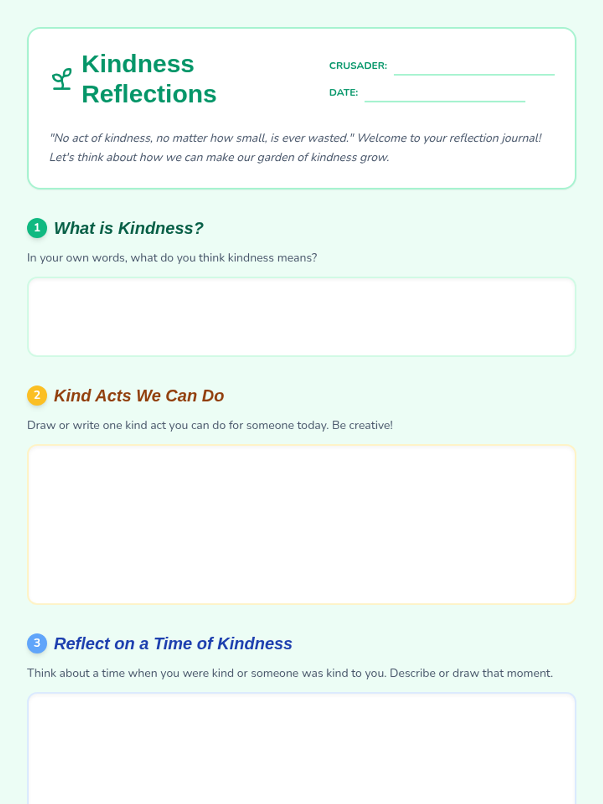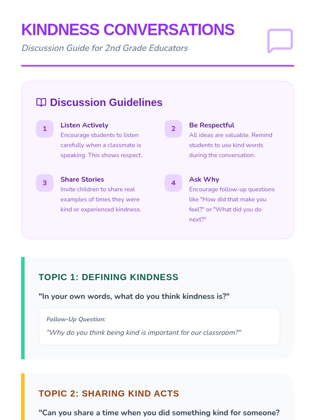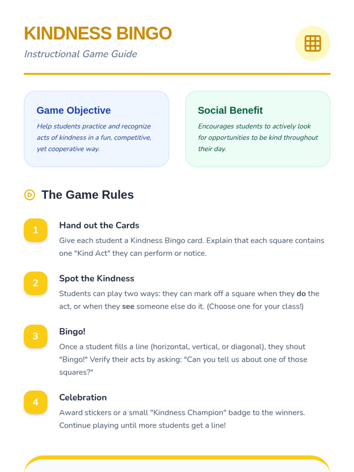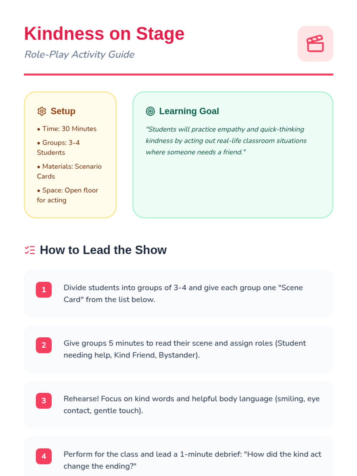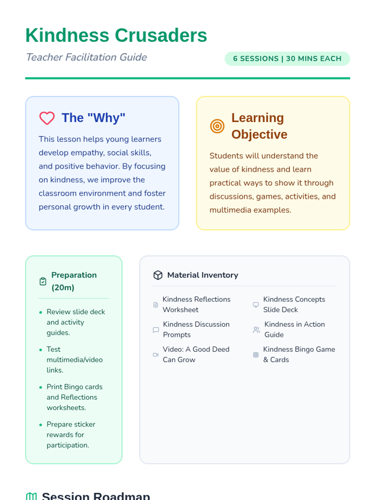 A 6-session social-emotional learning sequence for 2nd graders that explores the definition, importance, and practice of kindness through interactive stories, role-playing, and games.