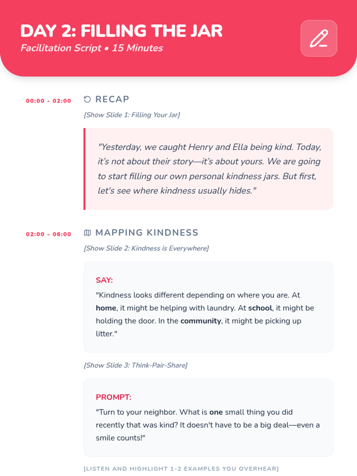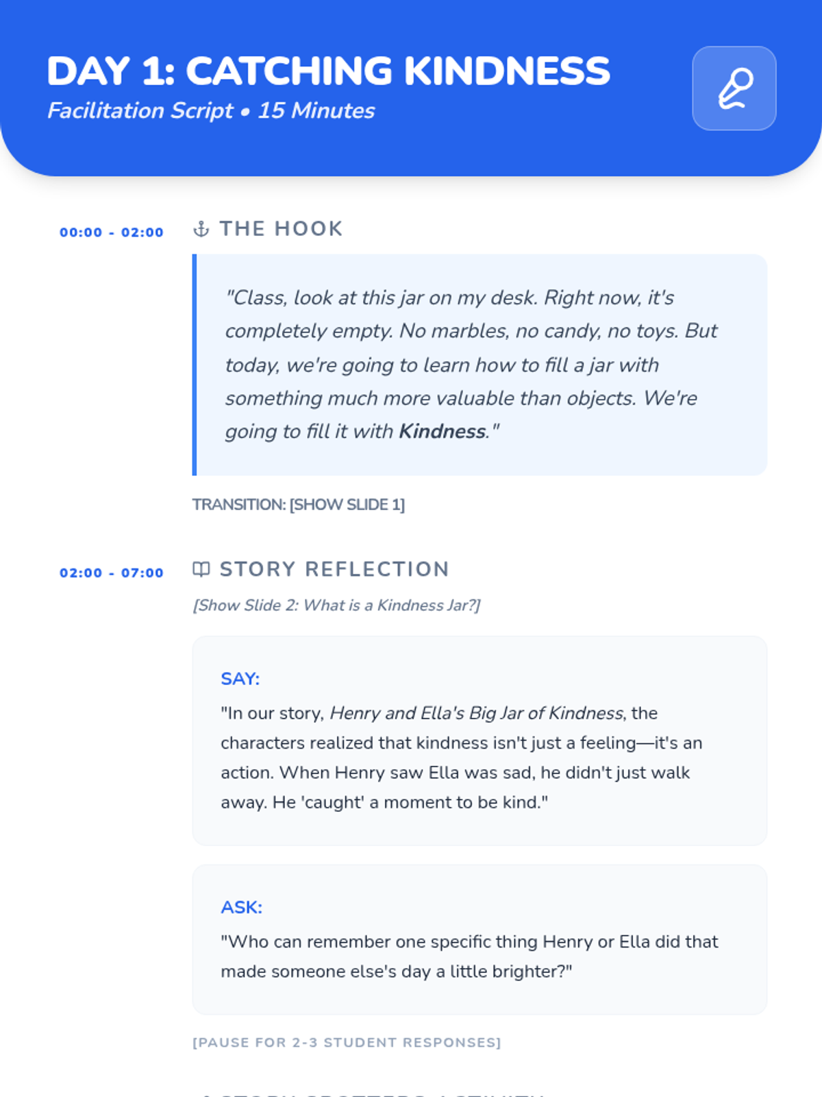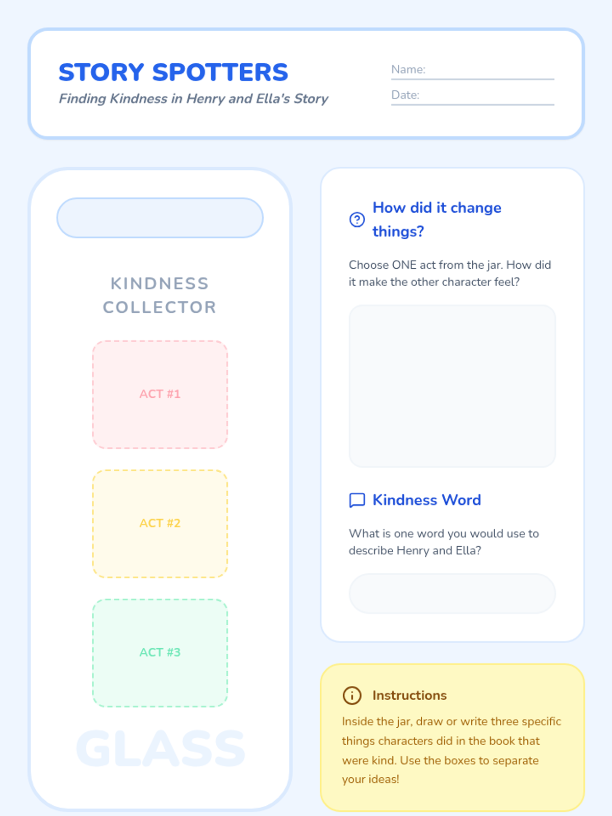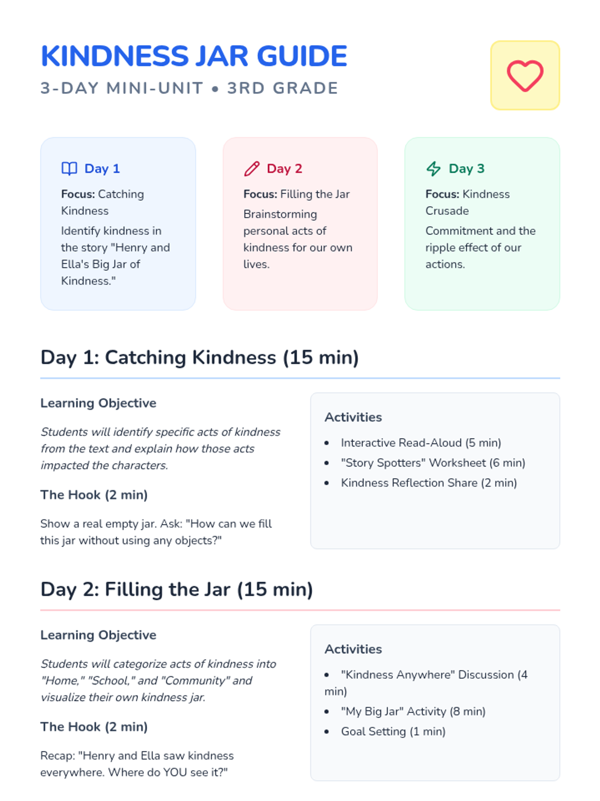 A 3-day sequence for 3rd graders focused on identifying, brainstorming, and practicing acts of kindness inspired by the book 'Henry and Ella's Big Jar of Kindness'.