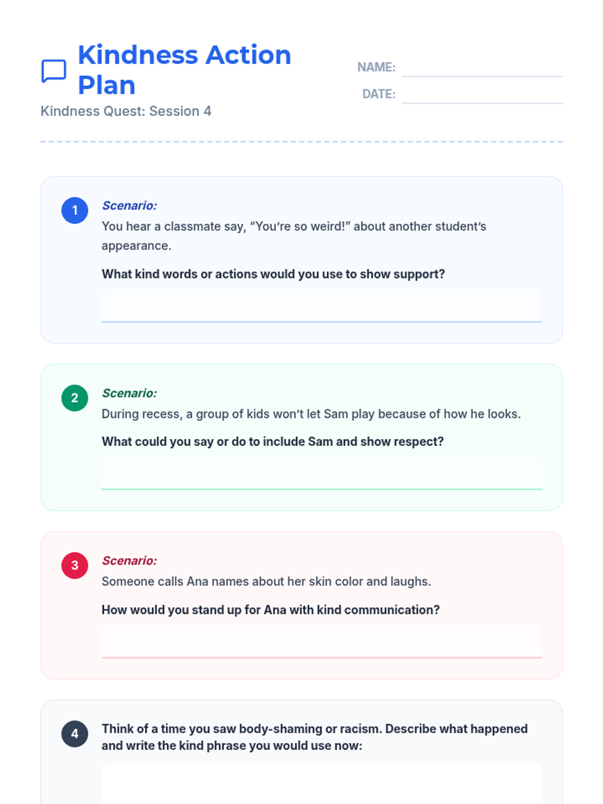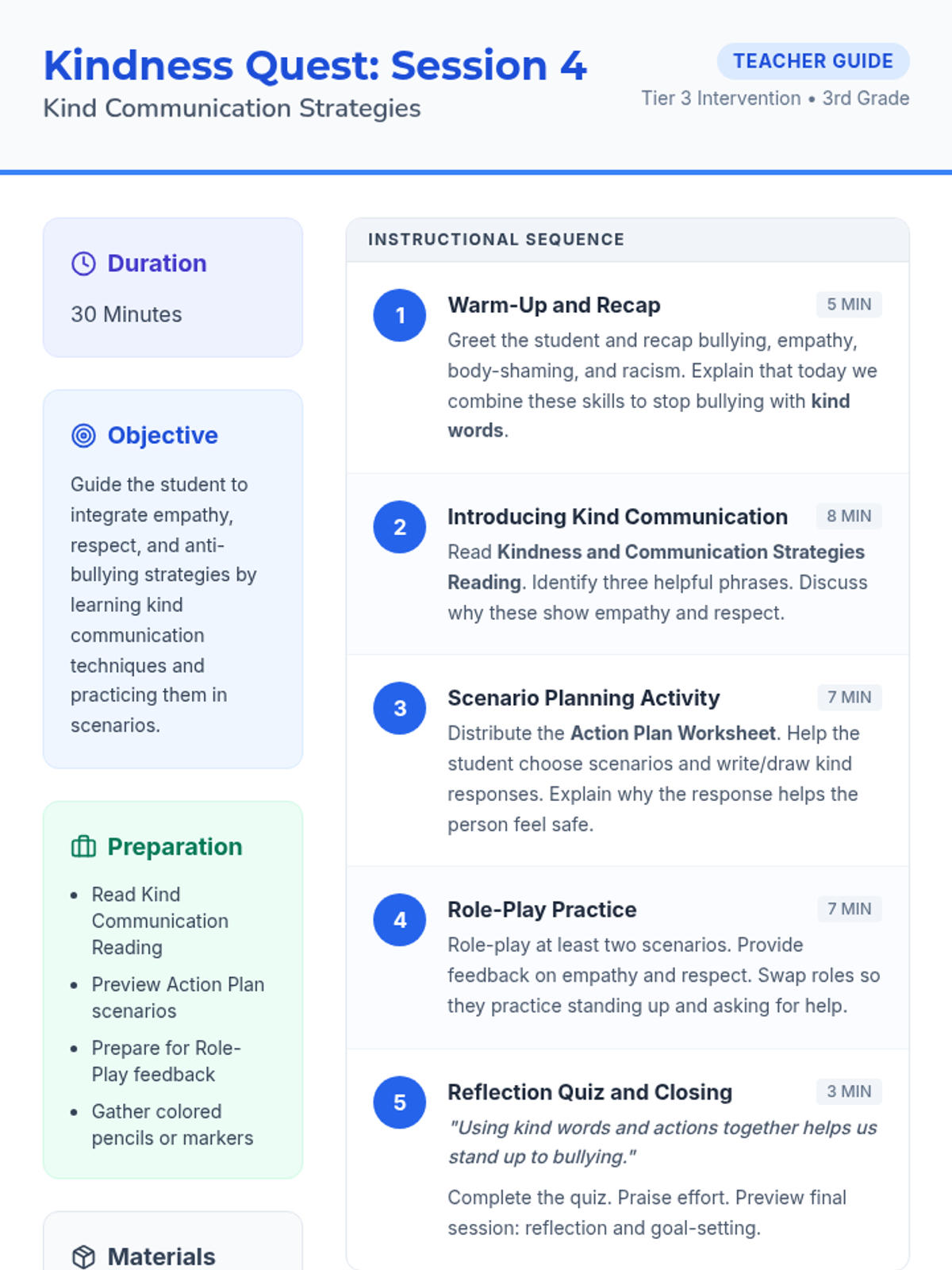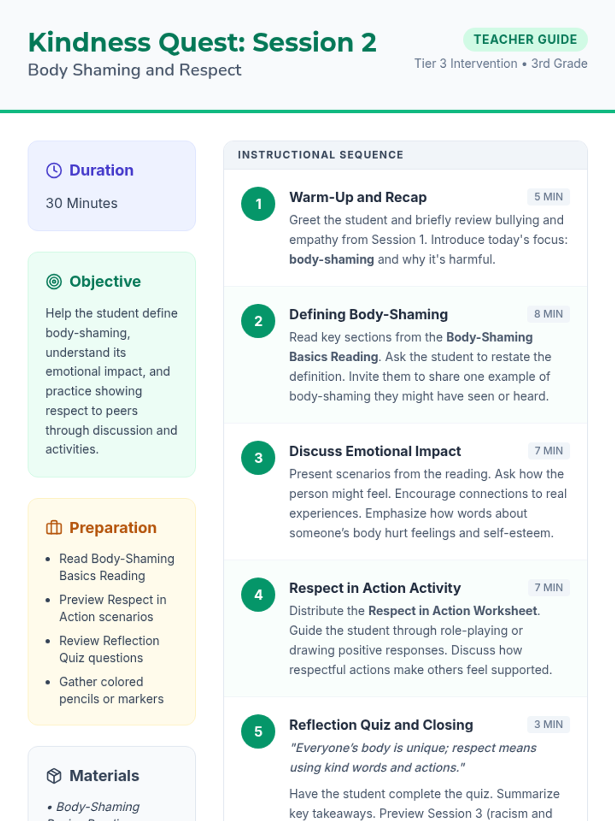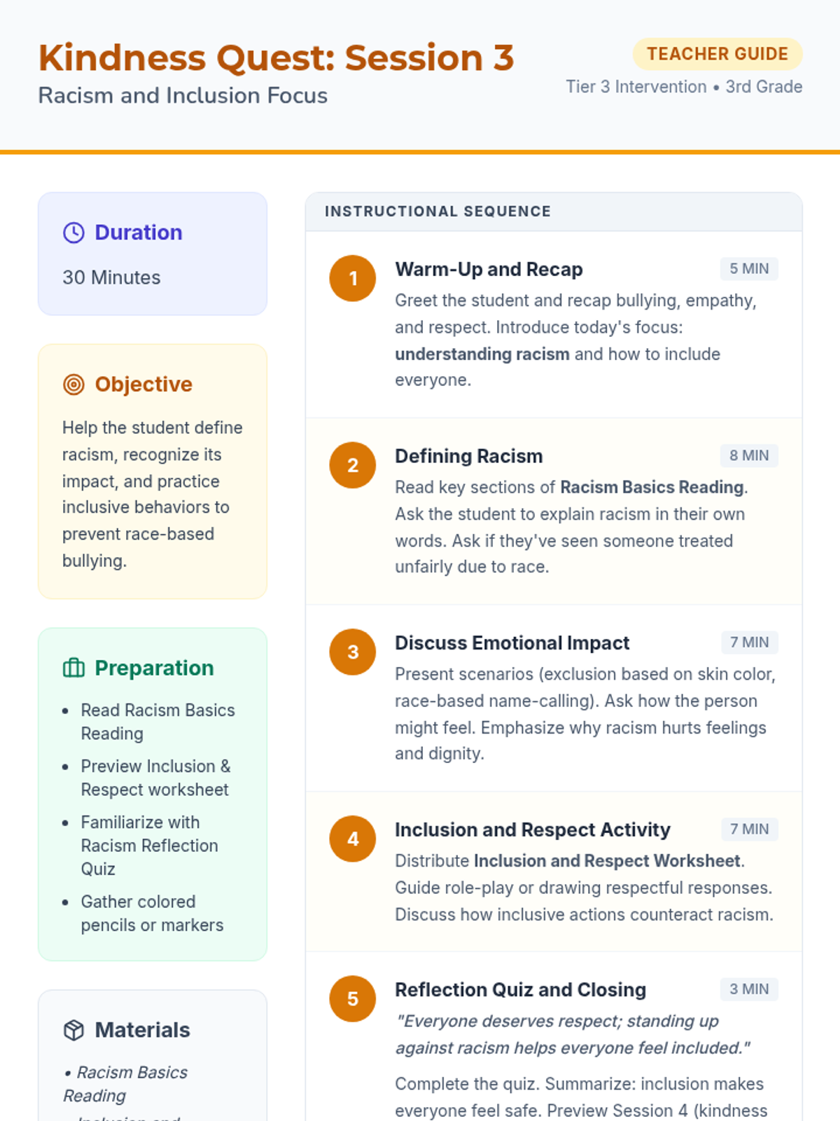 A 5-session individual program for 3rd graders focusing on empathy, respect, and preventing bullying related to race and body-shaming. This series uses interactive readings and reflection to build positive communication skills.