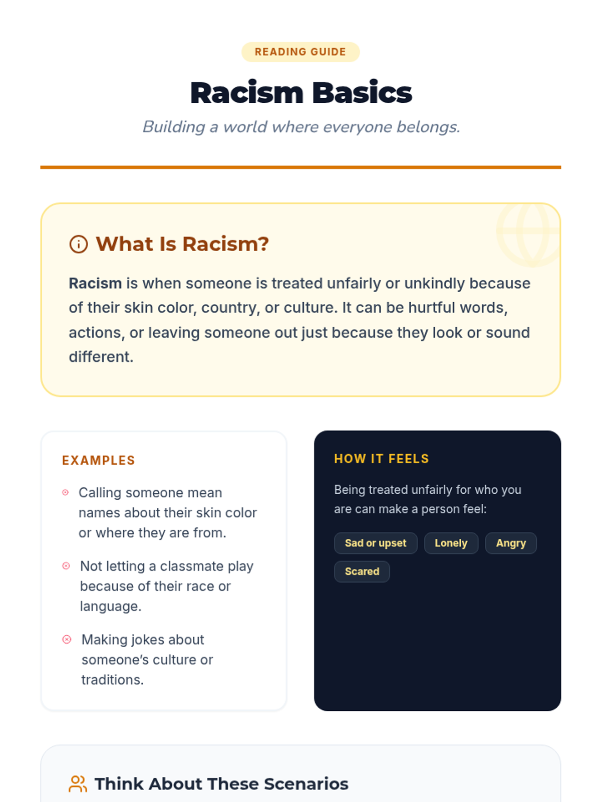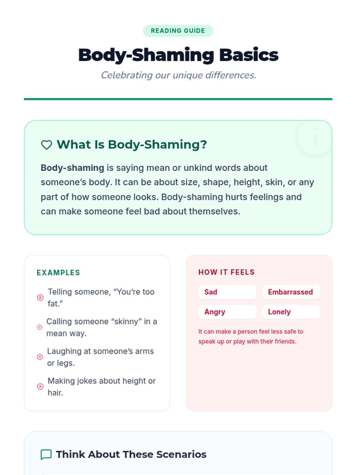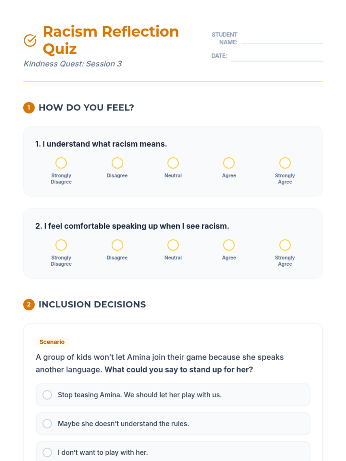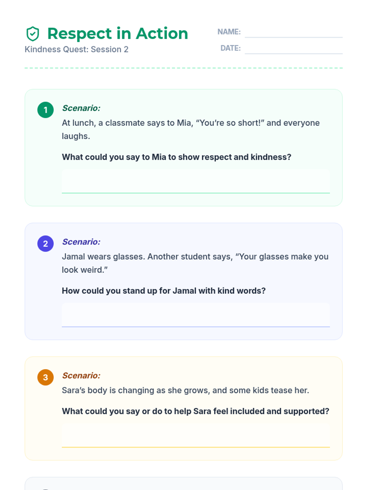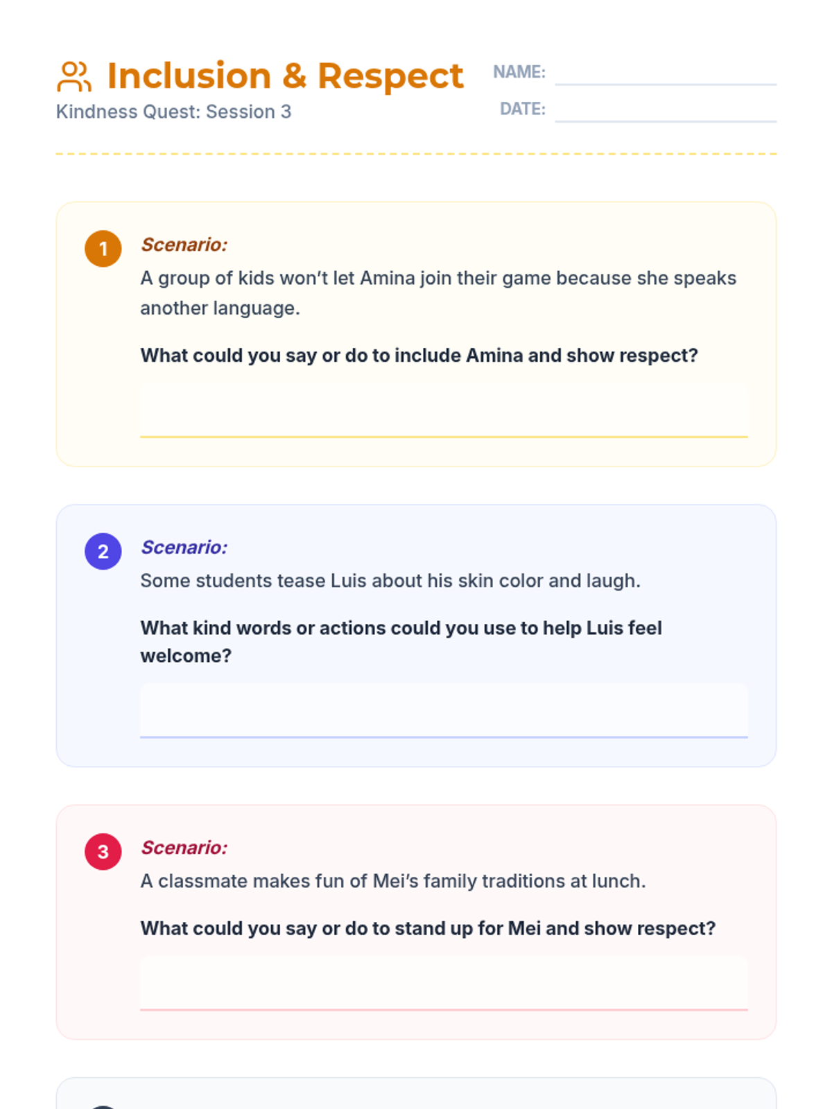 A 5-session individual program for 3rd graders focusing on empathy, respect, and preventing bullying related to race and body-shaming. This series uses interactive readings and reflection to build positive communication skills.