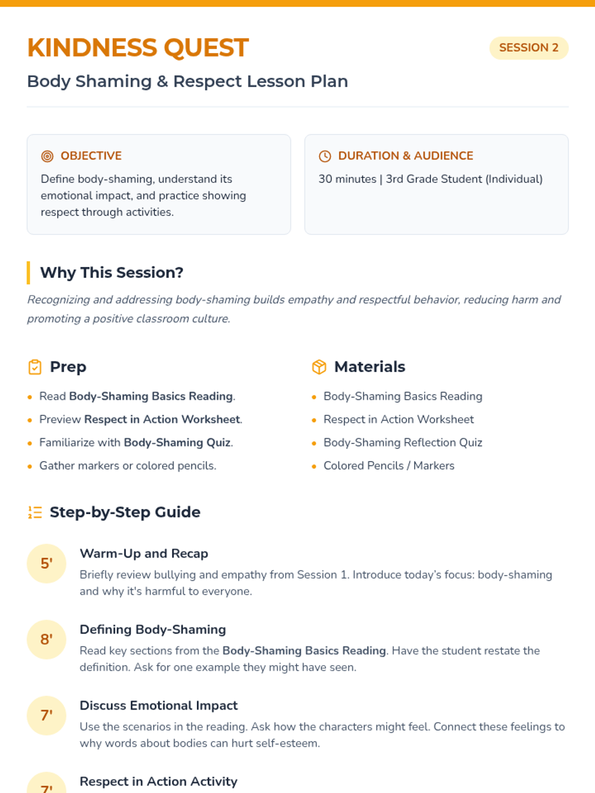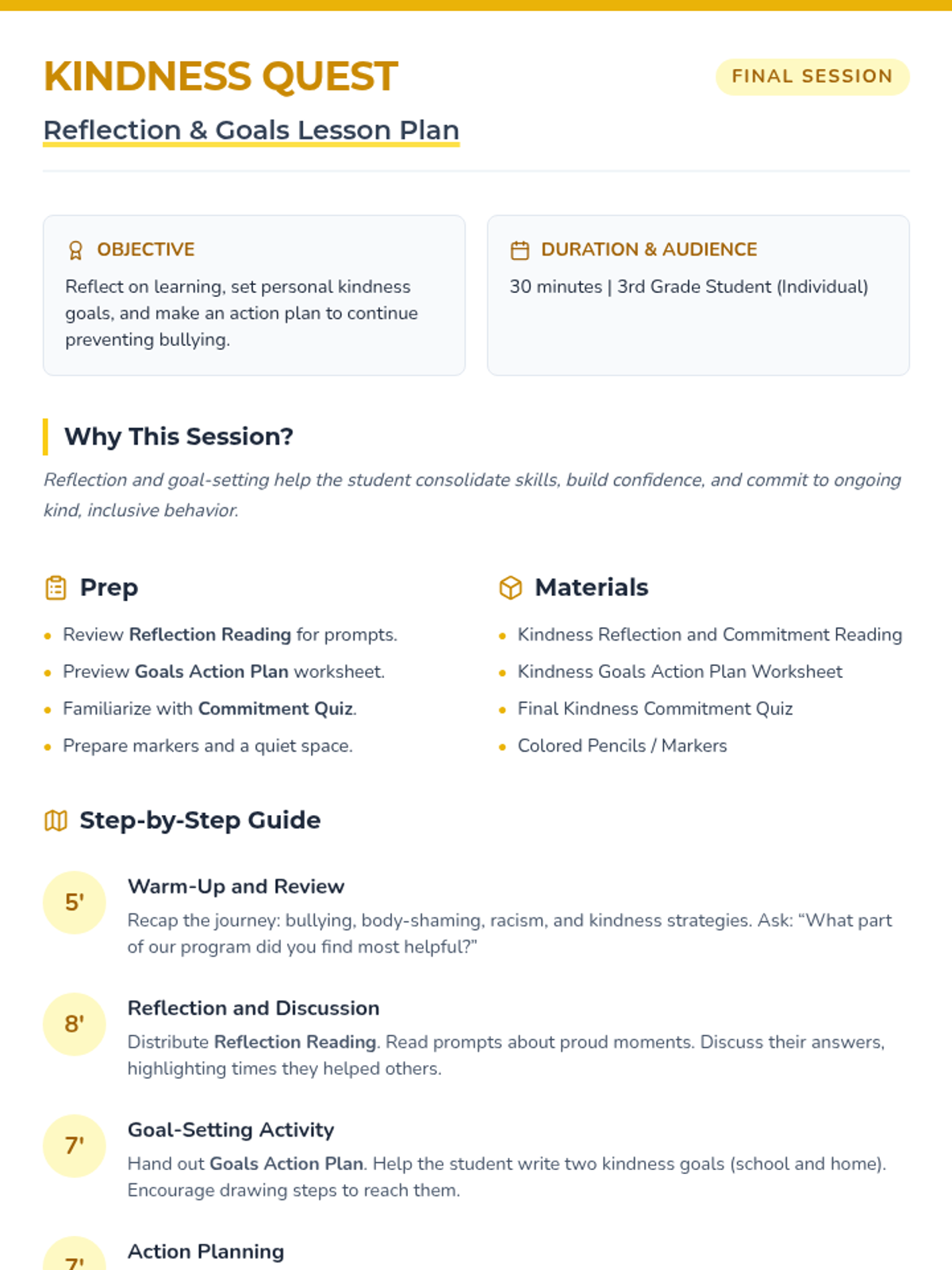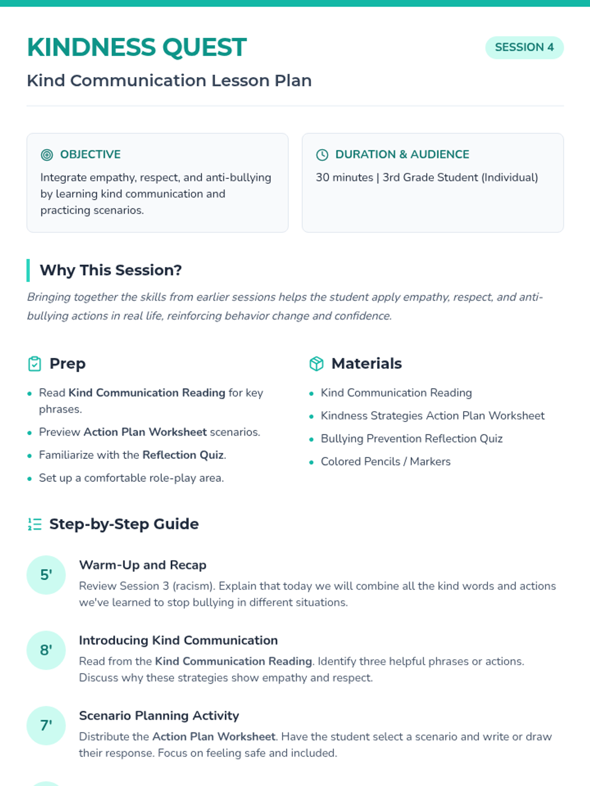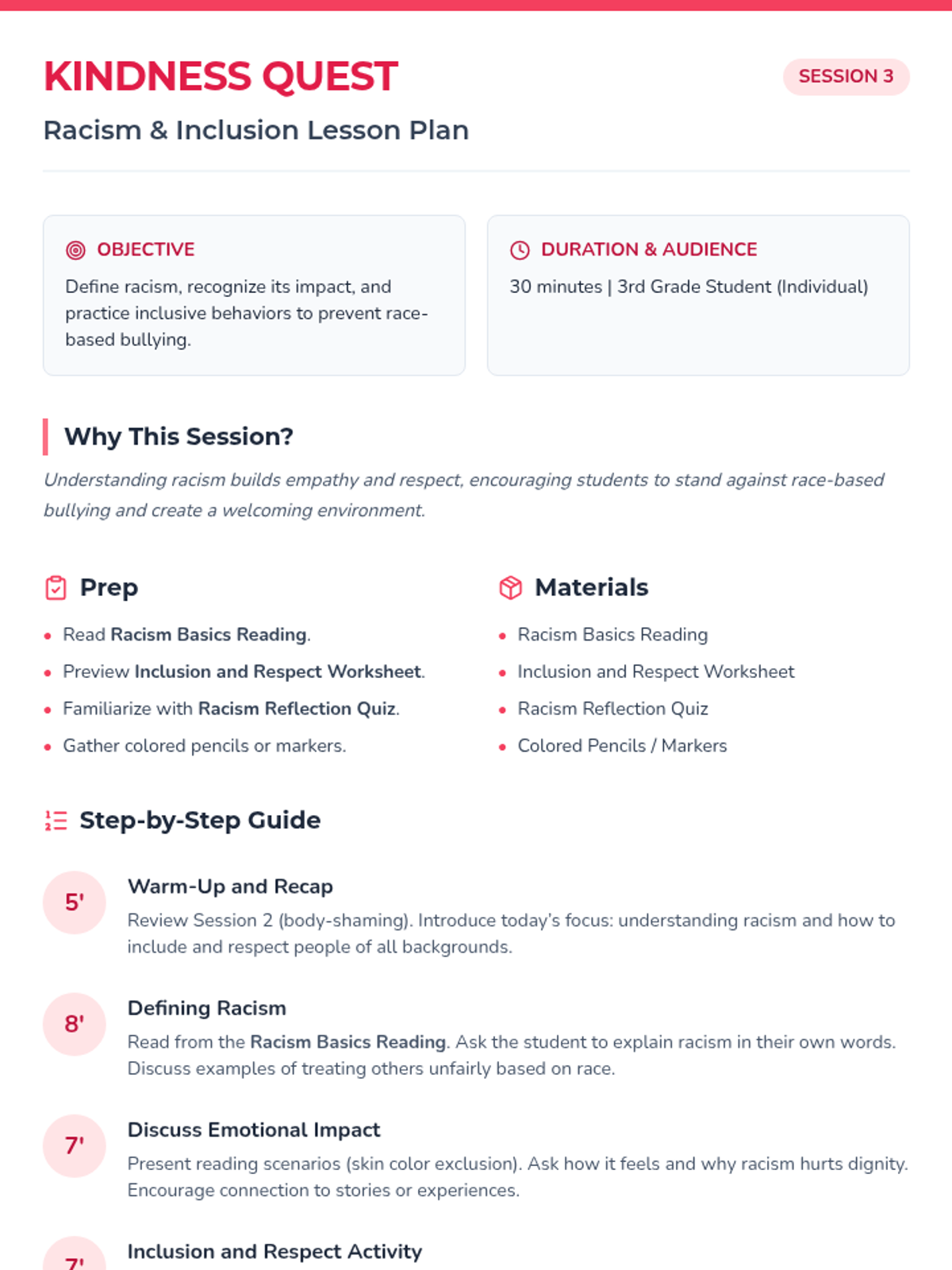 A 5-session individual program for a 3rd grader to understand and prevent bullying, focusing on race and body-shaming. Through readings, activities, and reflections, this series builds empathy, respect, and positive communication skills.