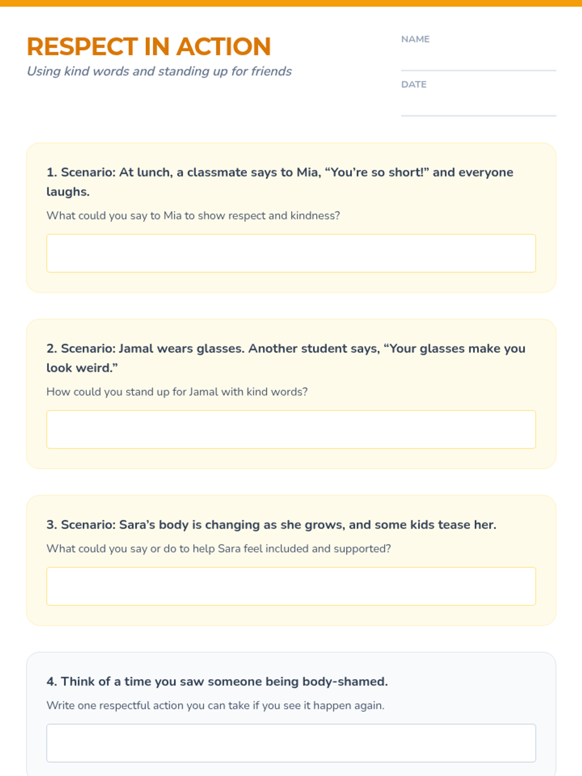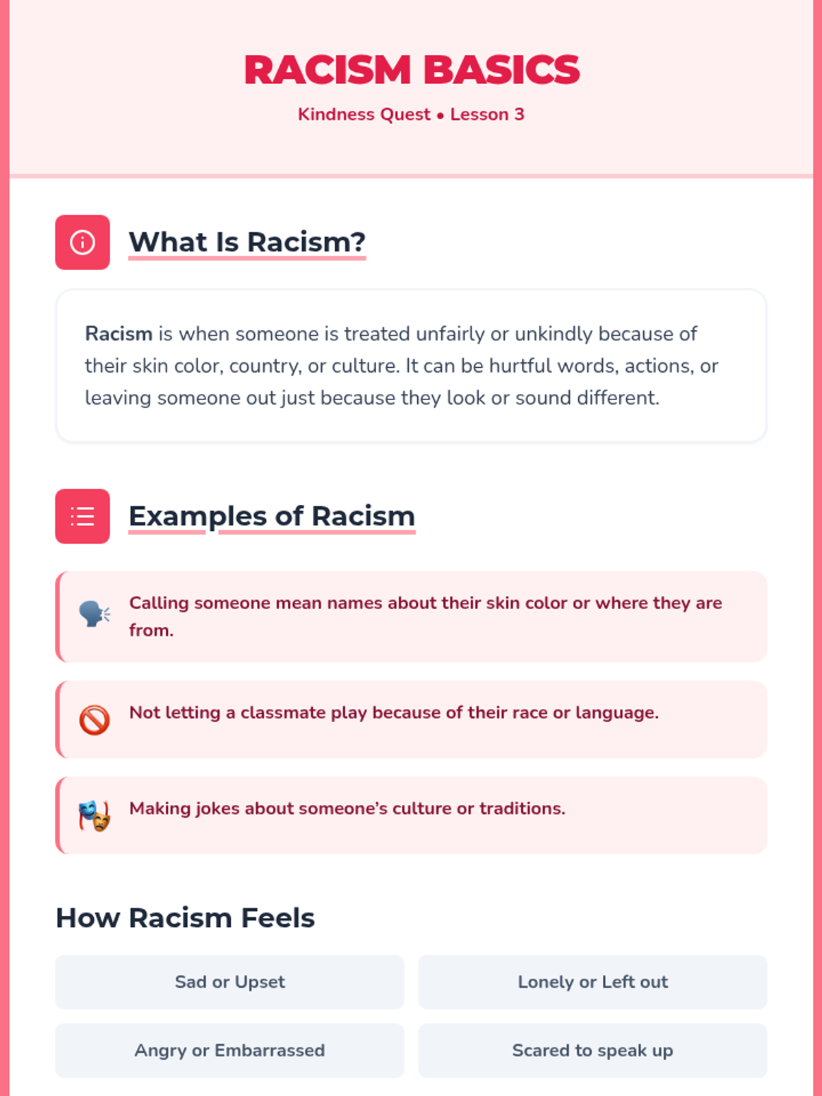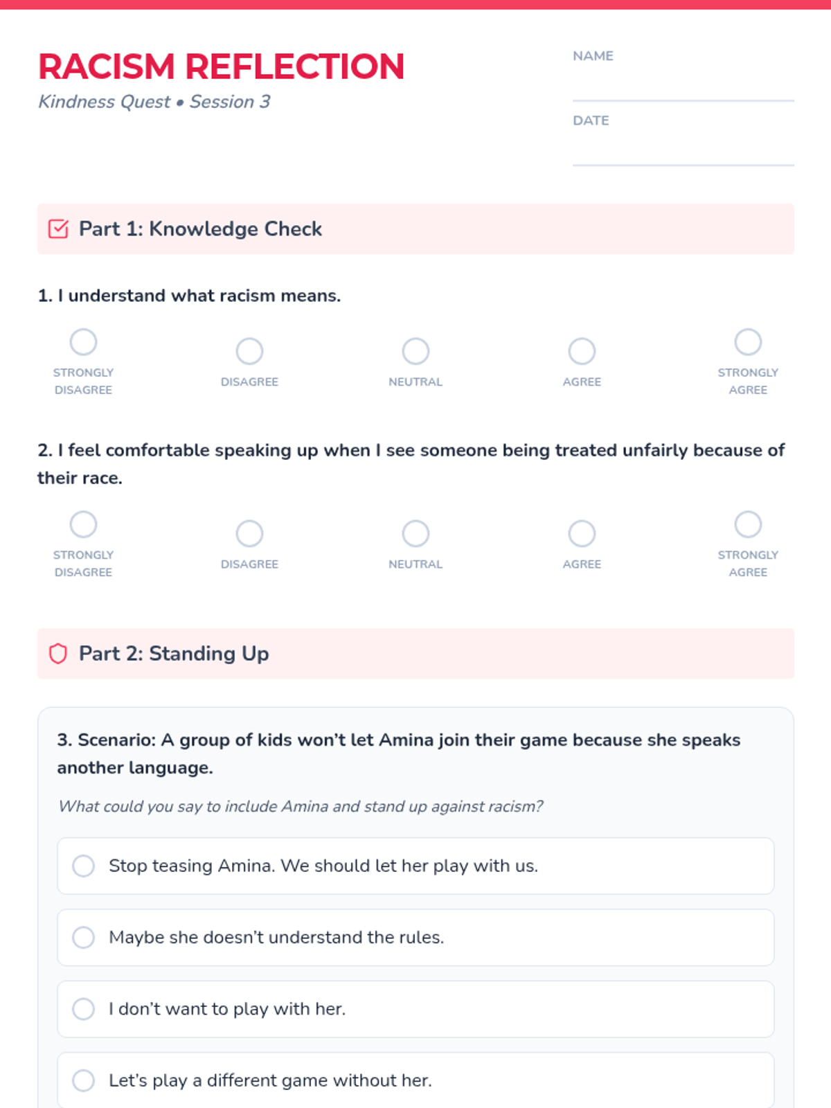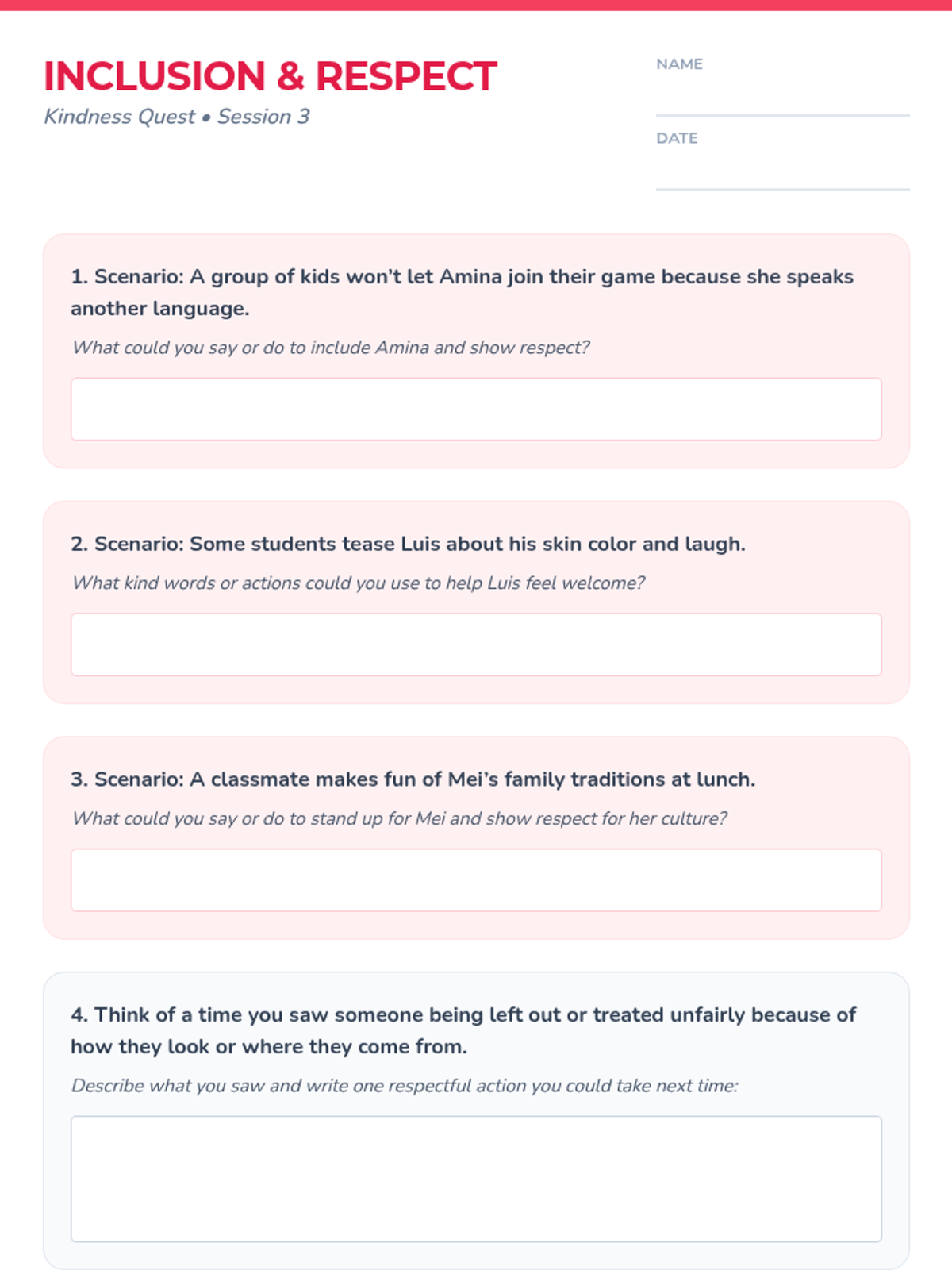A 5-session individual program for a 3rd grader to understand and prevent bullying, focusing on race and body-shaming. Through readings, activities, and reflections, this series builds empathy, respect, and positive communication skills.