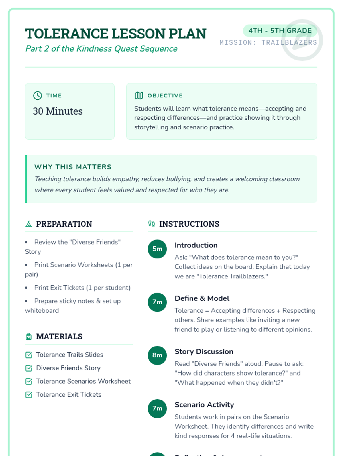 A 6-week Social-Emotional Learning series for fifth graders focused on building empathy, kindness, and assertive communication skills. Rooted in ASCA standards and Conscious Discipline principles, the sequence guides students from understanding self-awareness to creating a classroom culture of inclusion.