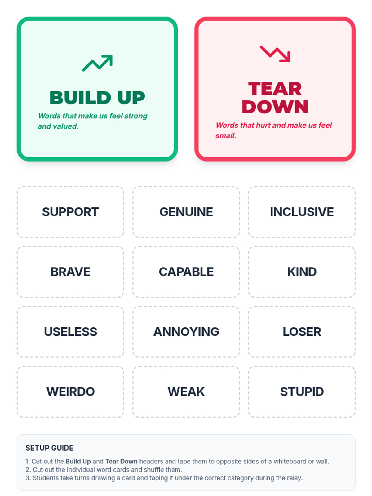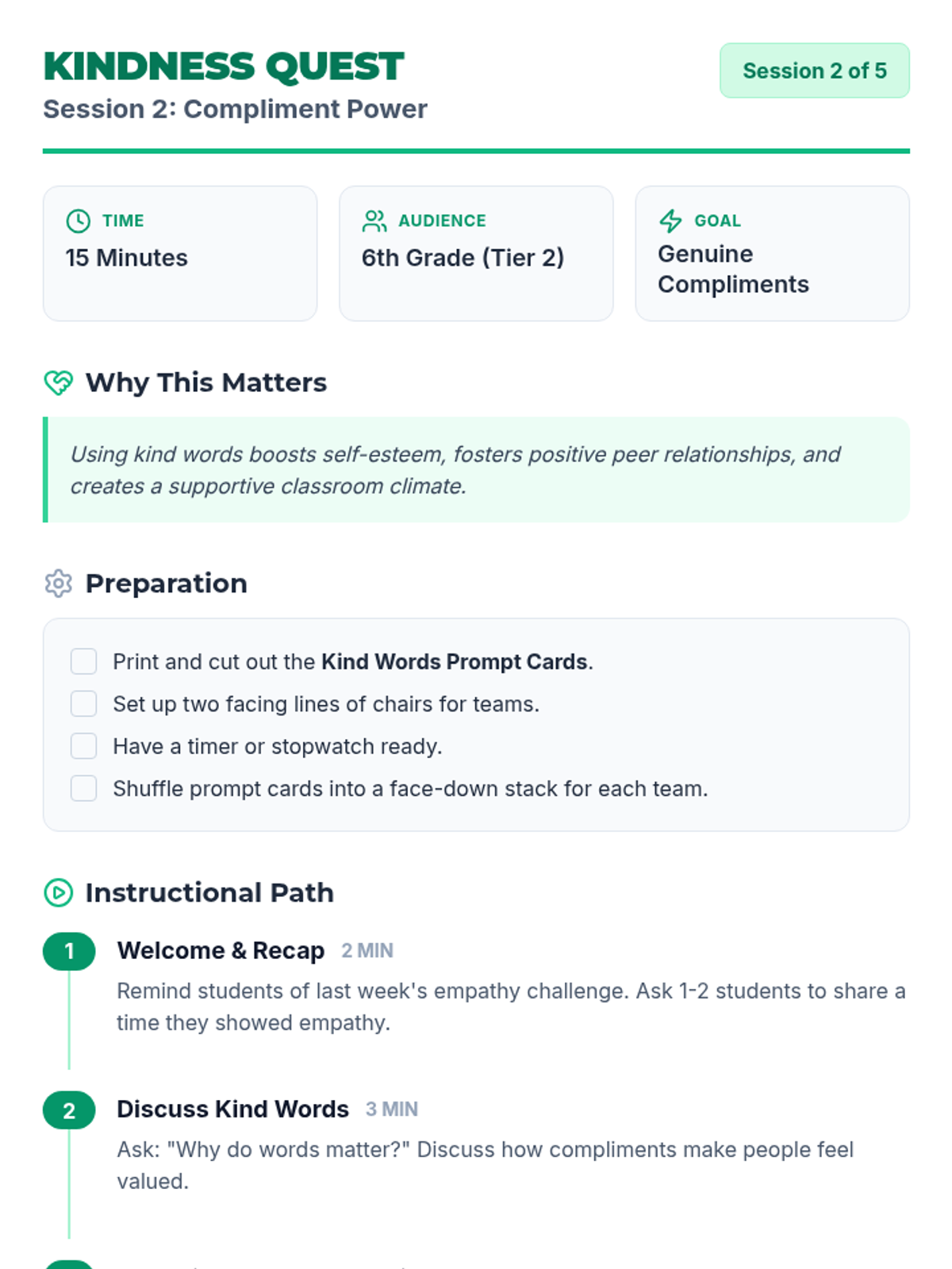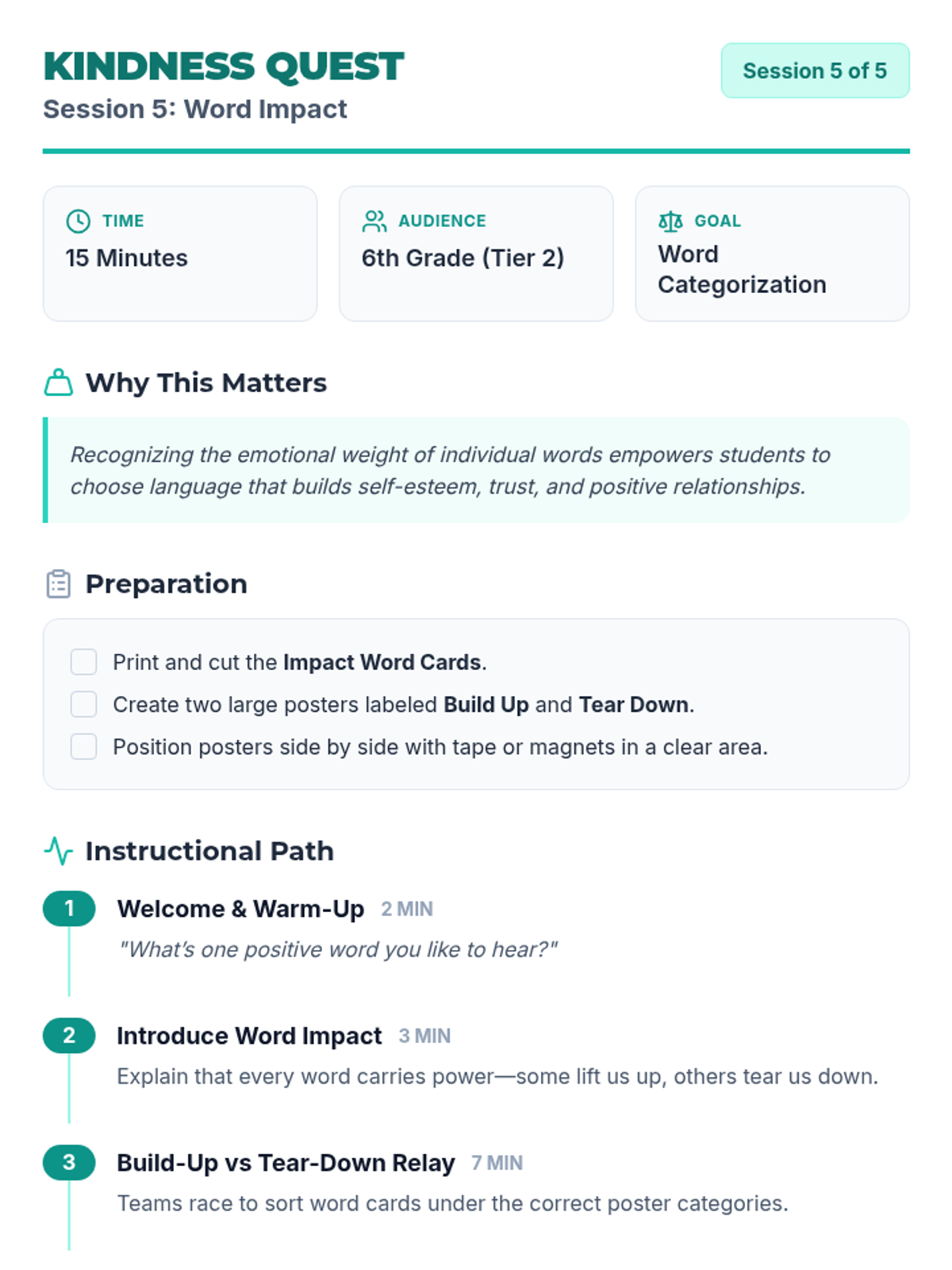 A 5-session mini-course for 6th graders to develop empathy, practice positive communication, and understand the impact of their words through games and guided reflection.