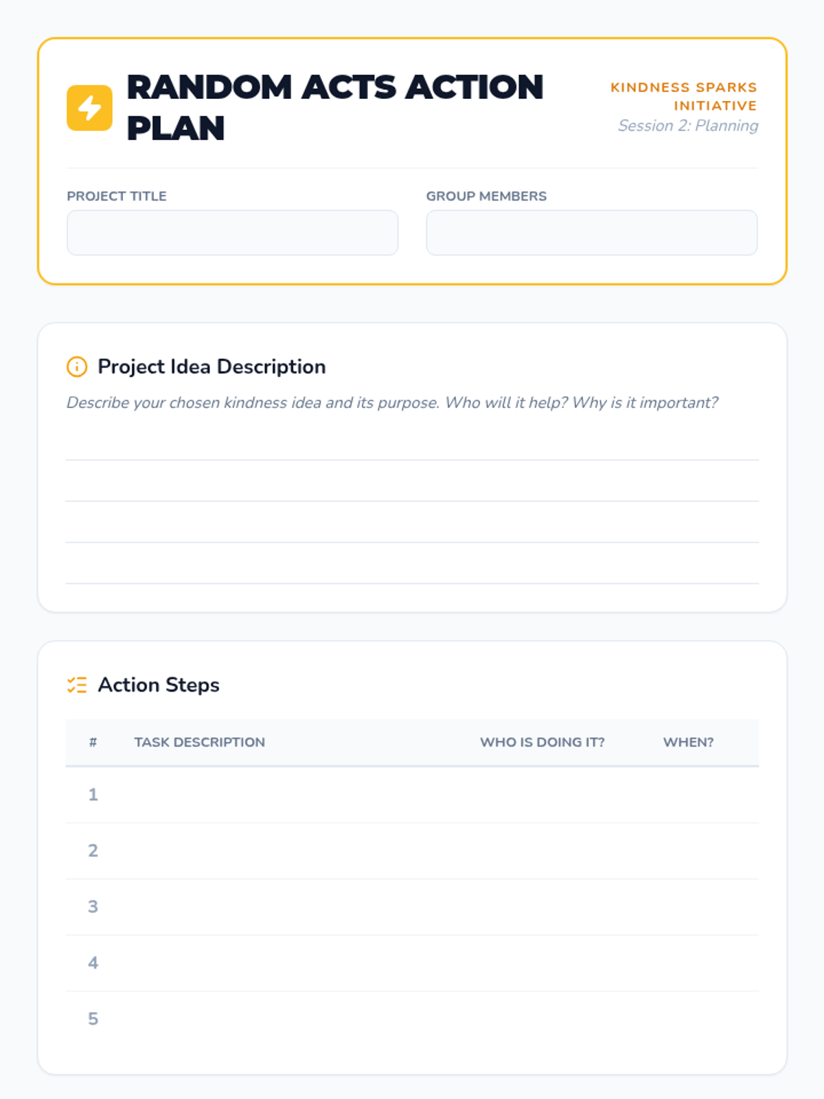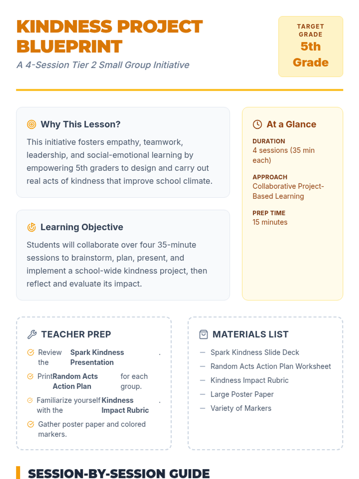 A 4-session small-group initiative for 5th graders to design and implement school-wide kindness projects, fostering empathy and leadership.