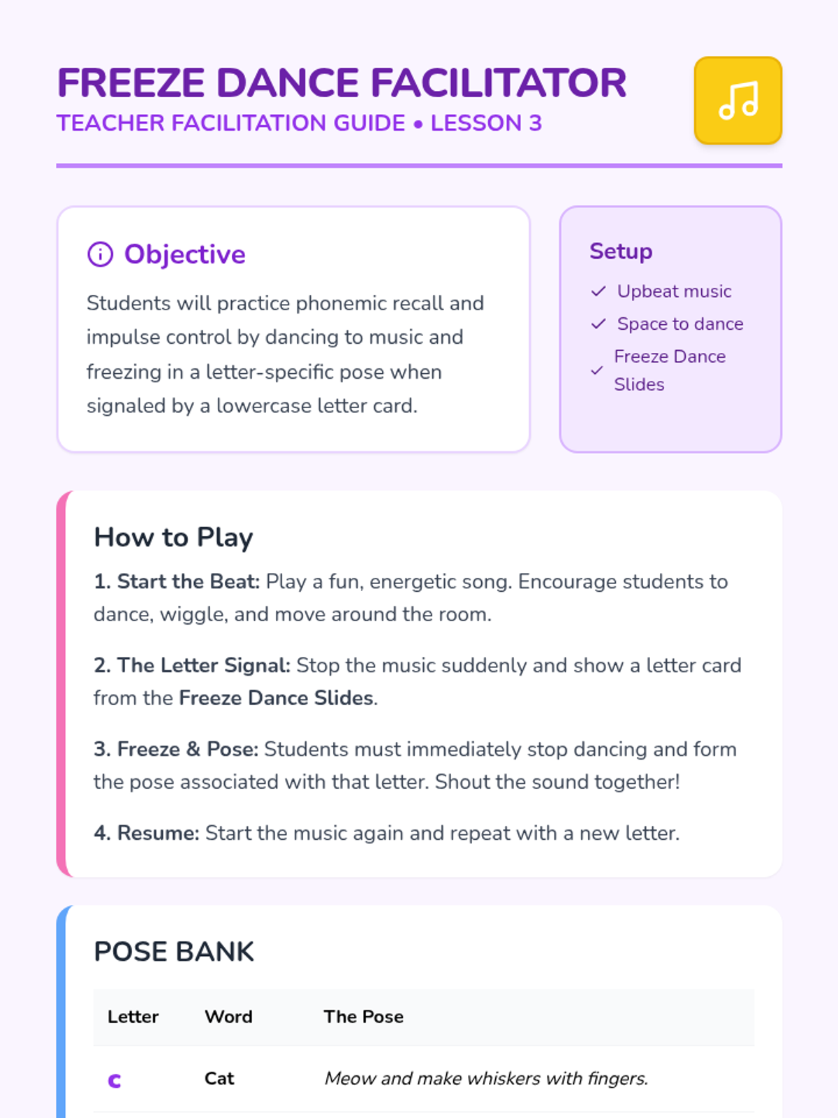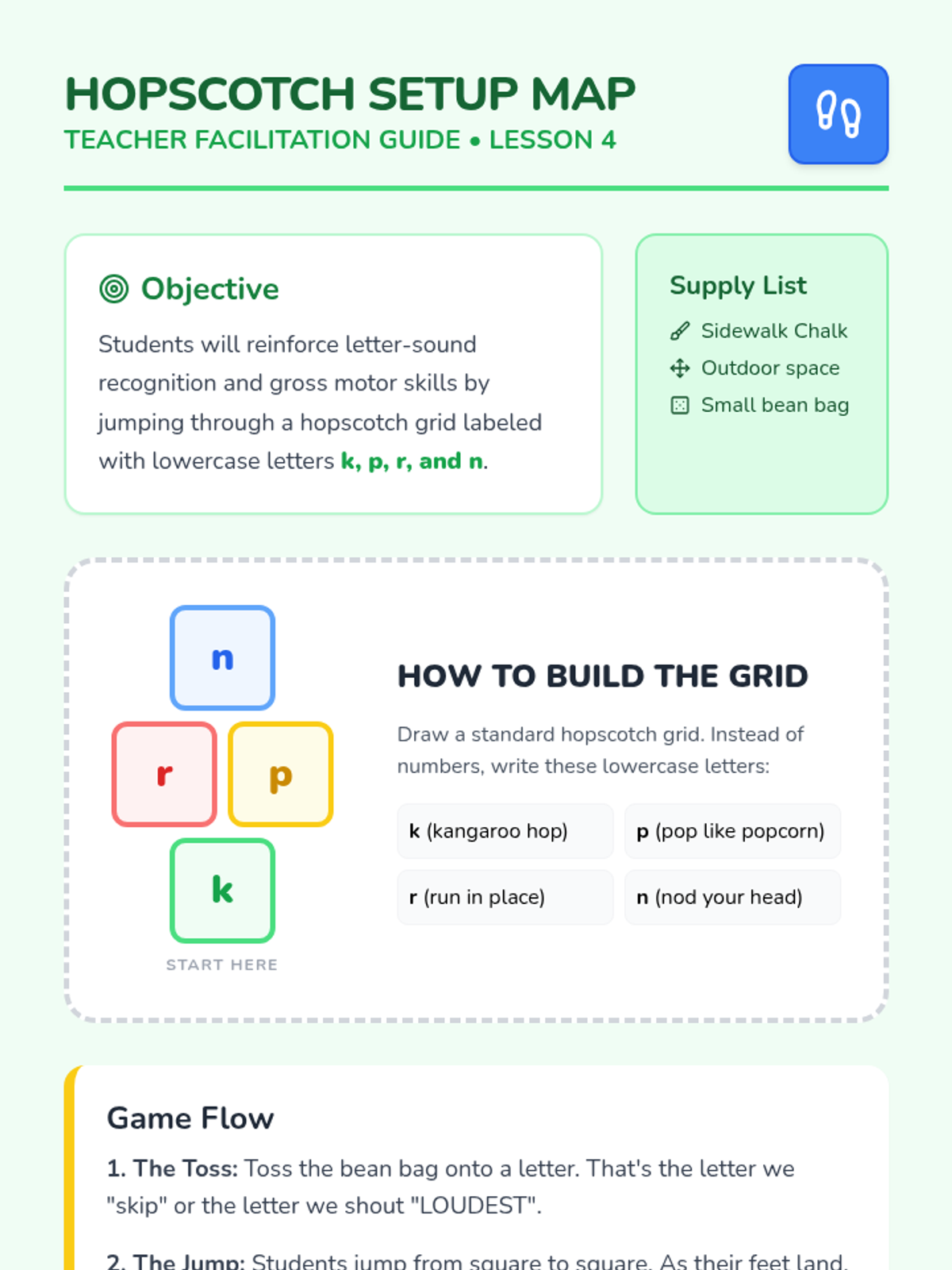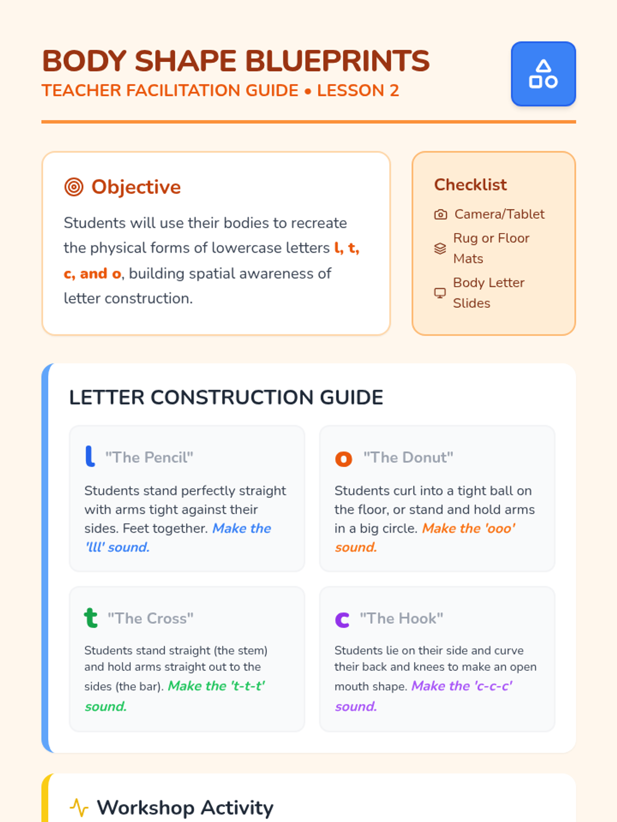 A kinesthetic simulation-based sequence for Pre-K students to learn lowercase letter-sound associations through full-body movement and play. Students move from animal mimicry to body-forming letters, culminating in an action-based story circle.