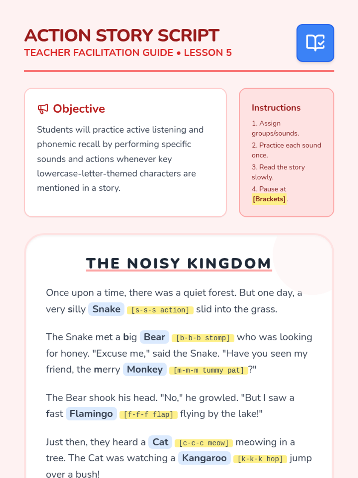 A comprehensive Pre-K sequence focused on phonemic awareness and articulation of the short /a/ sound. Students explore mouth mechanics, isolate initial and medial sounds, and practice oral blending through multi-sensory activities.