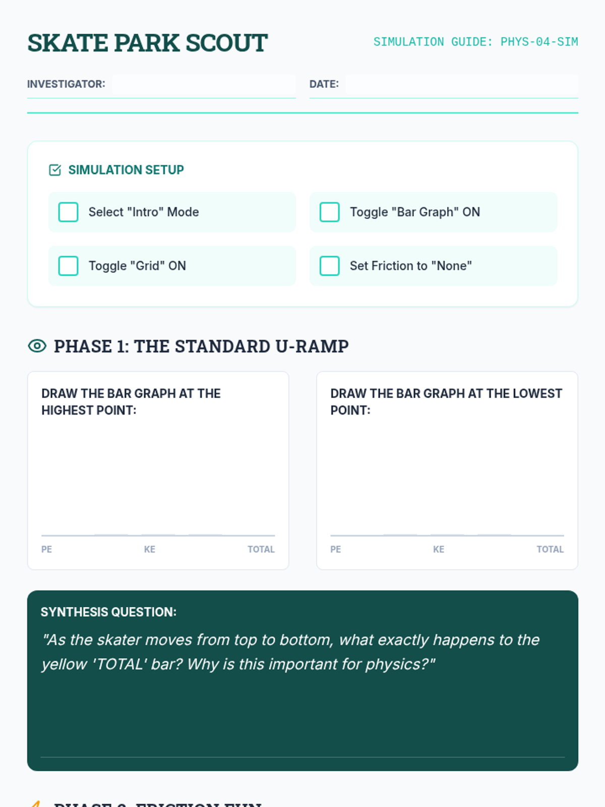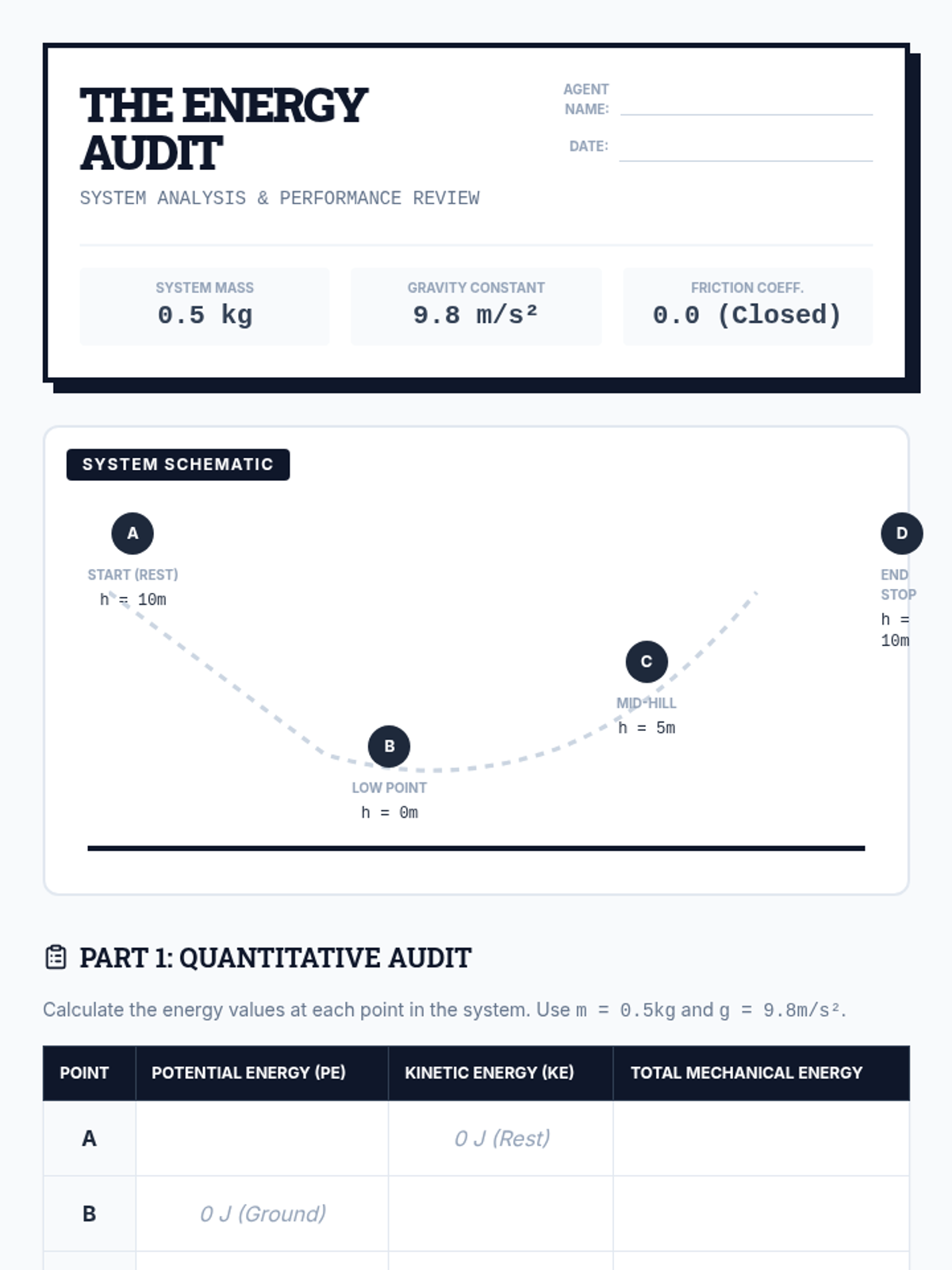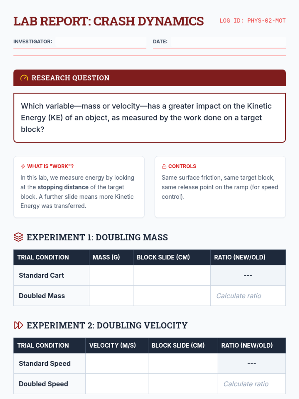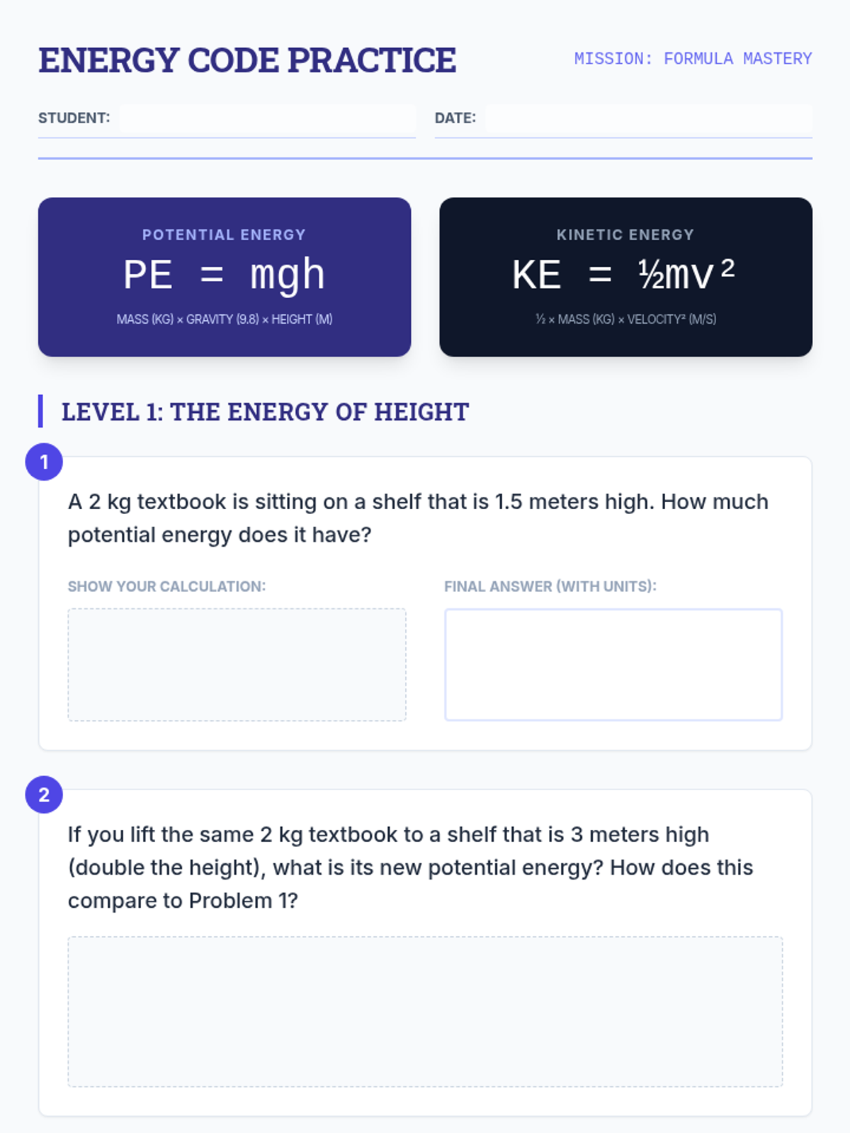 An inquiry-based sequence exploring the variables of mass, height, and velocity and their relationship to Gravitational Potential Energy and Kinetic Energy. Students move from qualitative lab observations to quantitative formula applications.