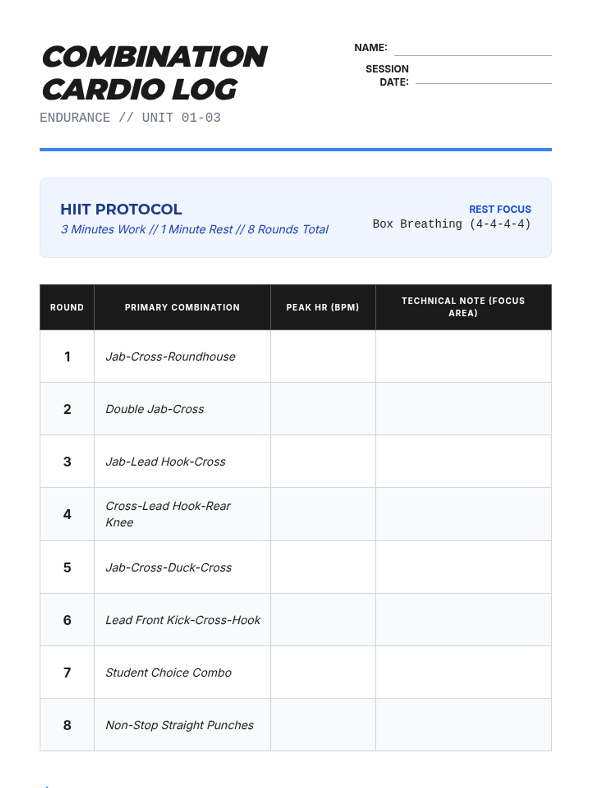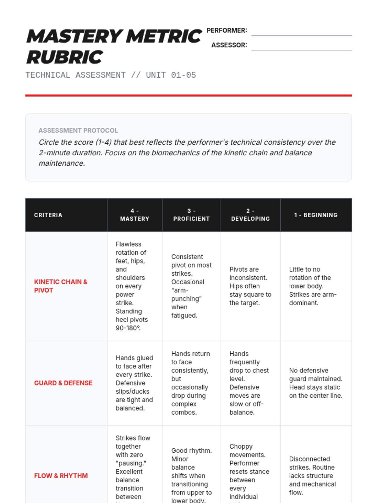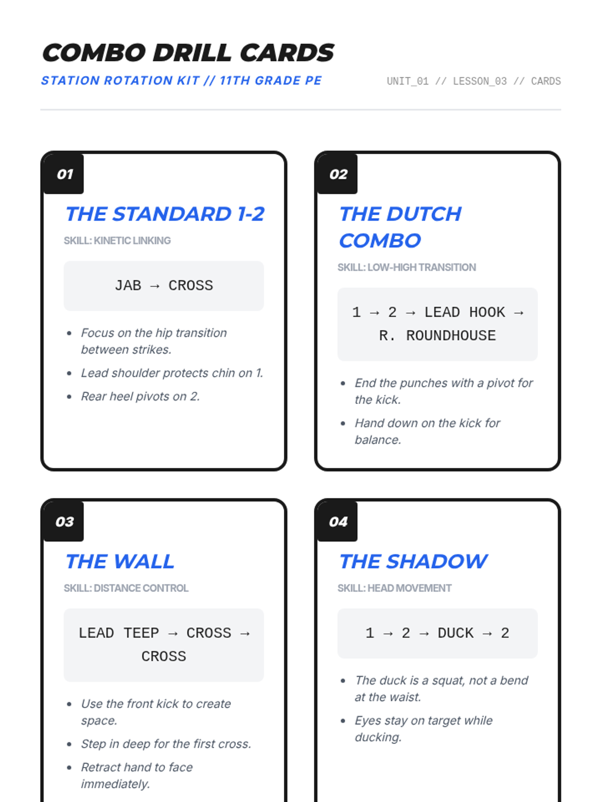 A biomechanics-focused martial arts sequence for 11th graders, exploring the kinetic chain, striking mechanics, and cardiovascular conditioning. Students progress from foundational straight punches to complex combinations and defensive maneuvers, culminating in a technical performance showcase.