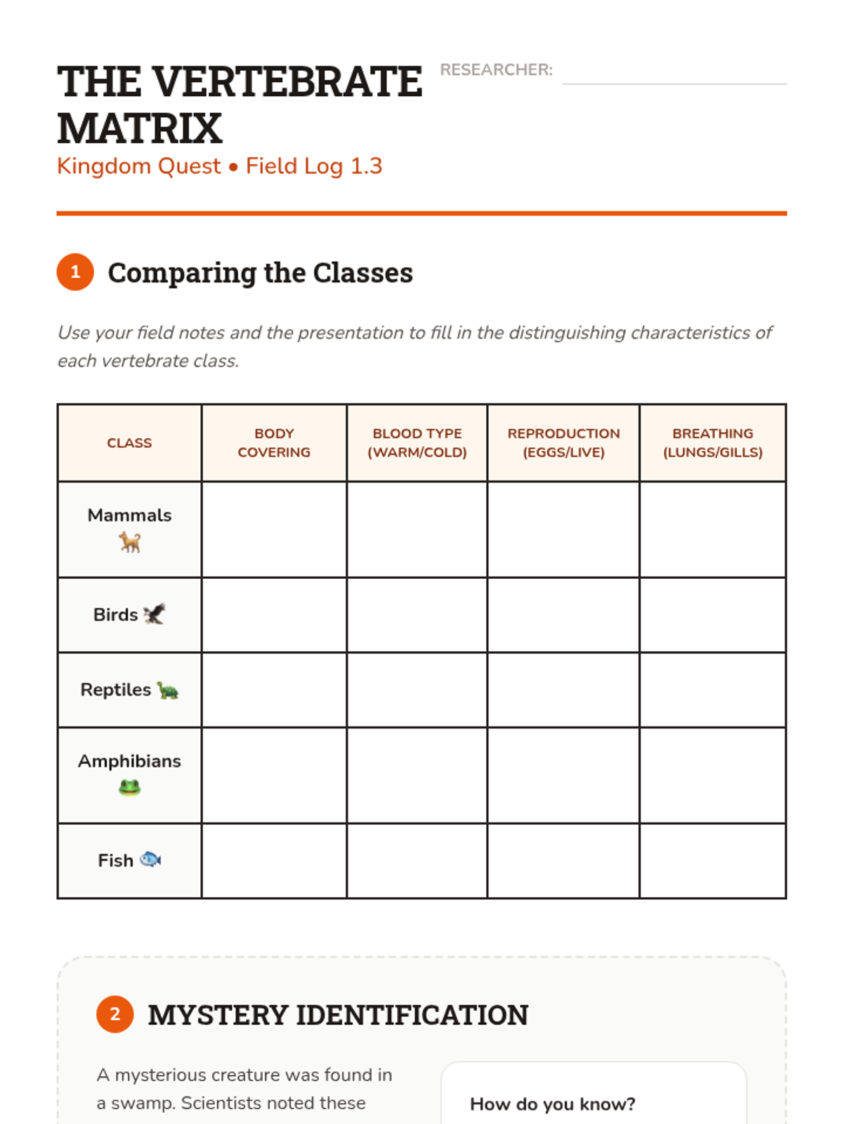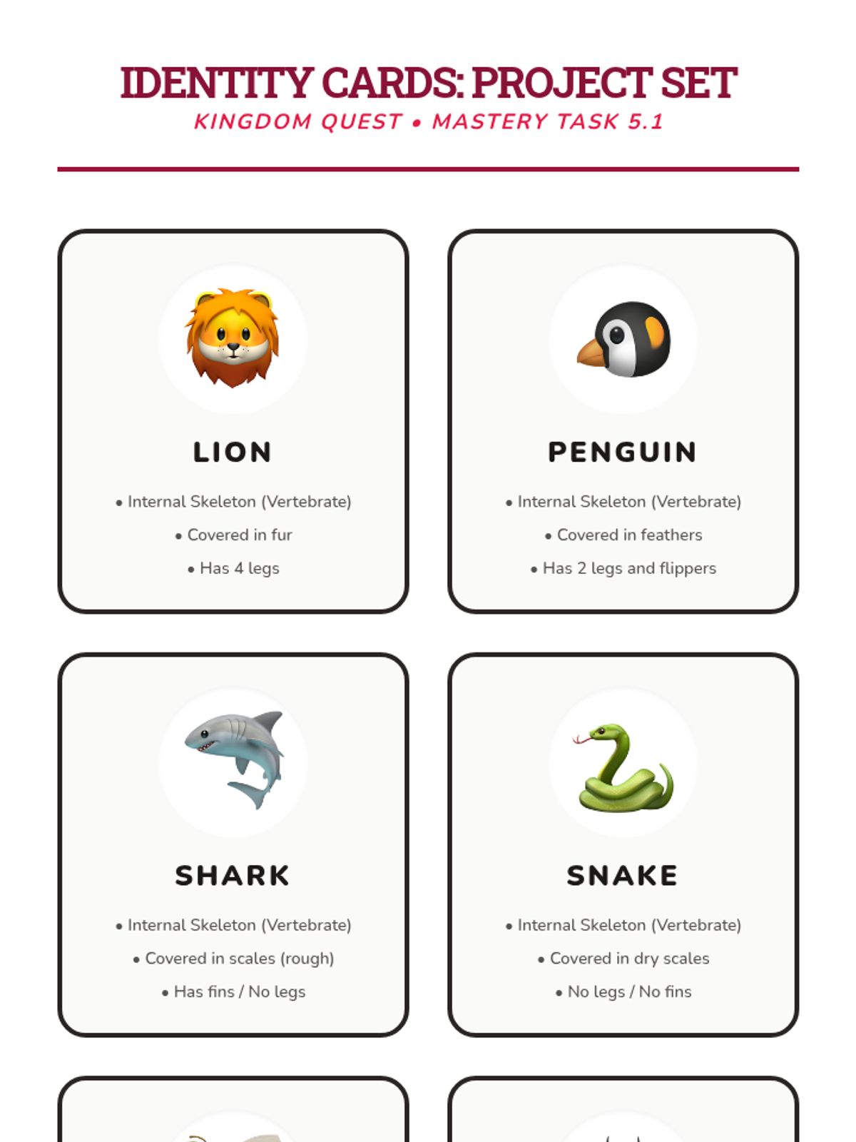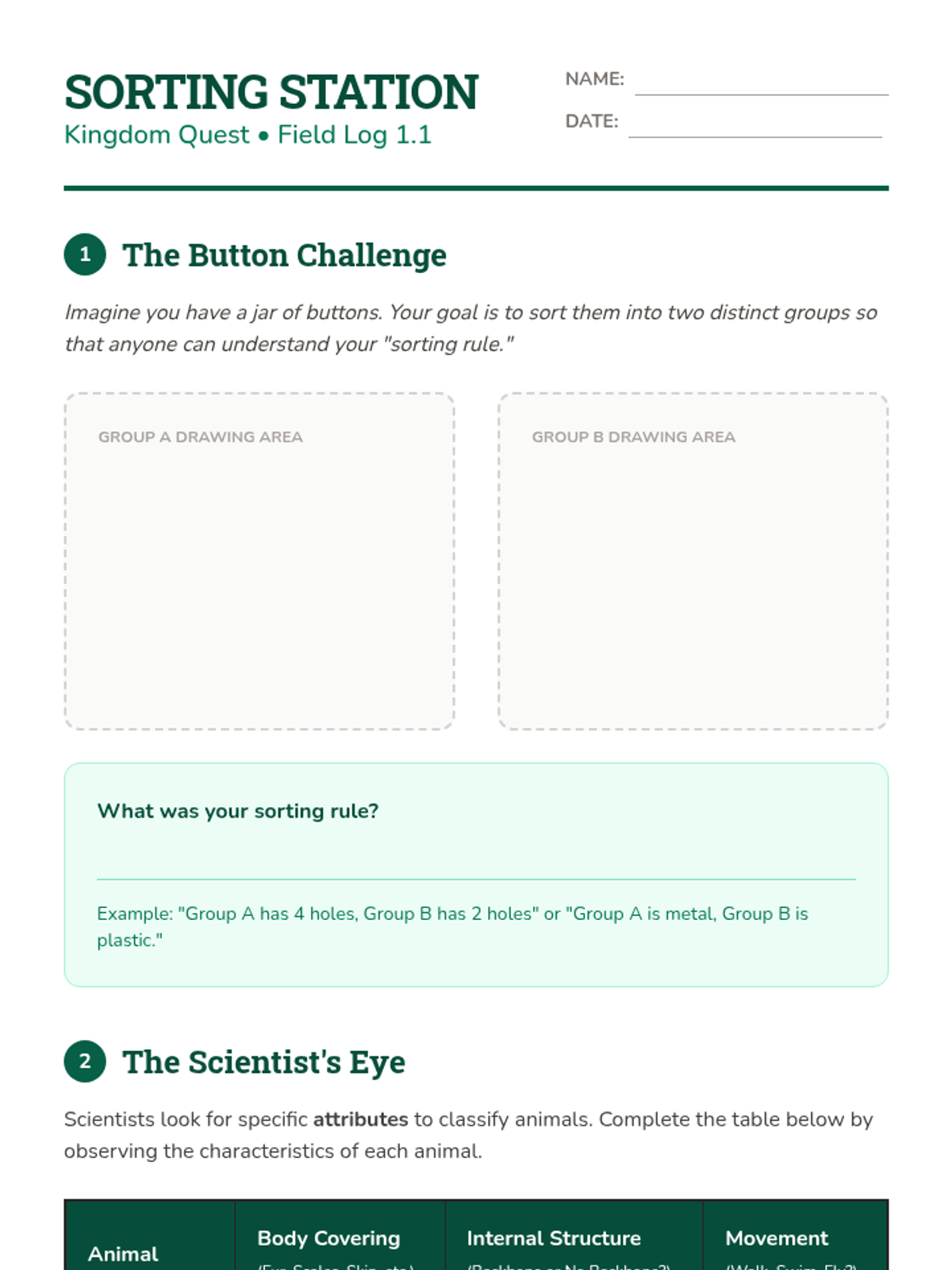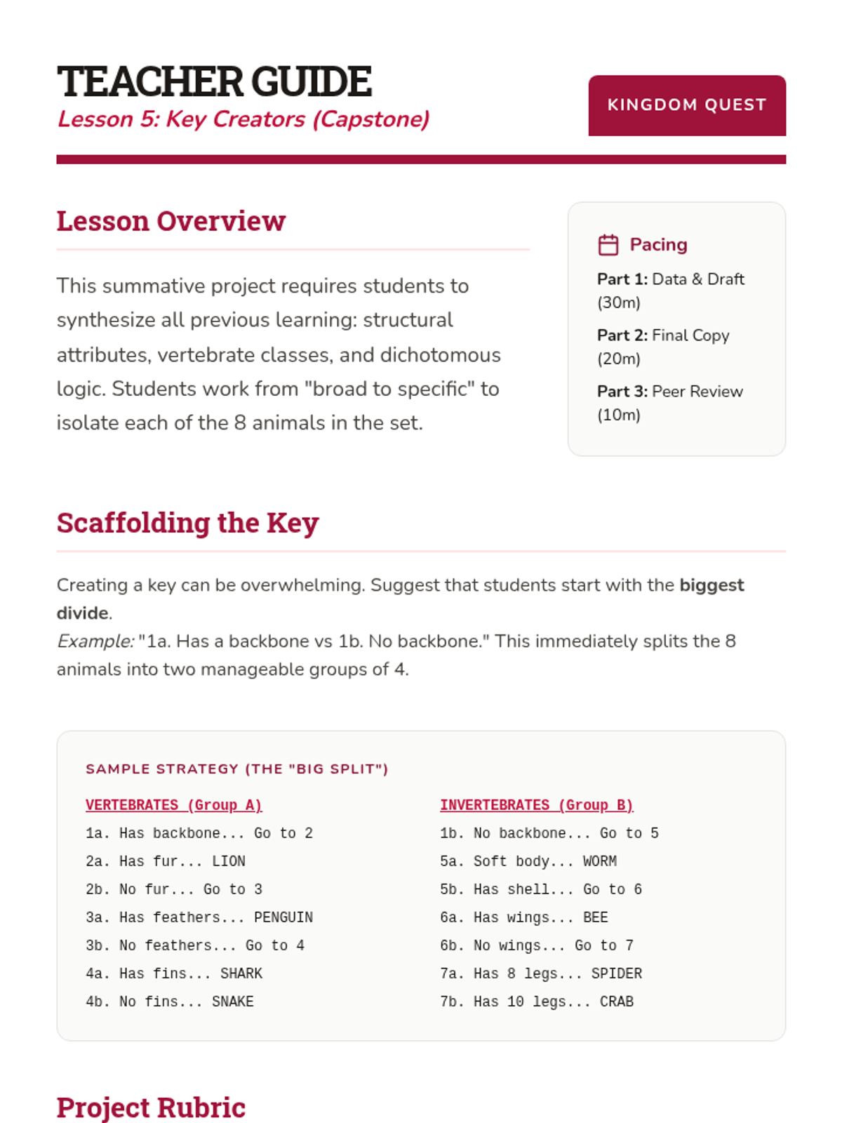 A comprehensive 5th-grade unit exploring the systematic organization of animals. Students progress from basic sorting to mastering dichotomous keys, focusing on the structural differences between vertebrates and invertebrates and the five major vertebrate groups.