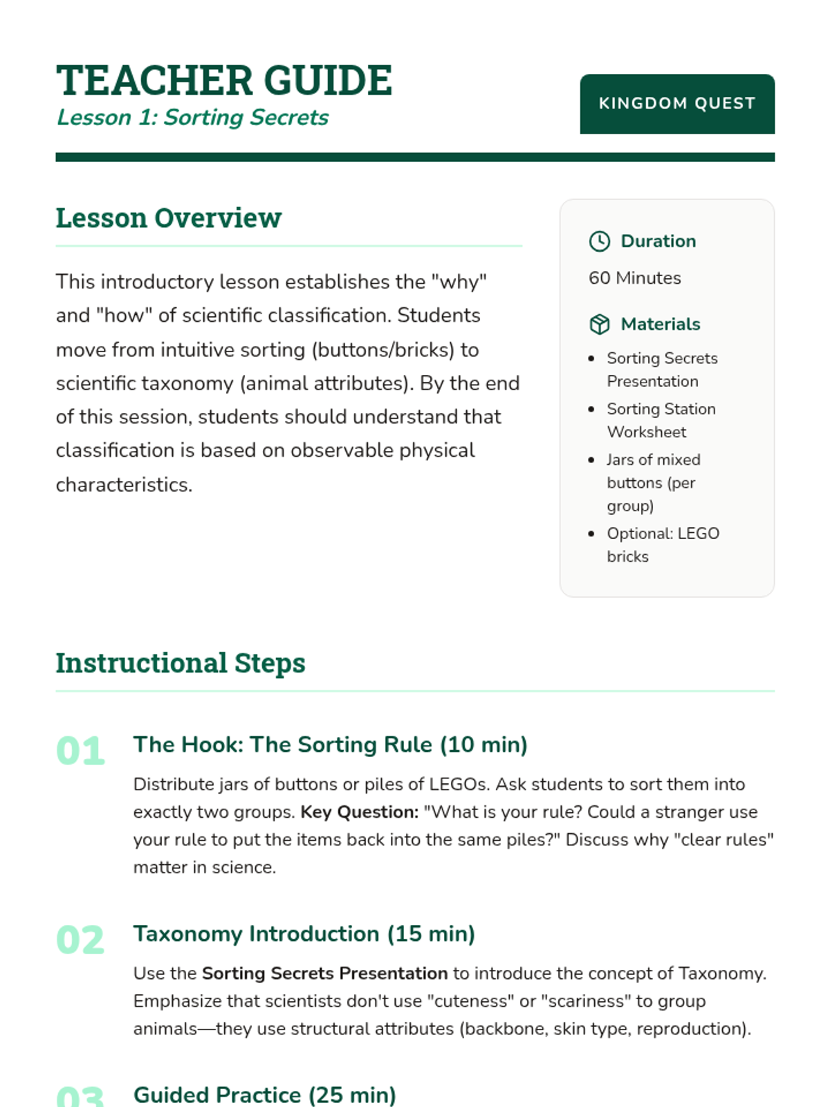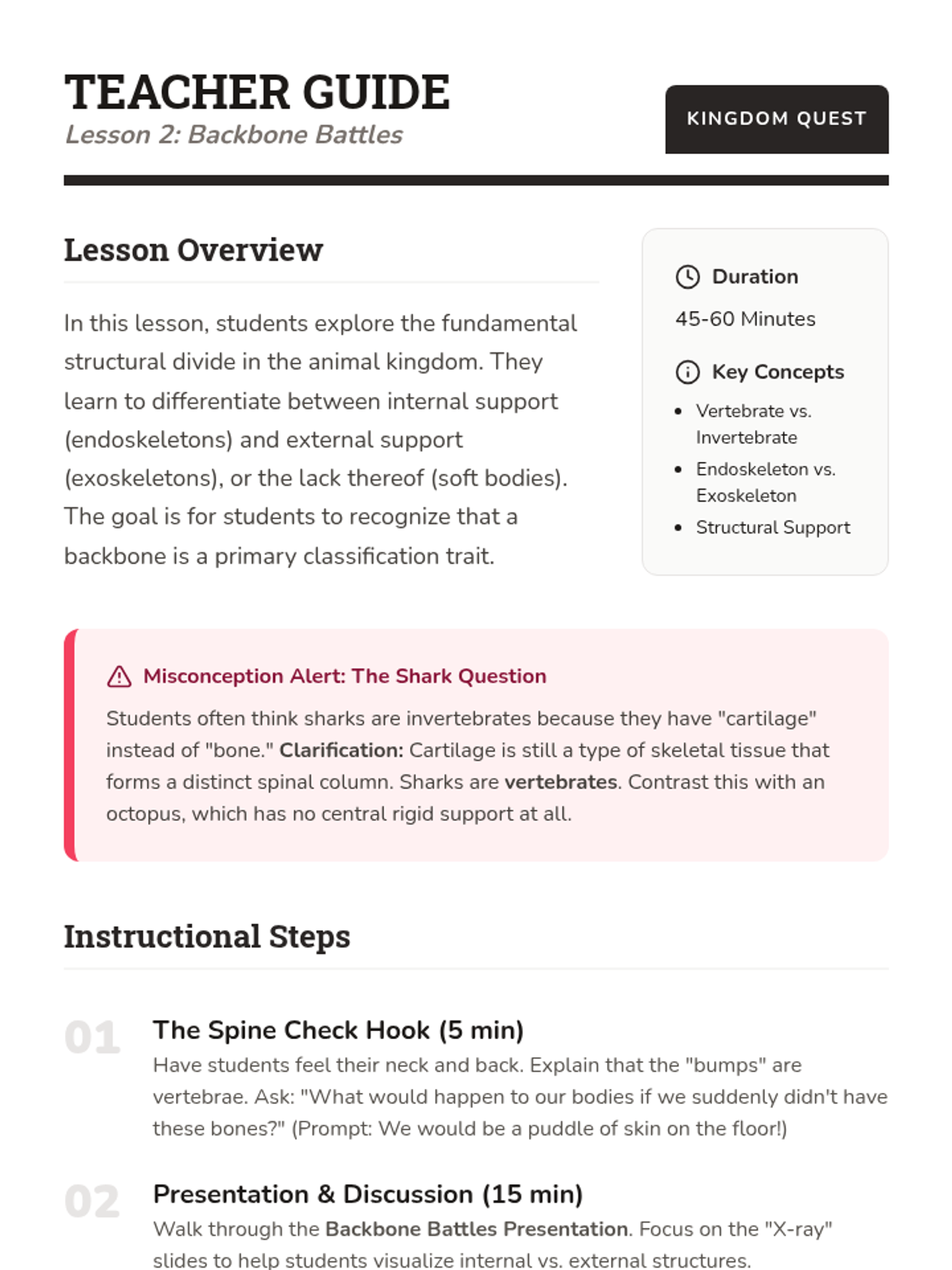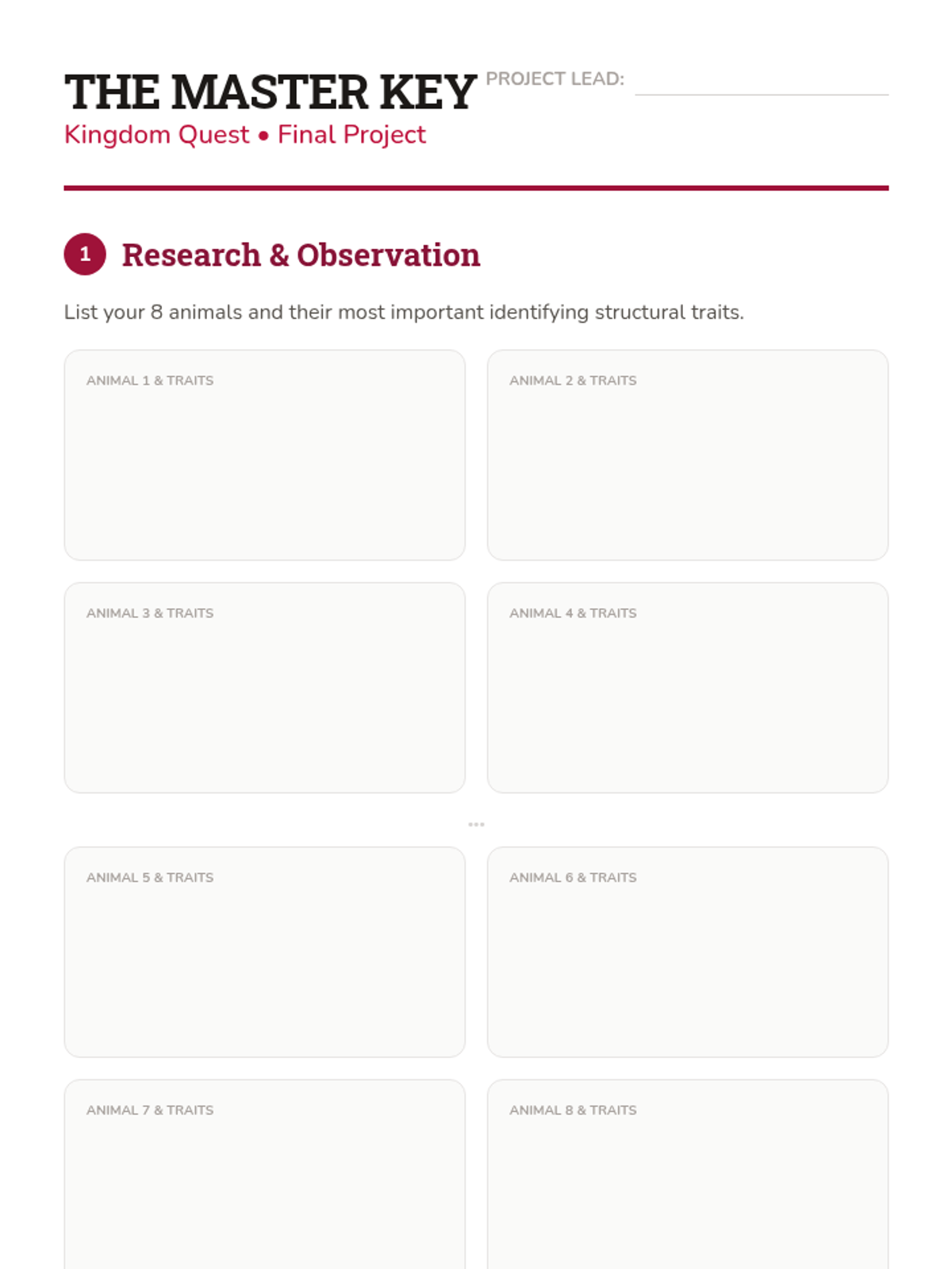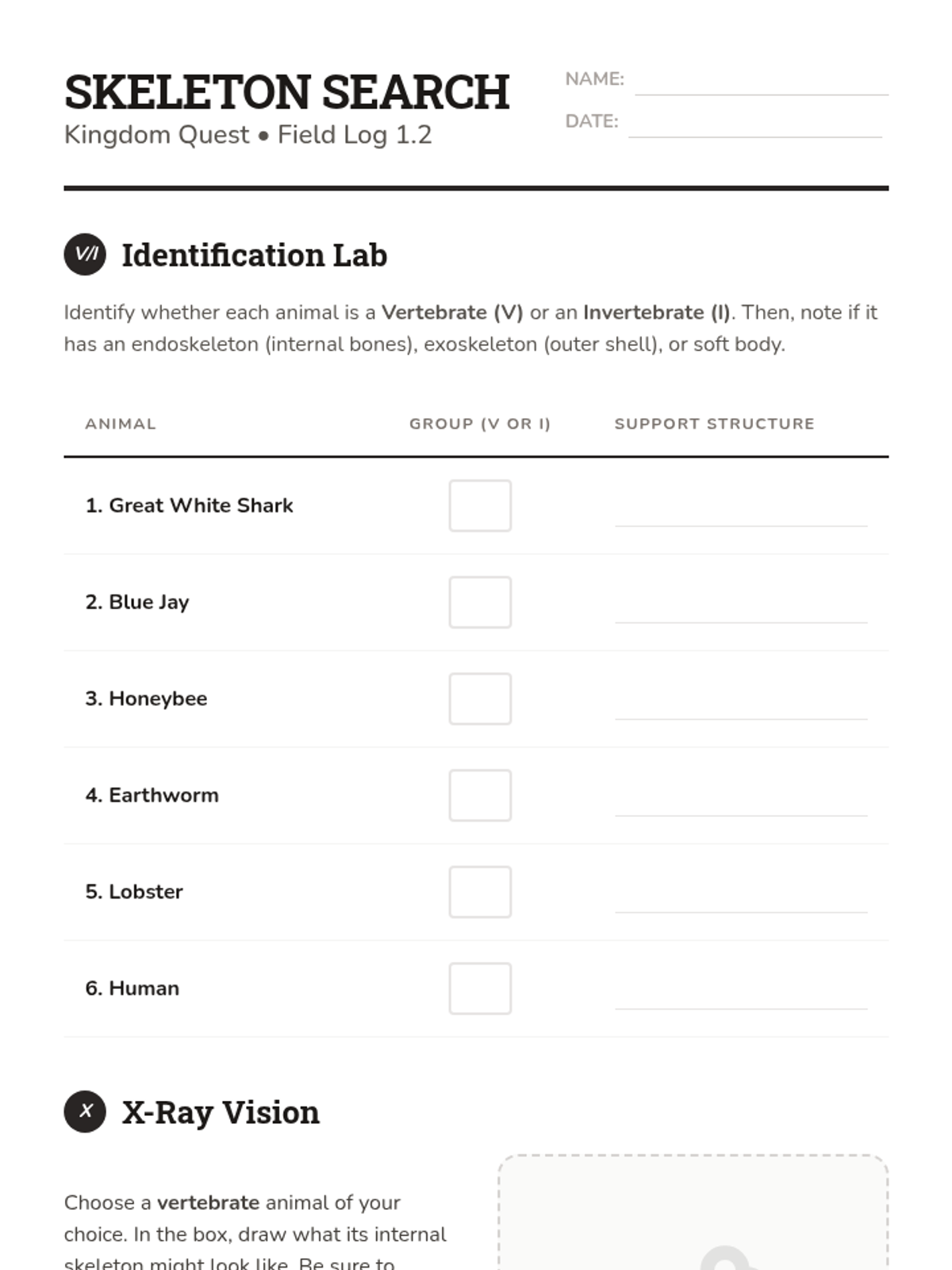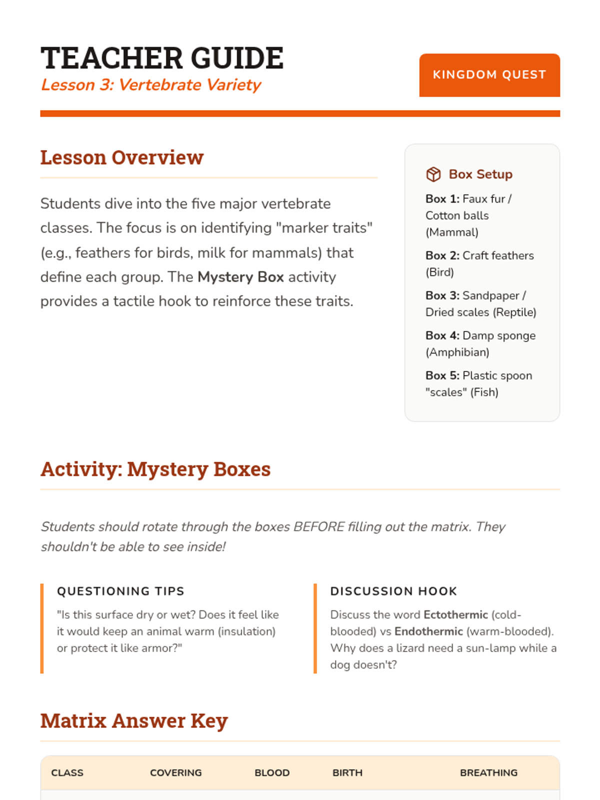 A comprehensive 5th-grade unit exploring the systematic organization of animals. Students progress from basic sorting to mastering dichotomous keys, focusing on the structural differences between vertebrates and invertebrates and the five major vertebrate groups.
