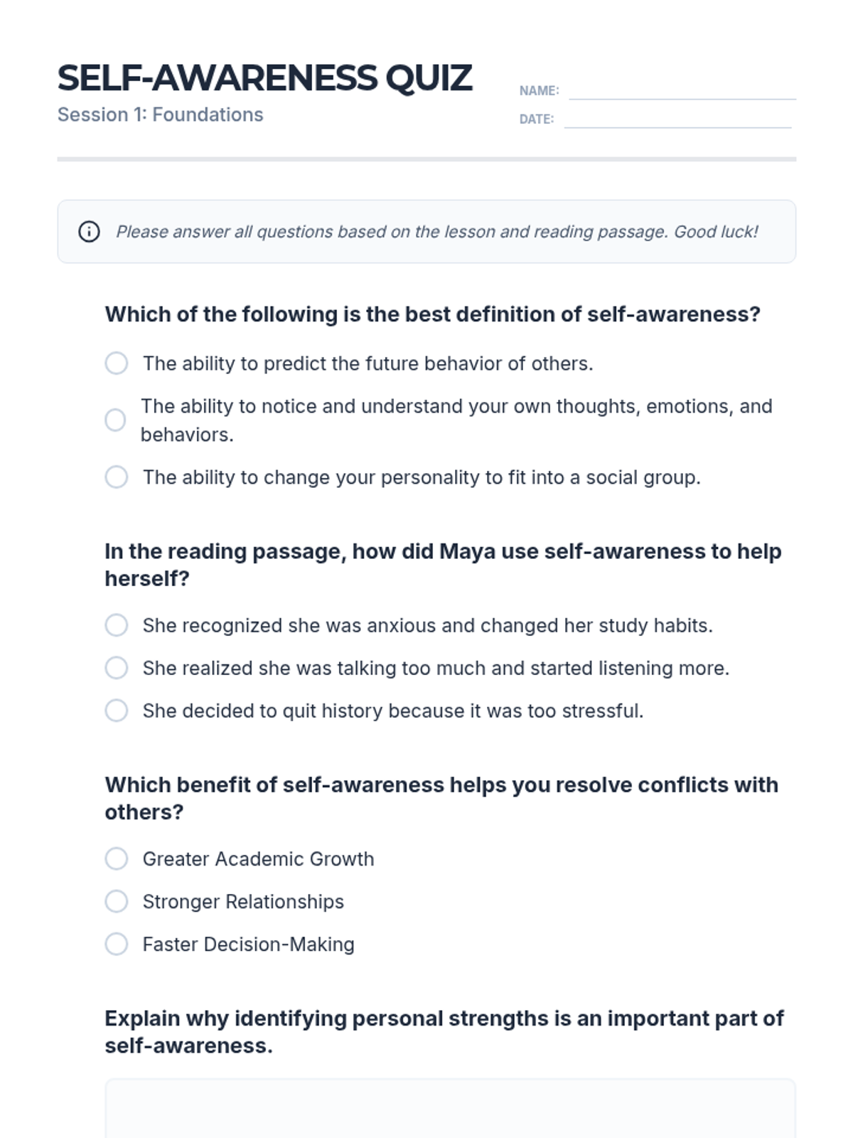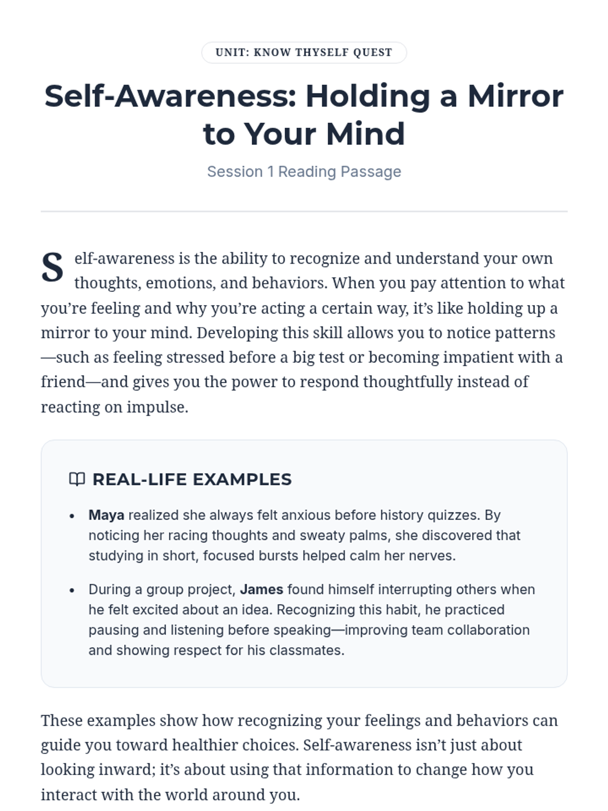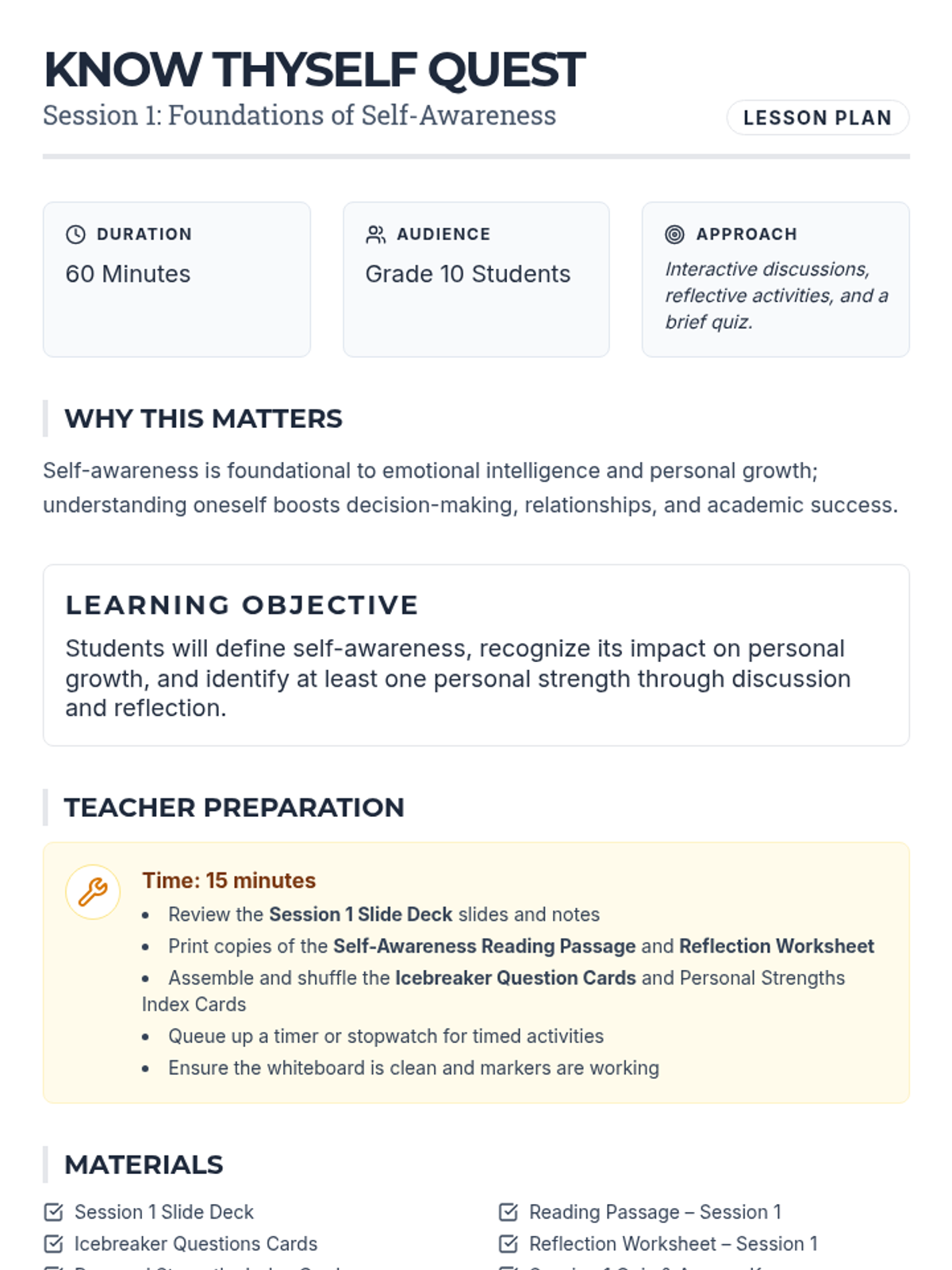 A 10-session self-awareness unit for Grade 10 students to explore personal strengths, values, and emotions through readings, discussions, activities, and reflections. This classroom-wide Tier 1 series builds essential life skills, culminating in a project and comprehensive assessment.