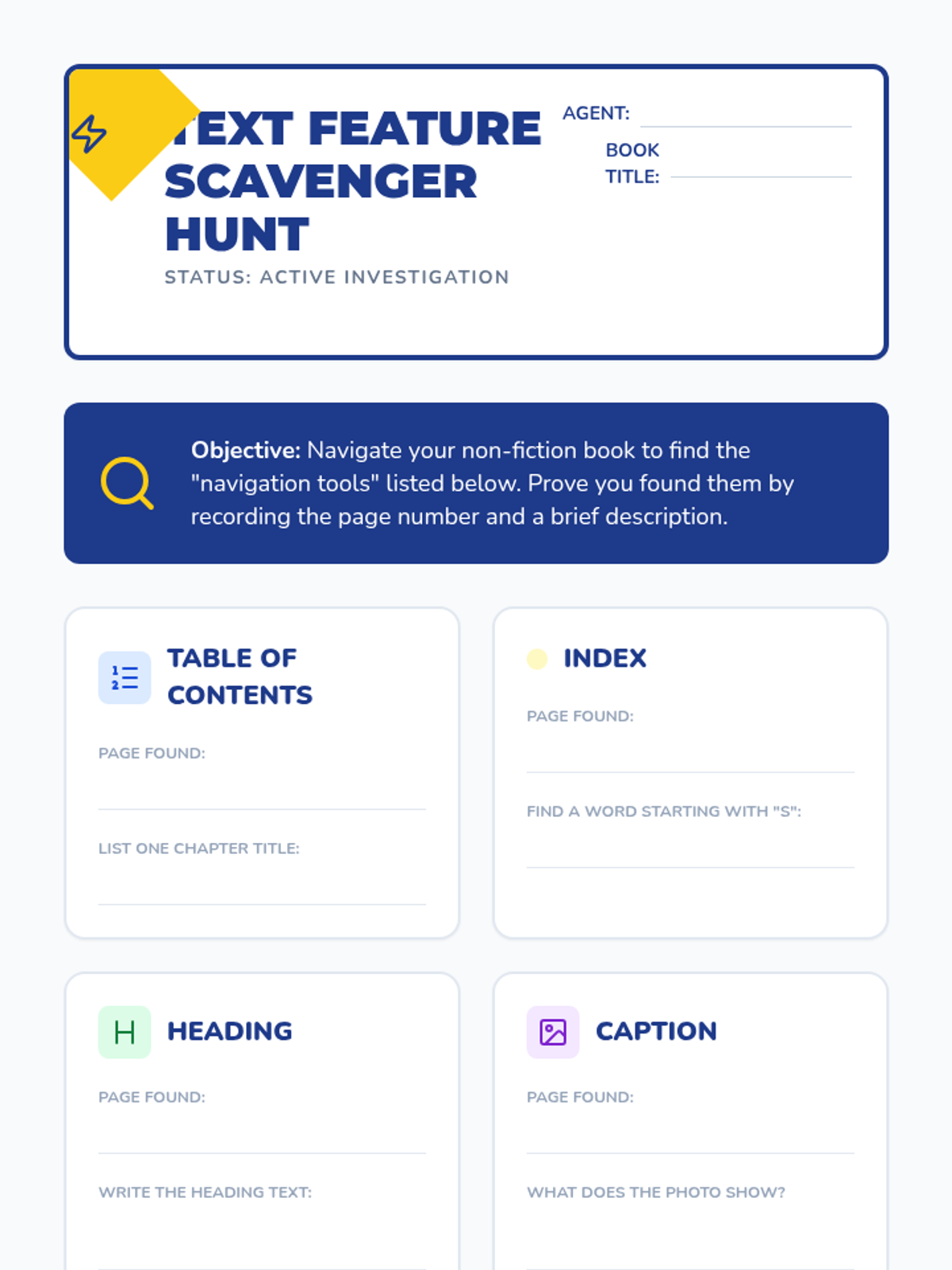A two-day investigation where students master the ability to distinguish between narrative and informational texts using specific text features and clues.