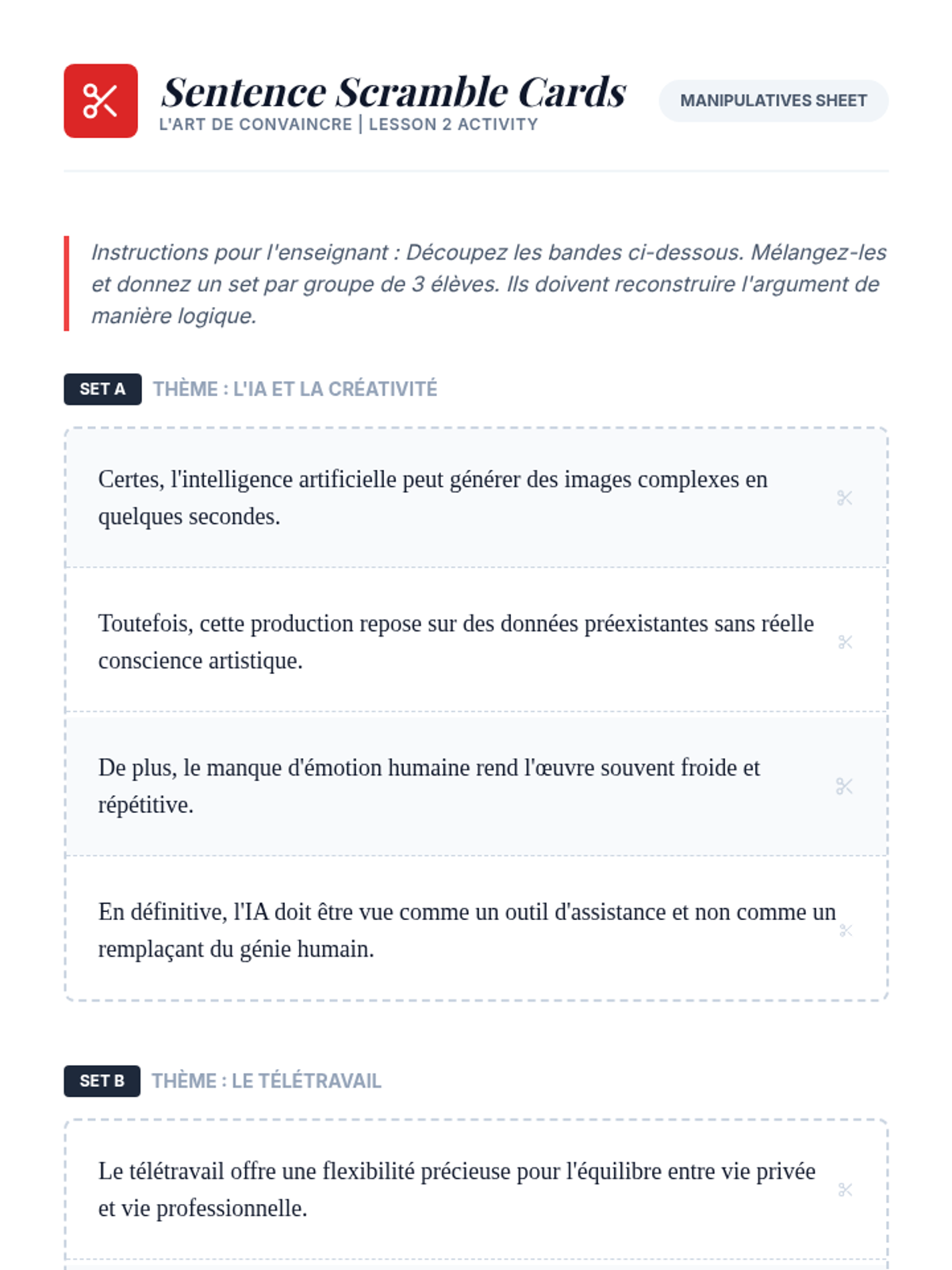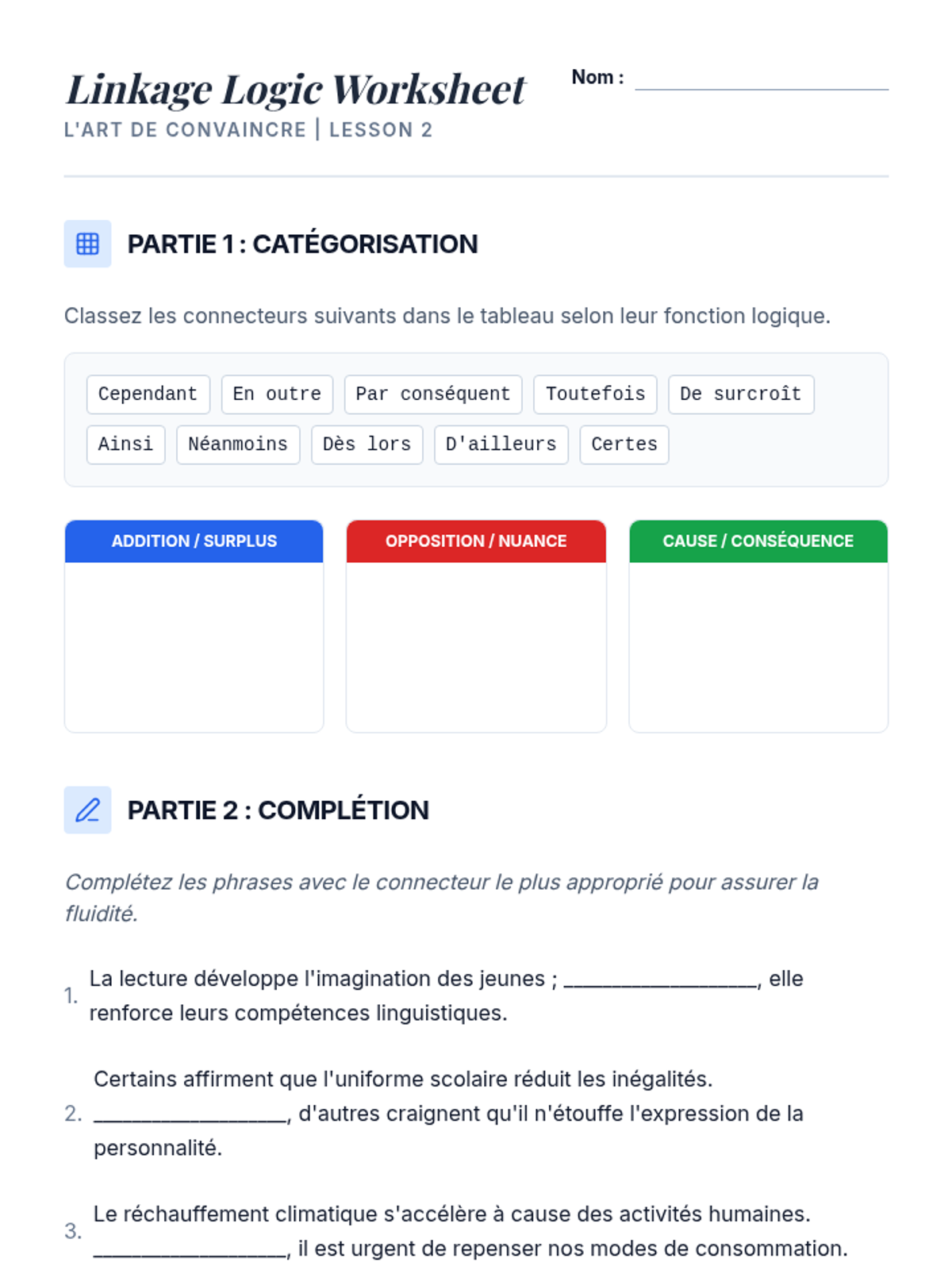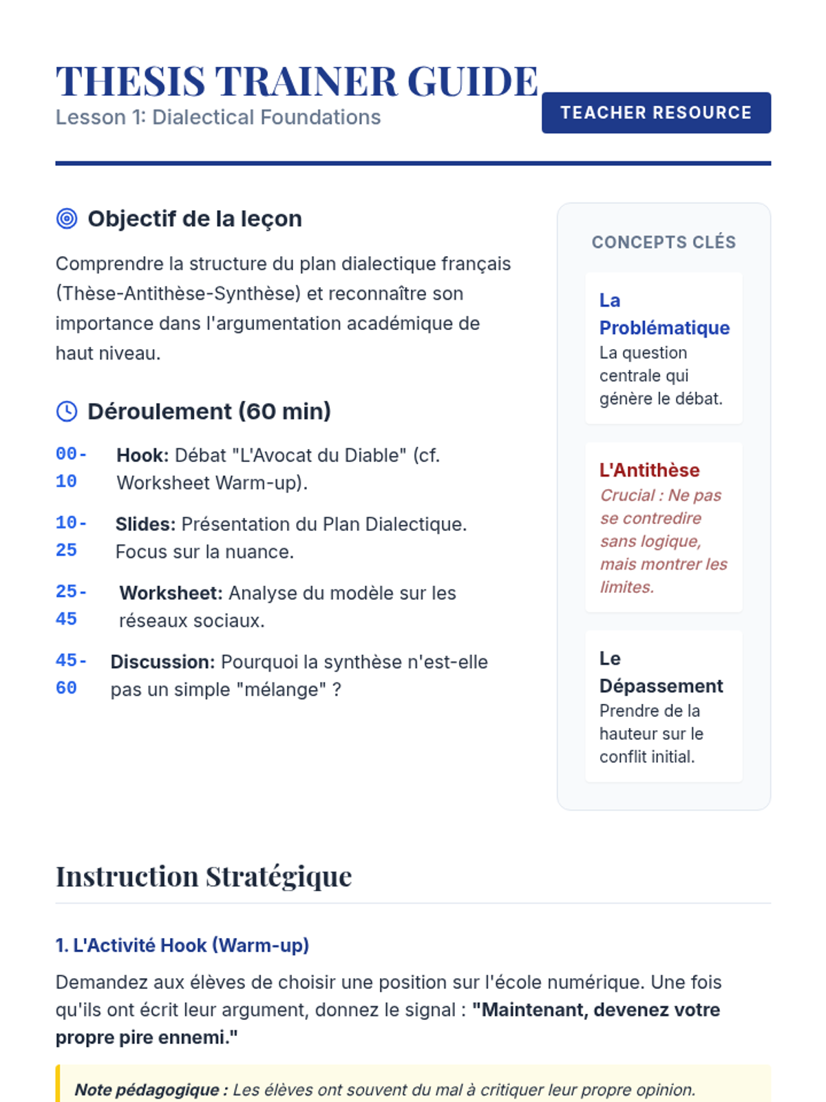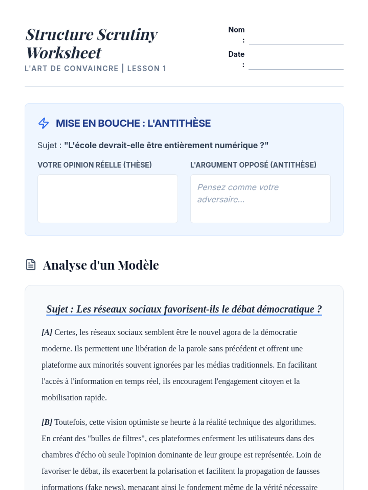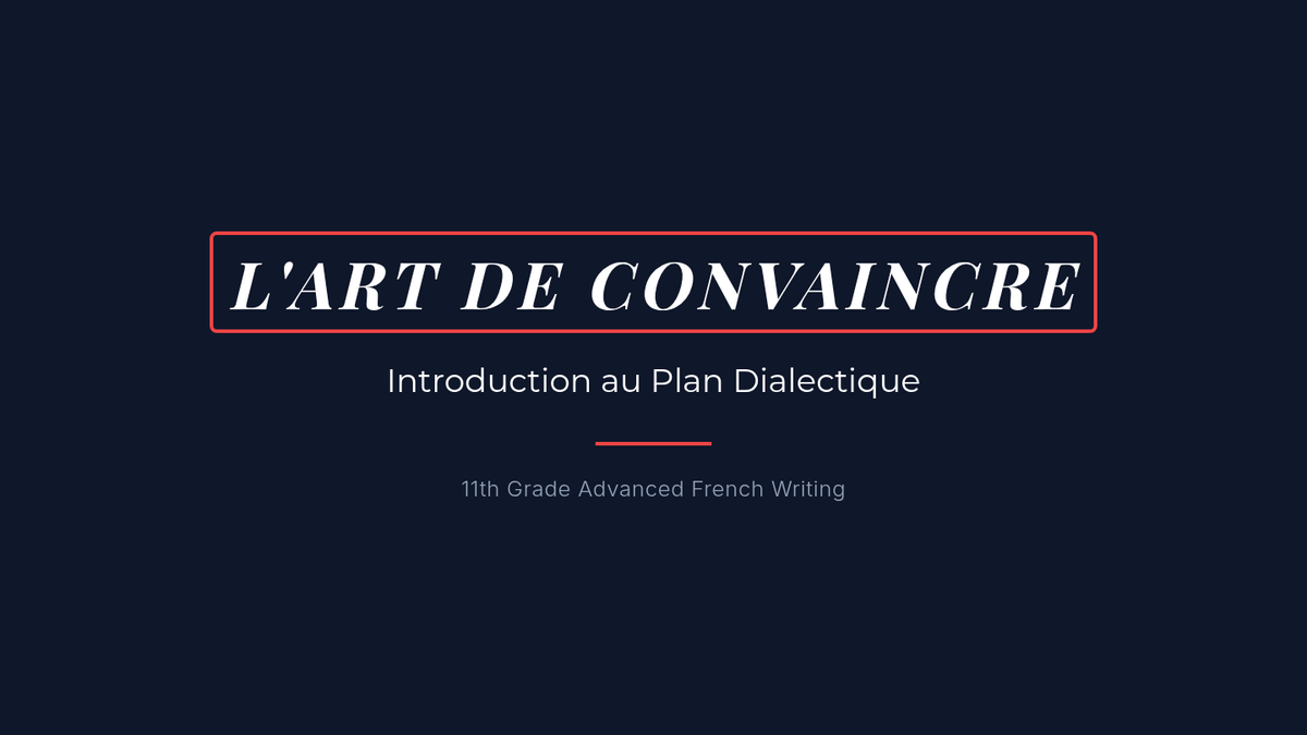 A comprehensive 11th-grade French writing sequence focusing on the 'plan dialectique' (thesis-antithesis-synthesis). Students master the structure, logic, and academic tone required for the French dissertation, culminating in a sophisticated argumentative essay.