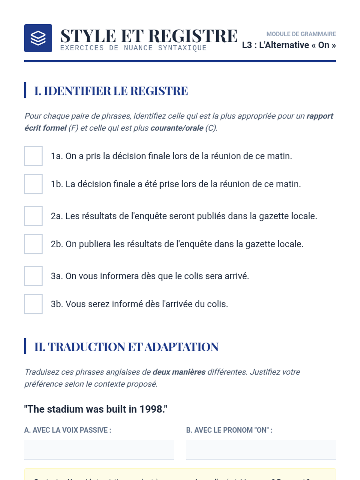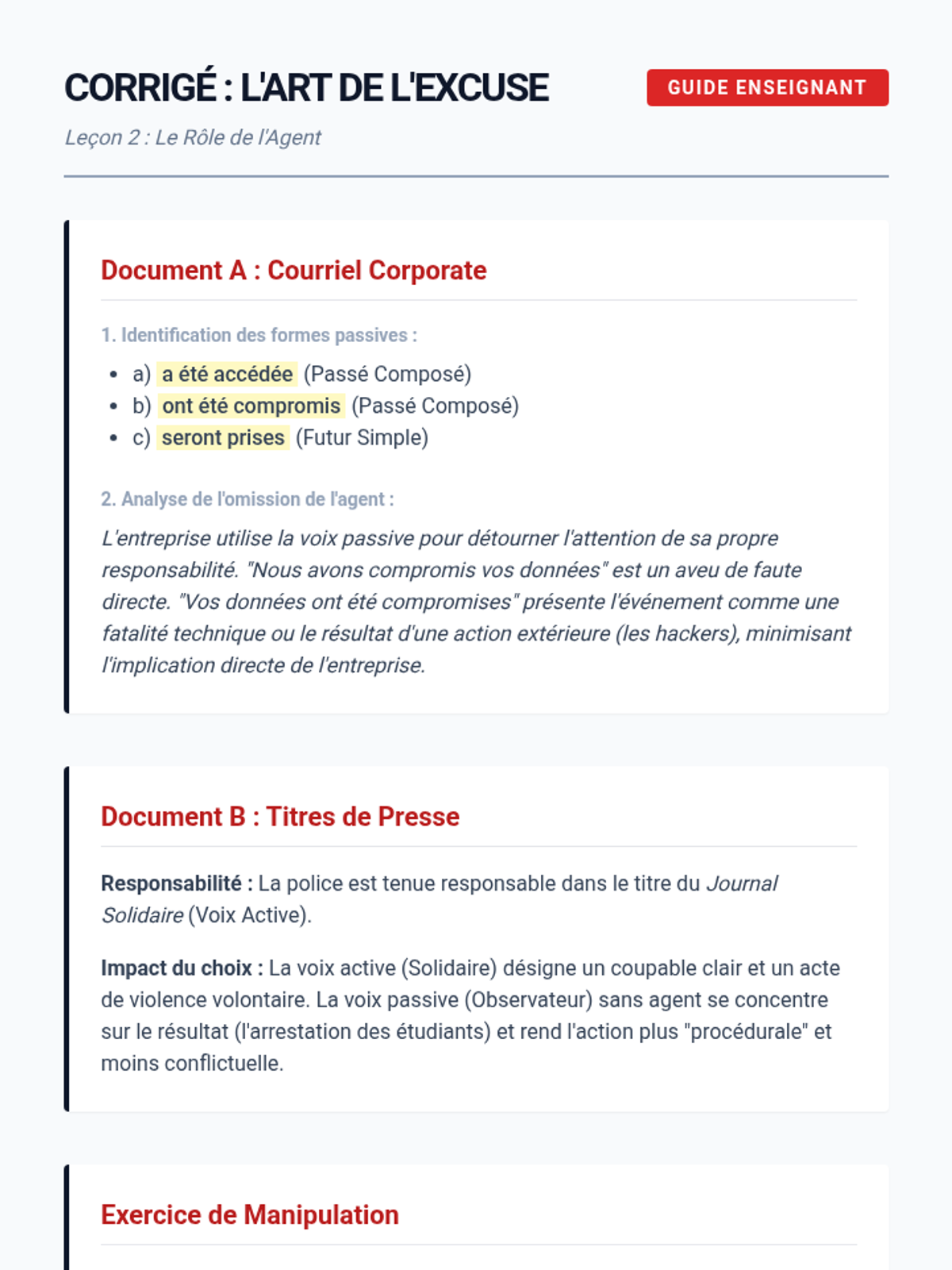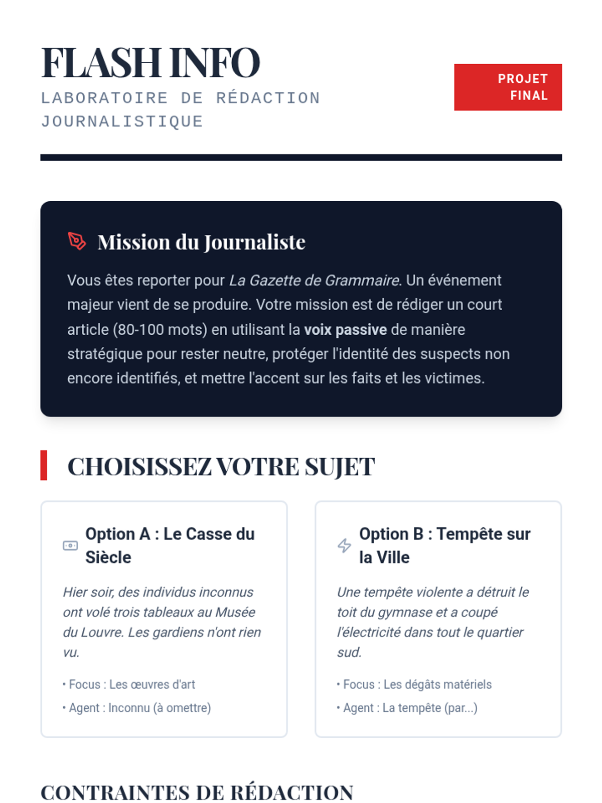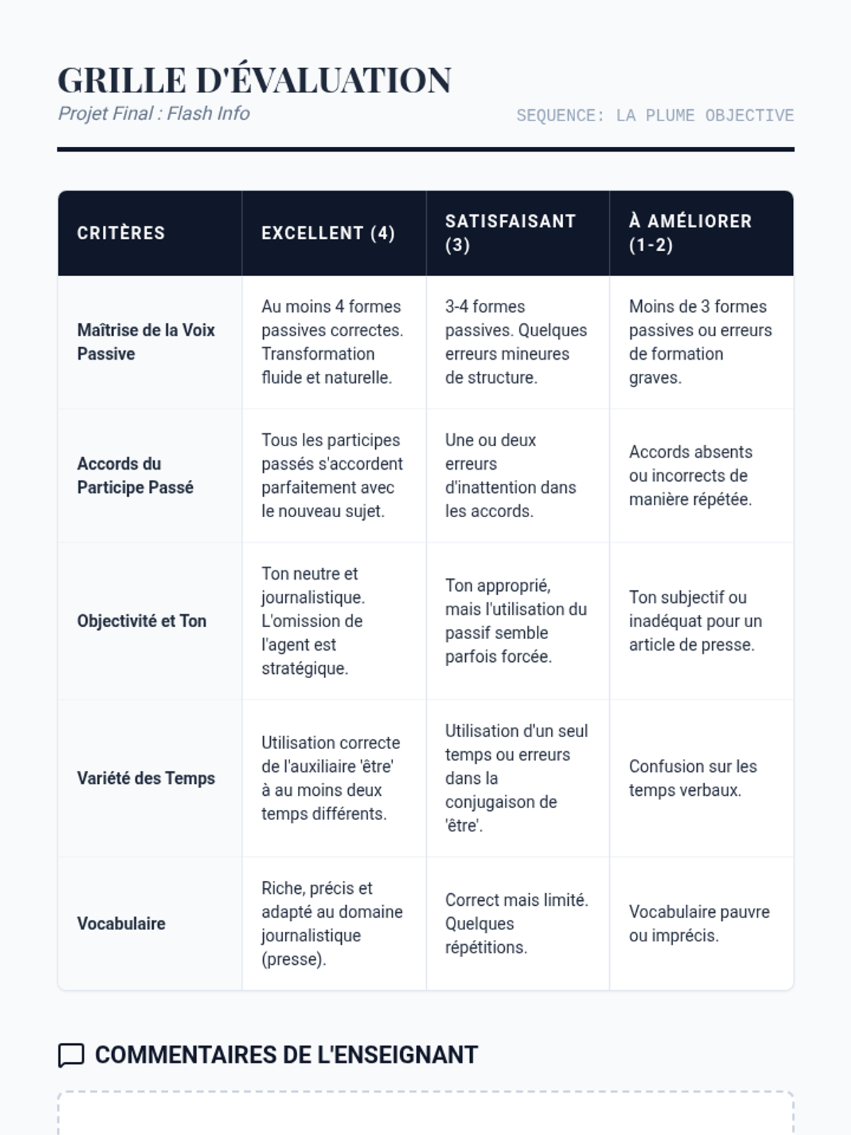 An advanced French grammar sequence for 11th graders focusing on the mechanics, usage, and rhetorical effects of the passive voice in journalistic contexts. Students transition from mechanical transformations to analyzing how the choice of voice affects agency and objectivity in news reporting.