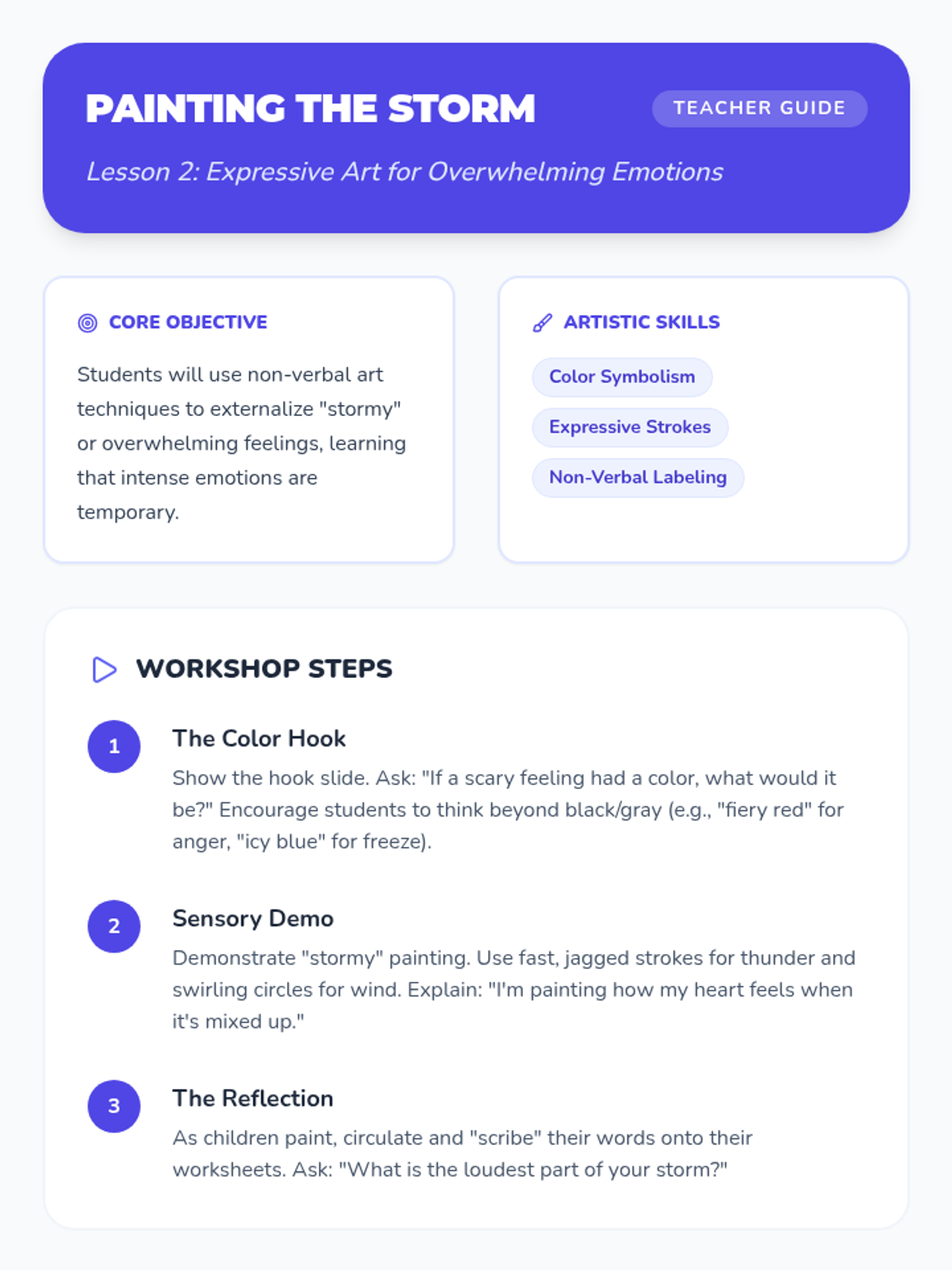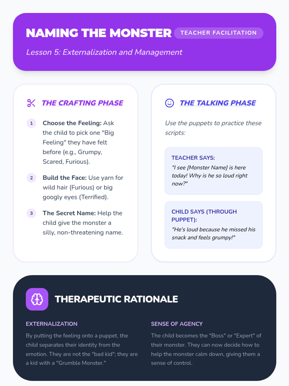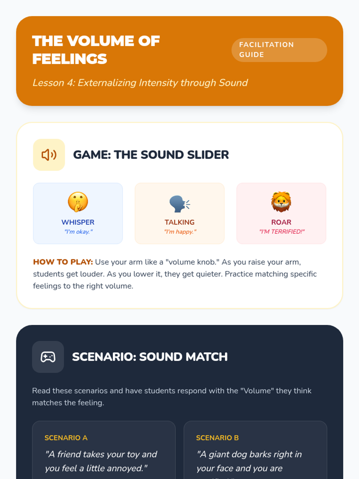 A sequence for Pre-K students to build emotional literacy regarding intense feelings, trauma responses, and distinguishing between 'little' and 'big' emotions through art, story, and play.