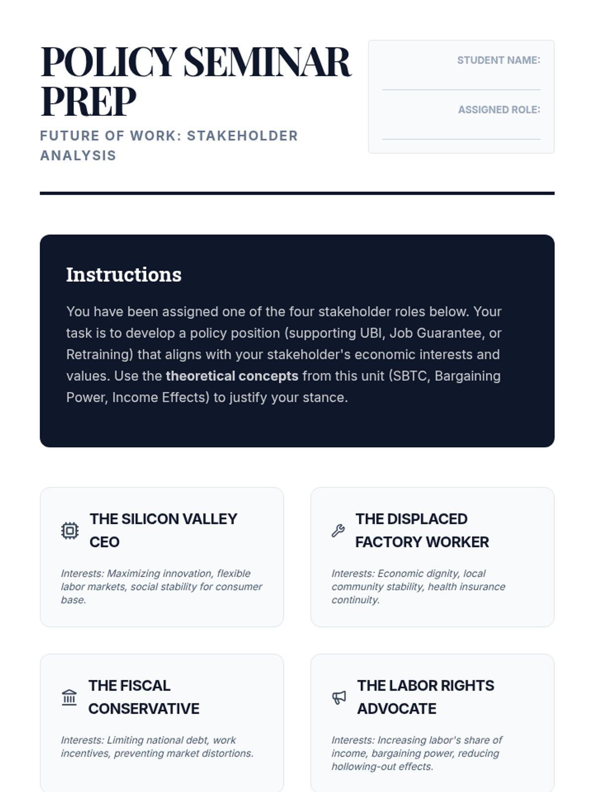 This sequence explores the institutional and technological forces reshaping the modern workforce, from the impact of unions to the rise of automation and AI. Students analyze economic models of bargaining, investigate labor market polarization, and debate policy responses like Universal Basic Income and job guarantees.