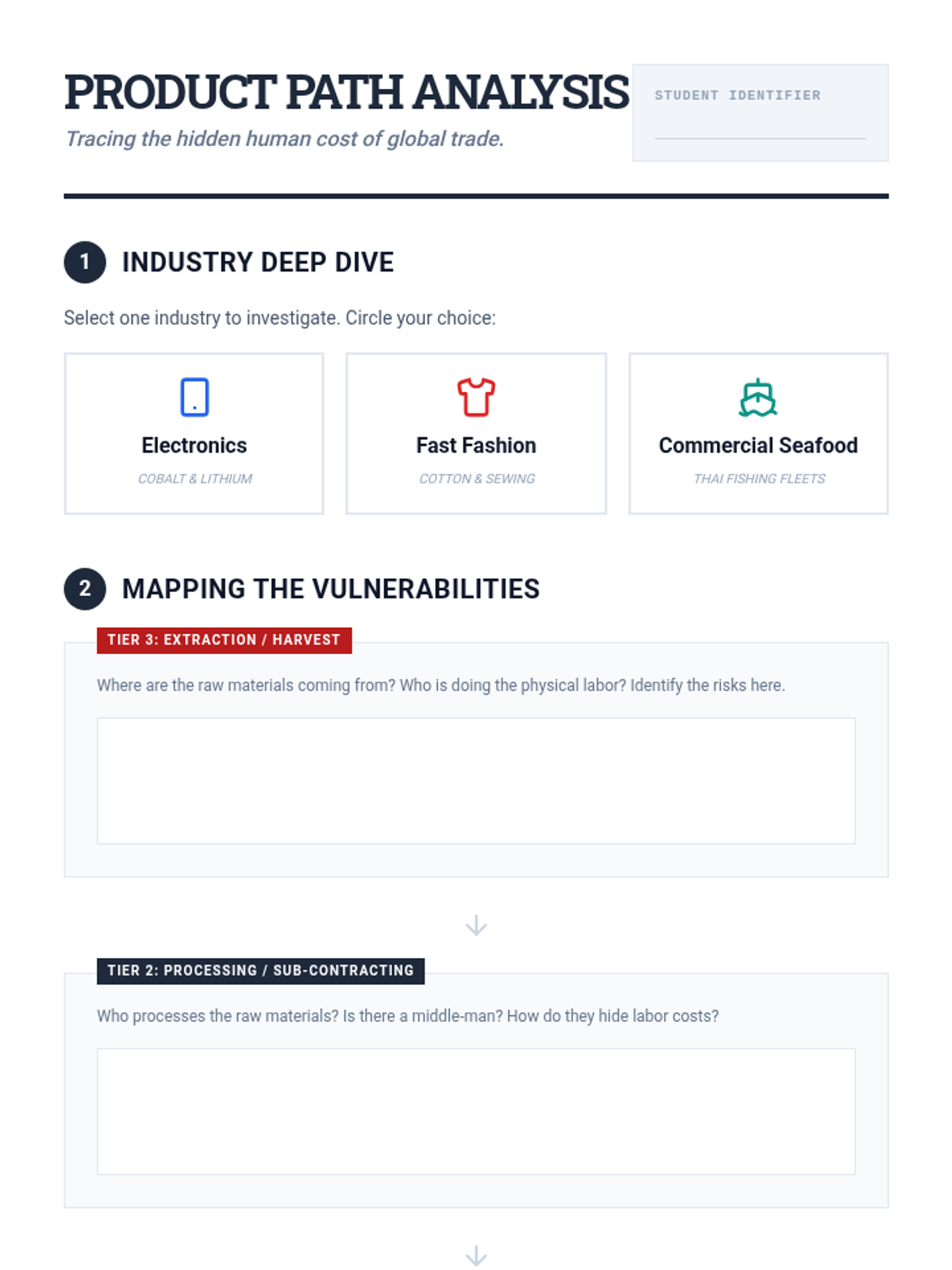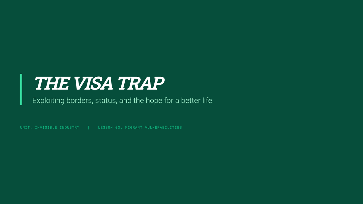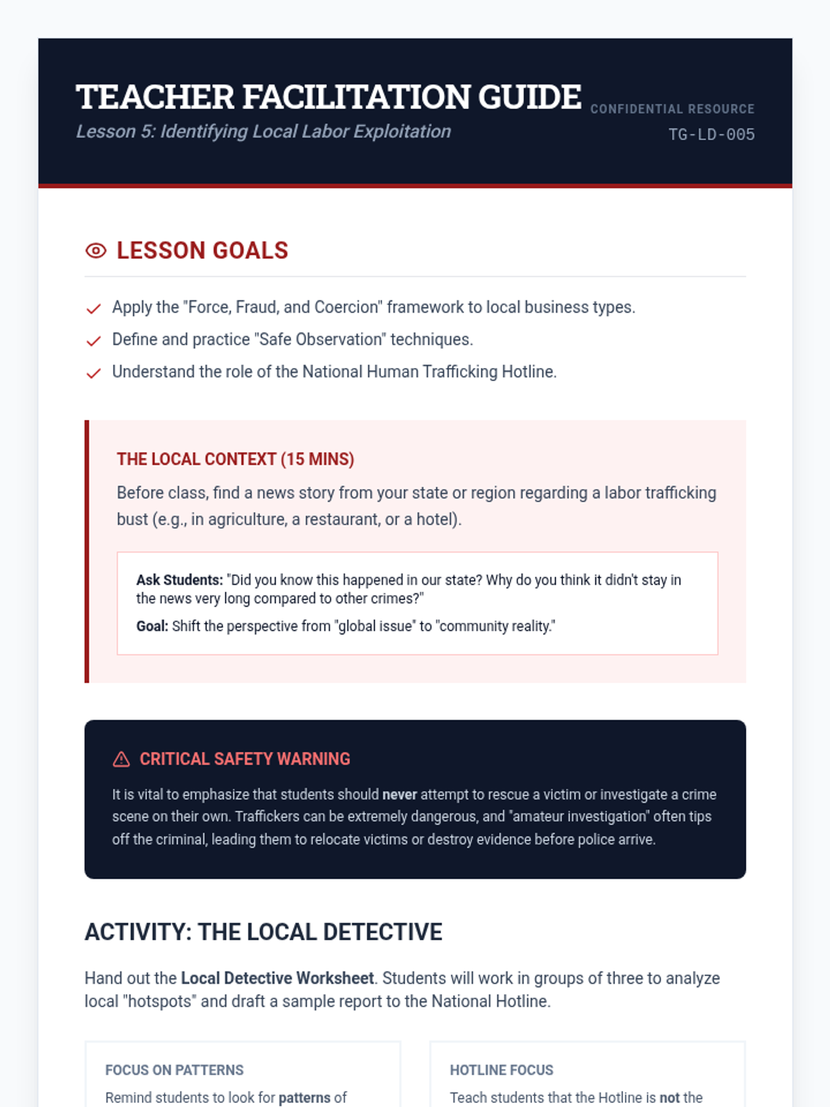 A comprehensive sequence for 11th-grade students focusing on labor trafficking and economic exploitation. Students will learn to identify indicators of forced labor, analyze global supply chains, understand the vulnerabilities of migrant workers, and recognize signs of exploitation in their own communities.